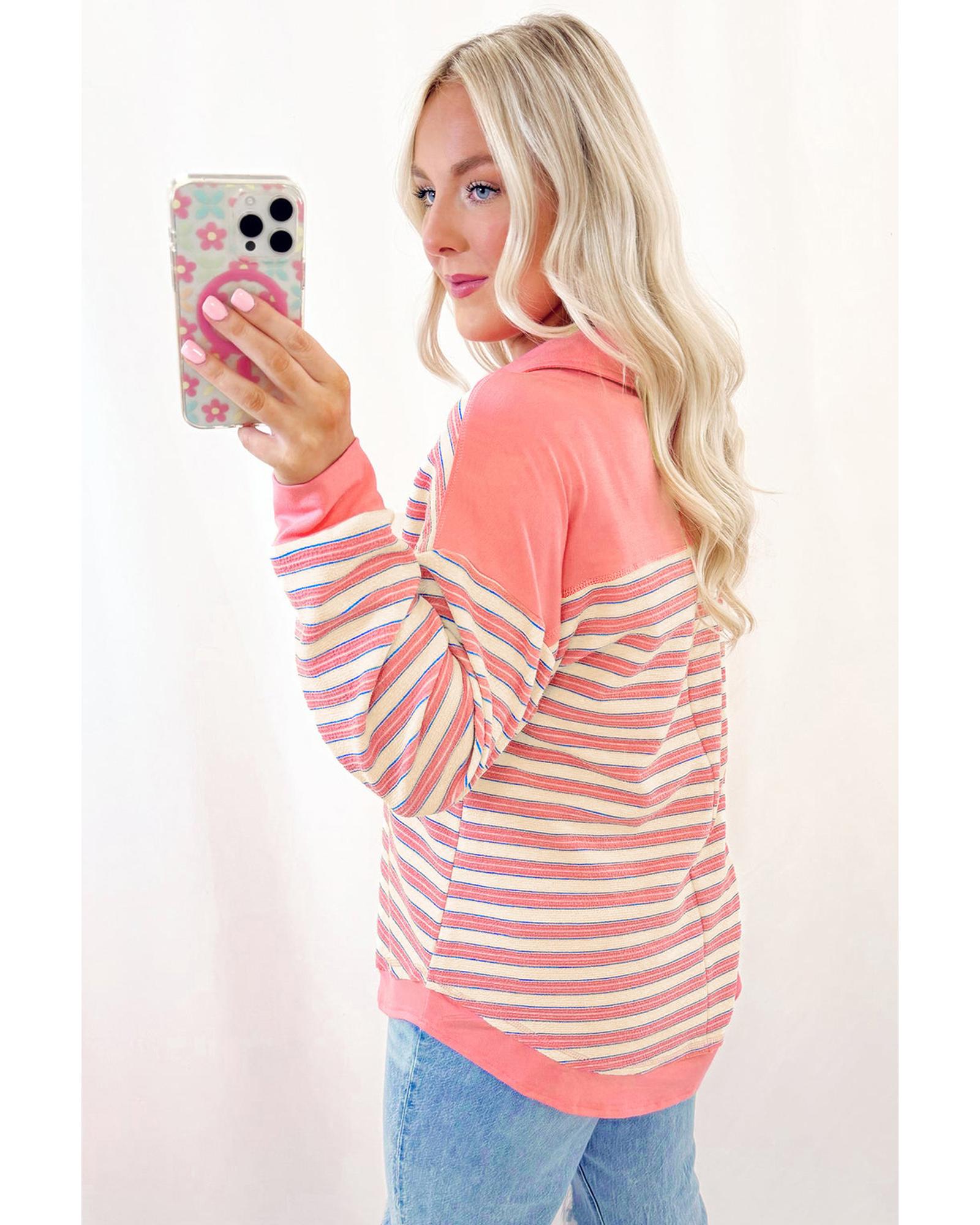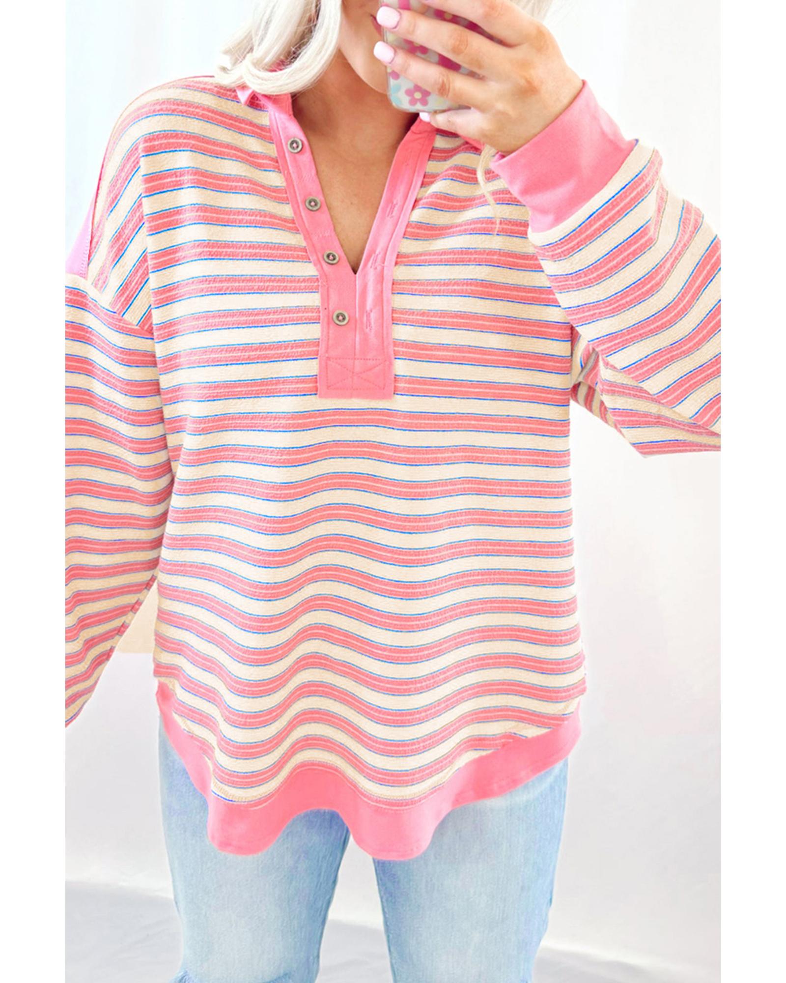 Pink Stripe Buttoned V Neck Collared Drop Shoulder Top – M