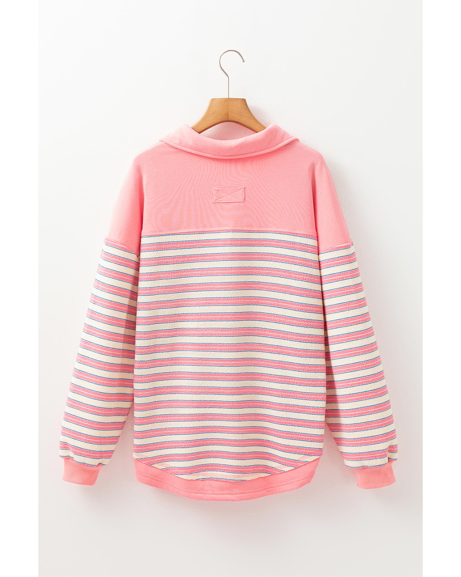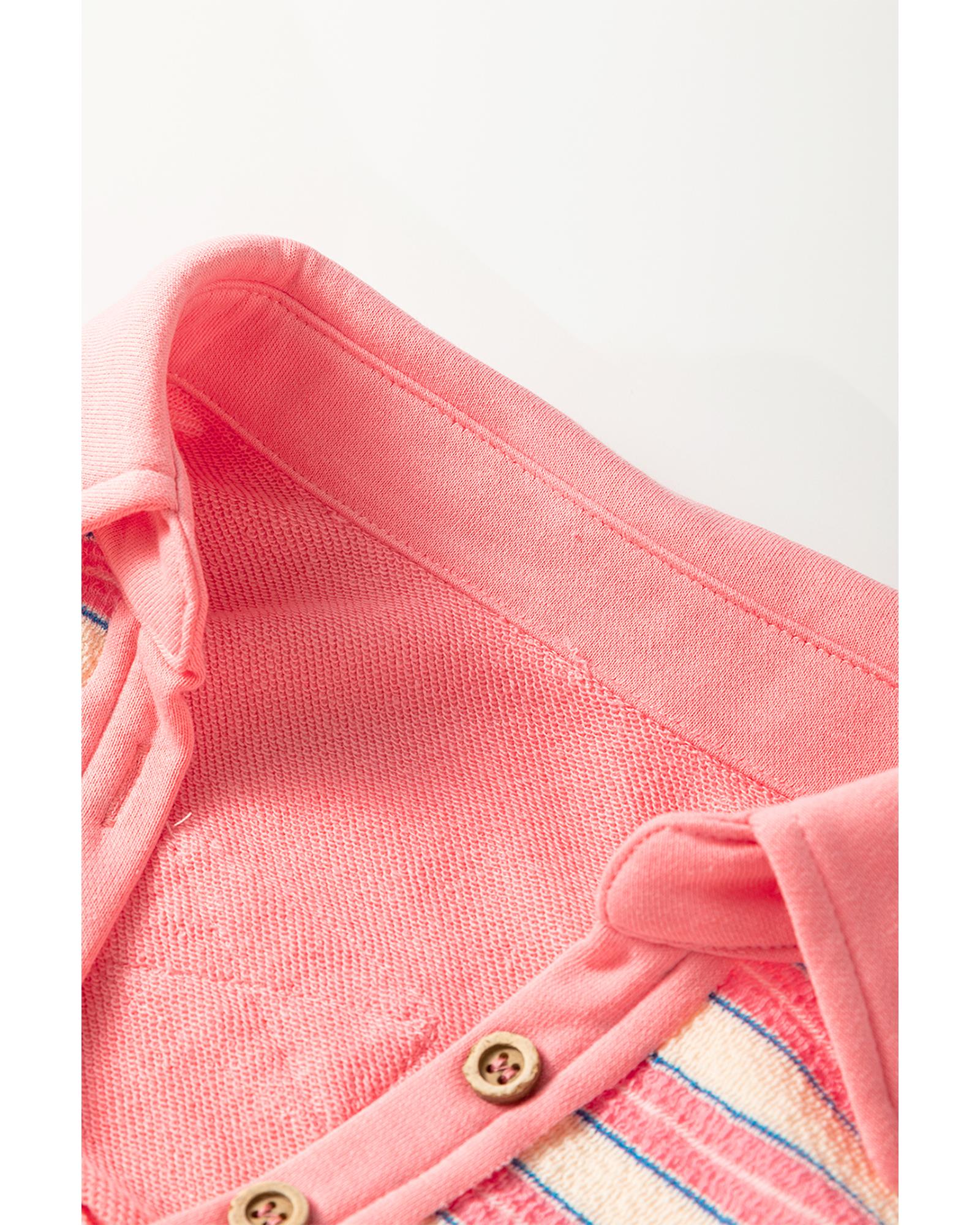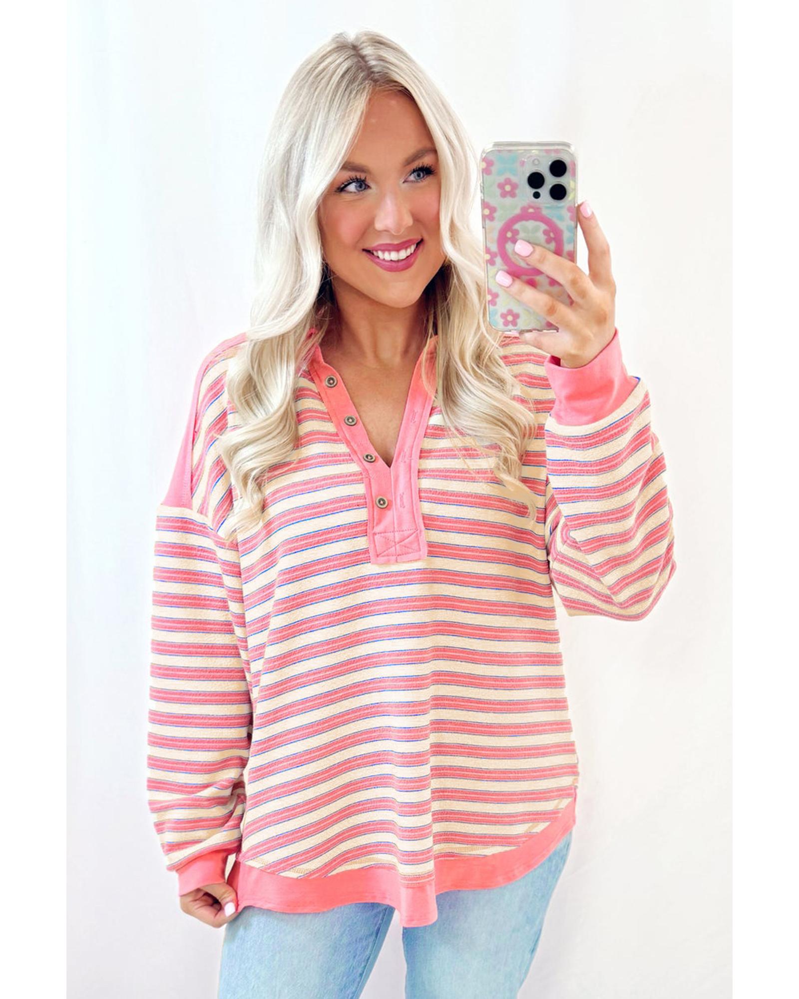 Pink Stripe Buttoned V Neck Collared Drop Shoulder Top – XL