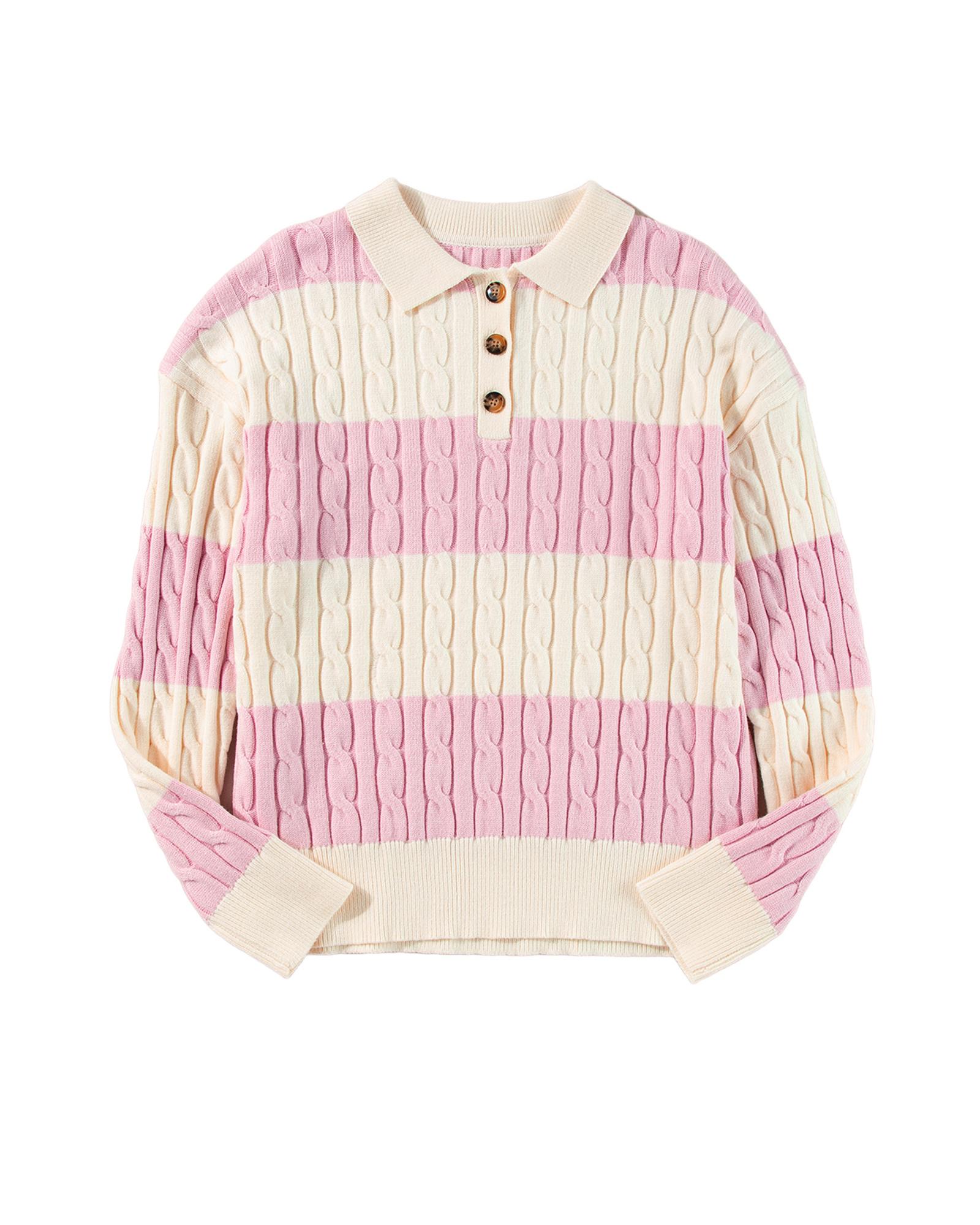 Pink Stripe Cable Knit Collared Henley Sweater – XL