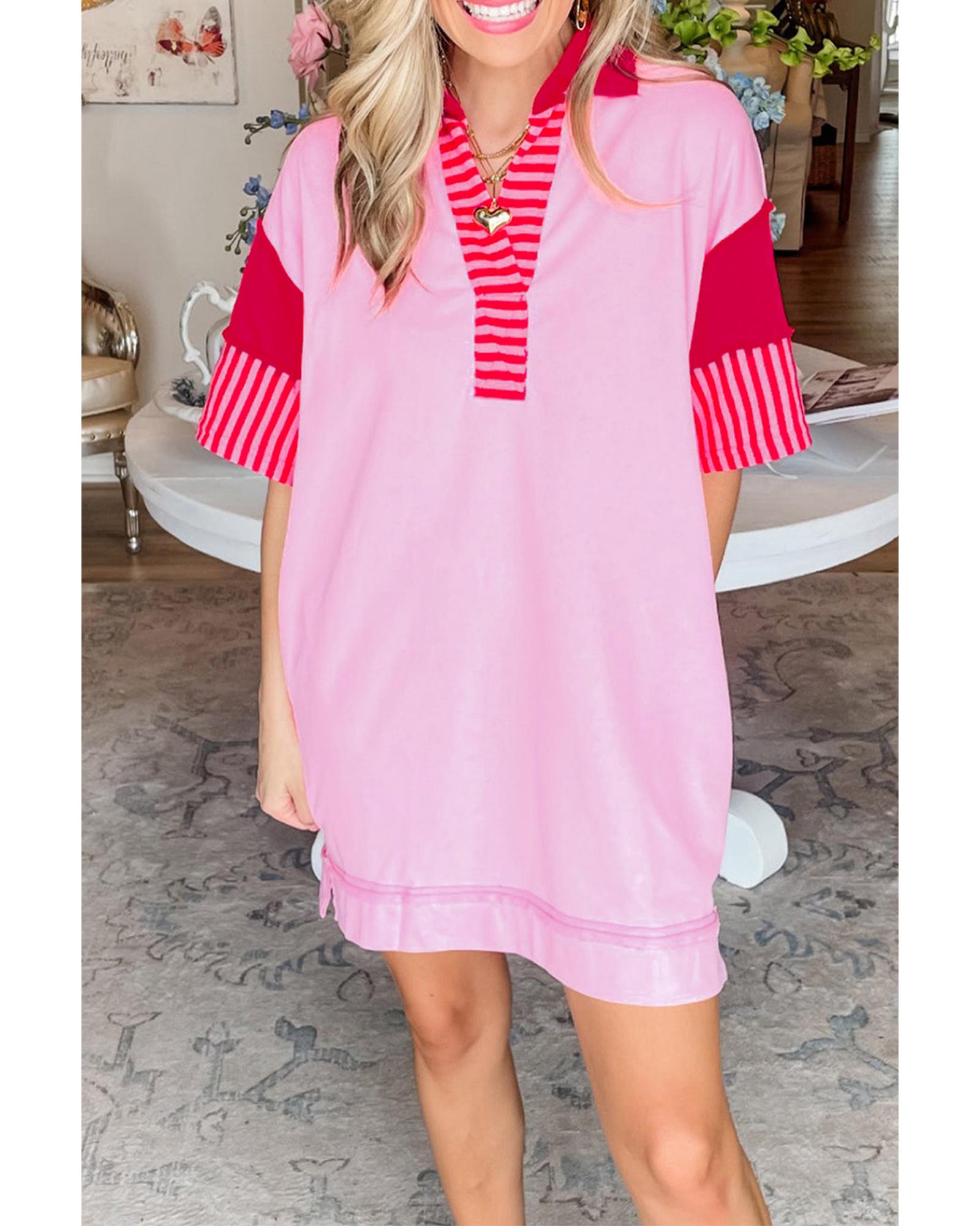 - Pink Stripe Colorblock Patchwork Short Sleeve T Shirt Dress