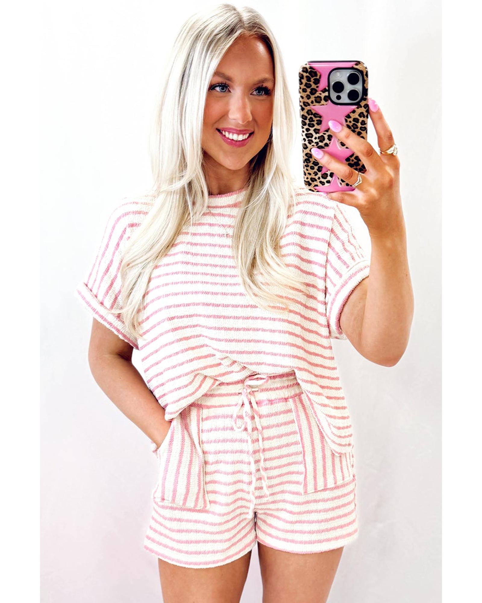 Pink Stripe Knitted Short Sleeve Top and Drawstring Shorts Set – L
