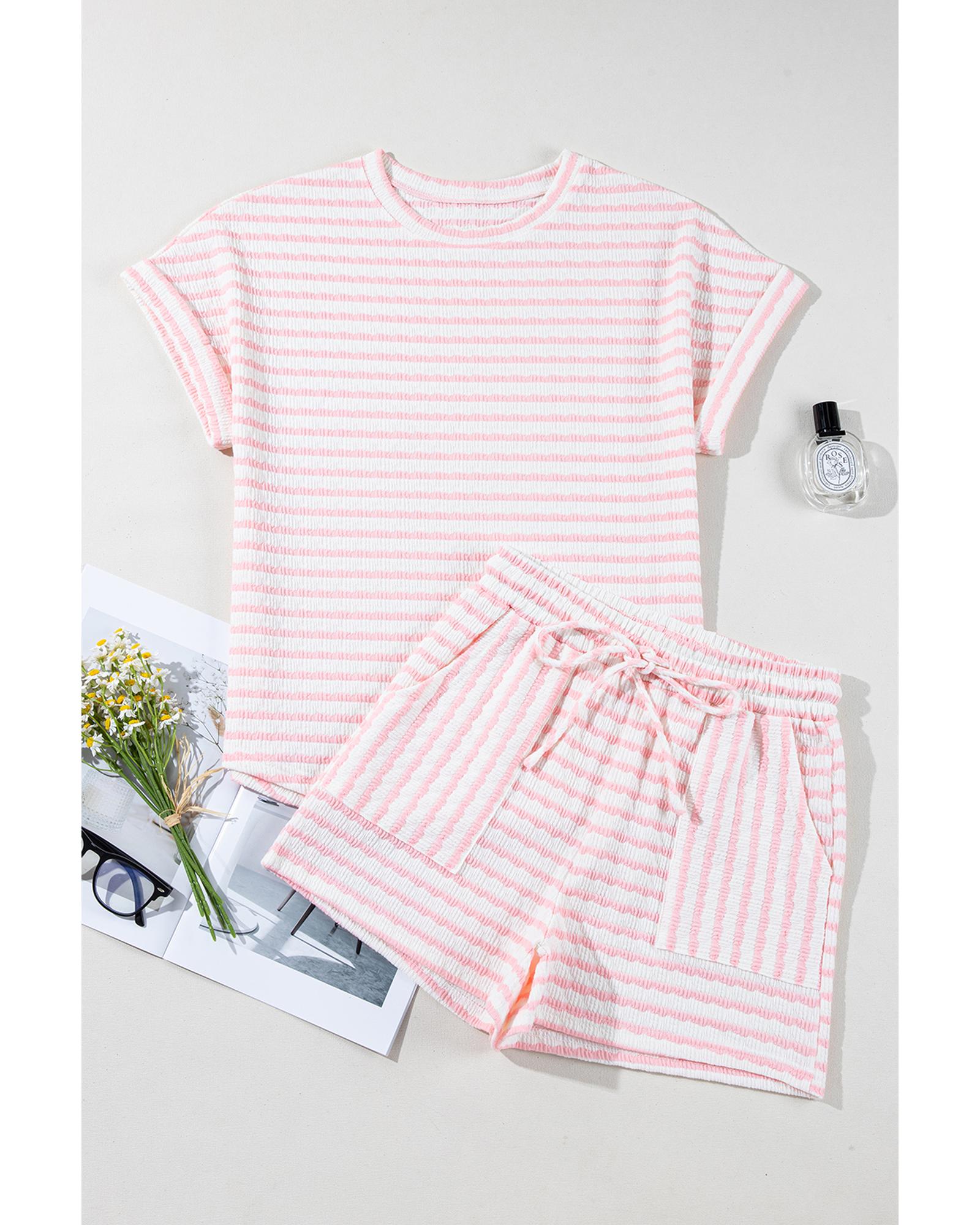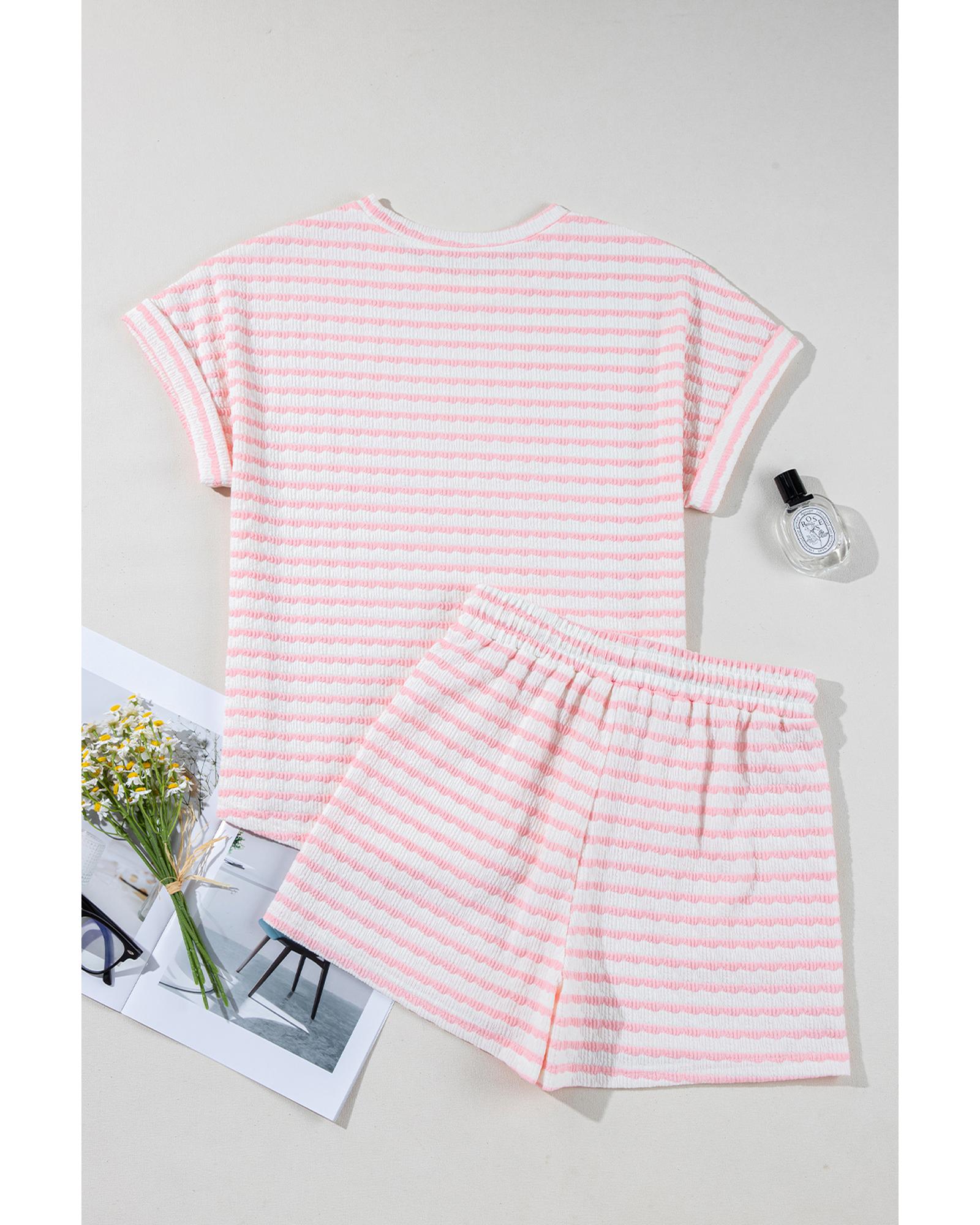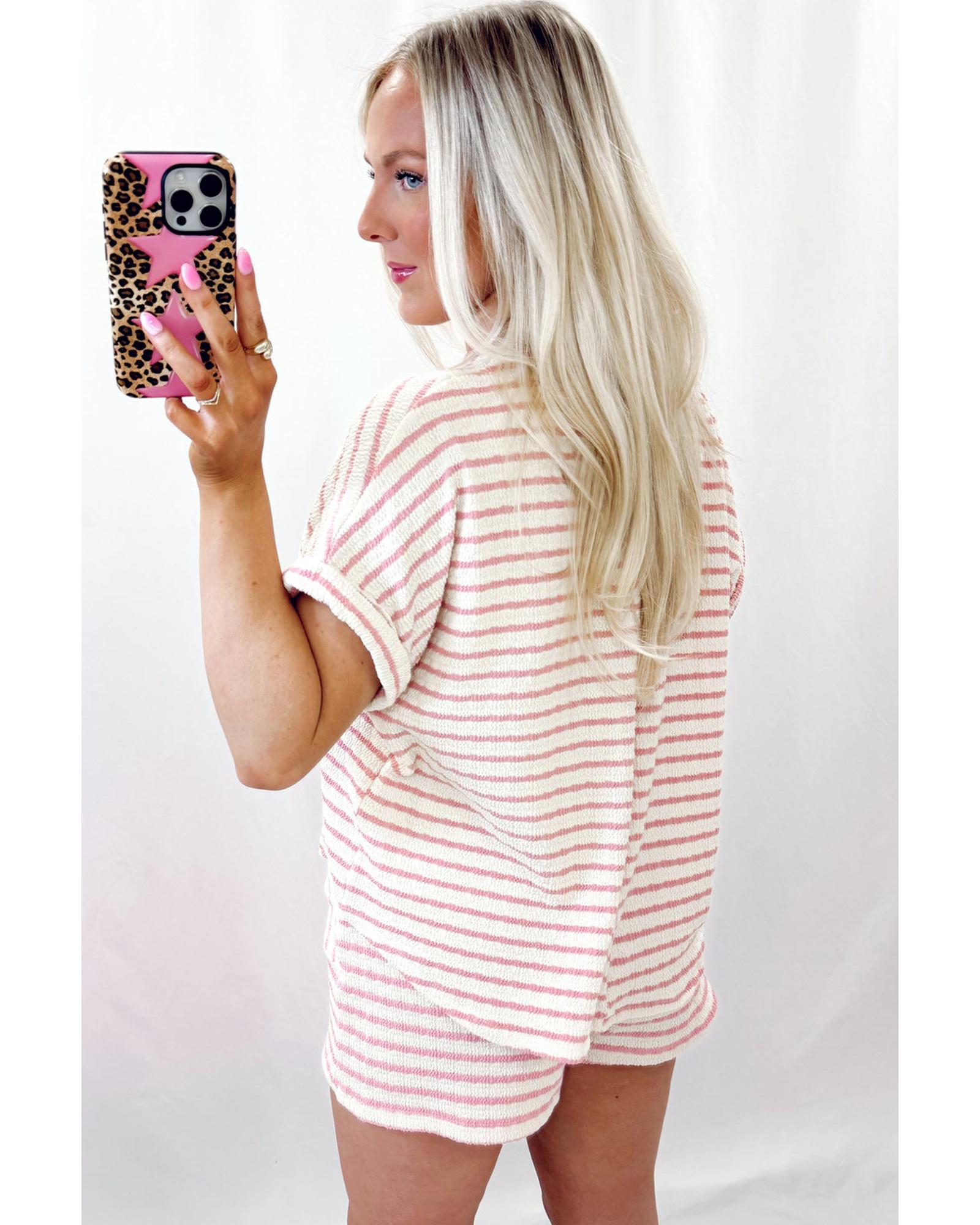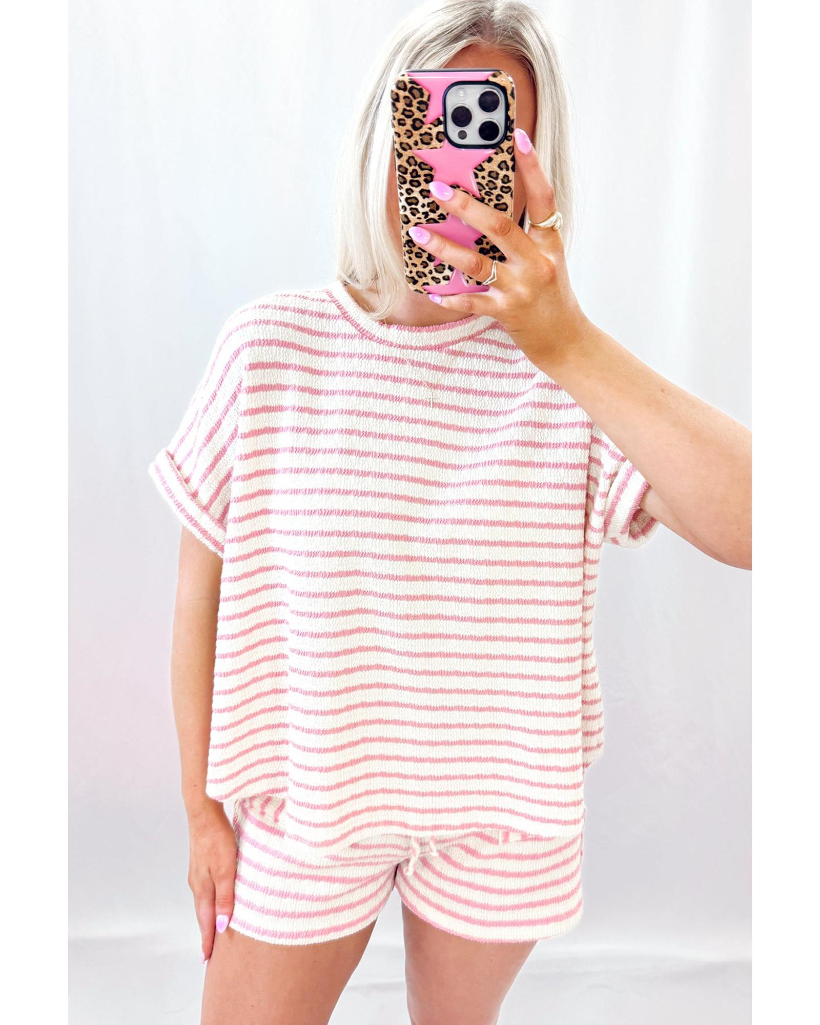 Pink Stripe Knitted Short Sleeve Top and Drawstring Shorts Set – M