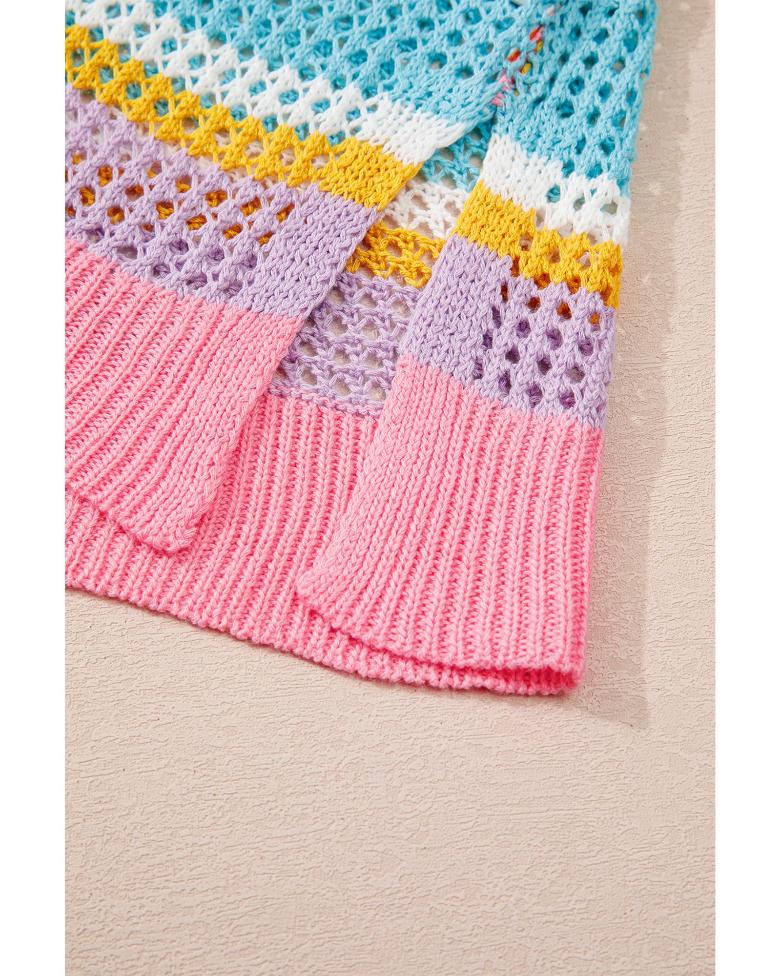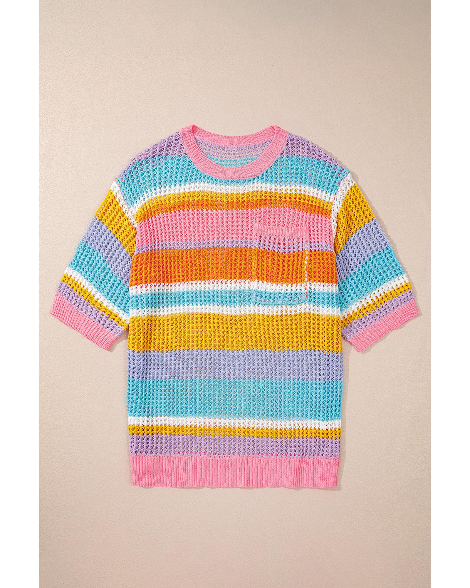 Pink Stripe Plus Size Open Knit Patch Pocket Short Sleeve Sweater – 1X