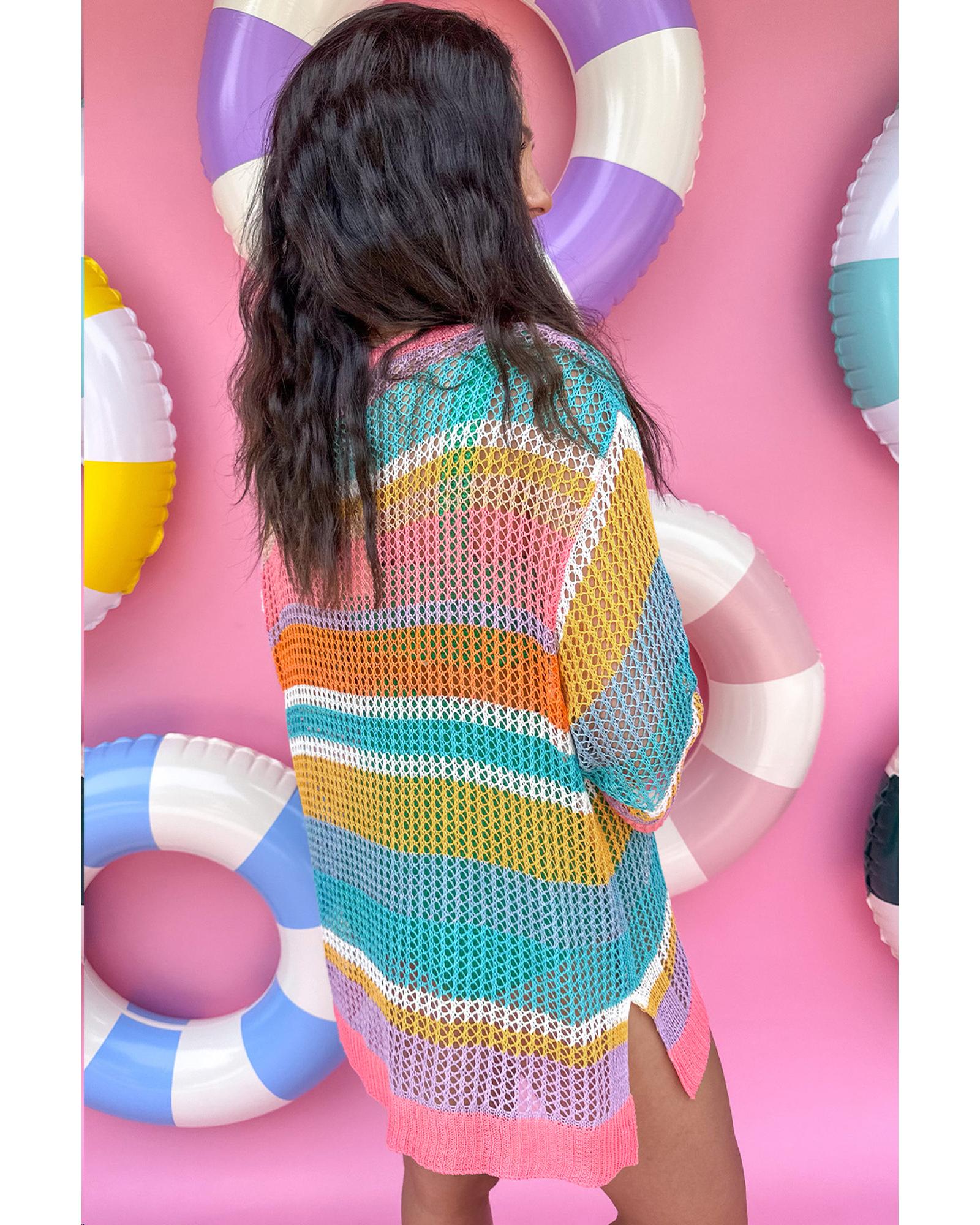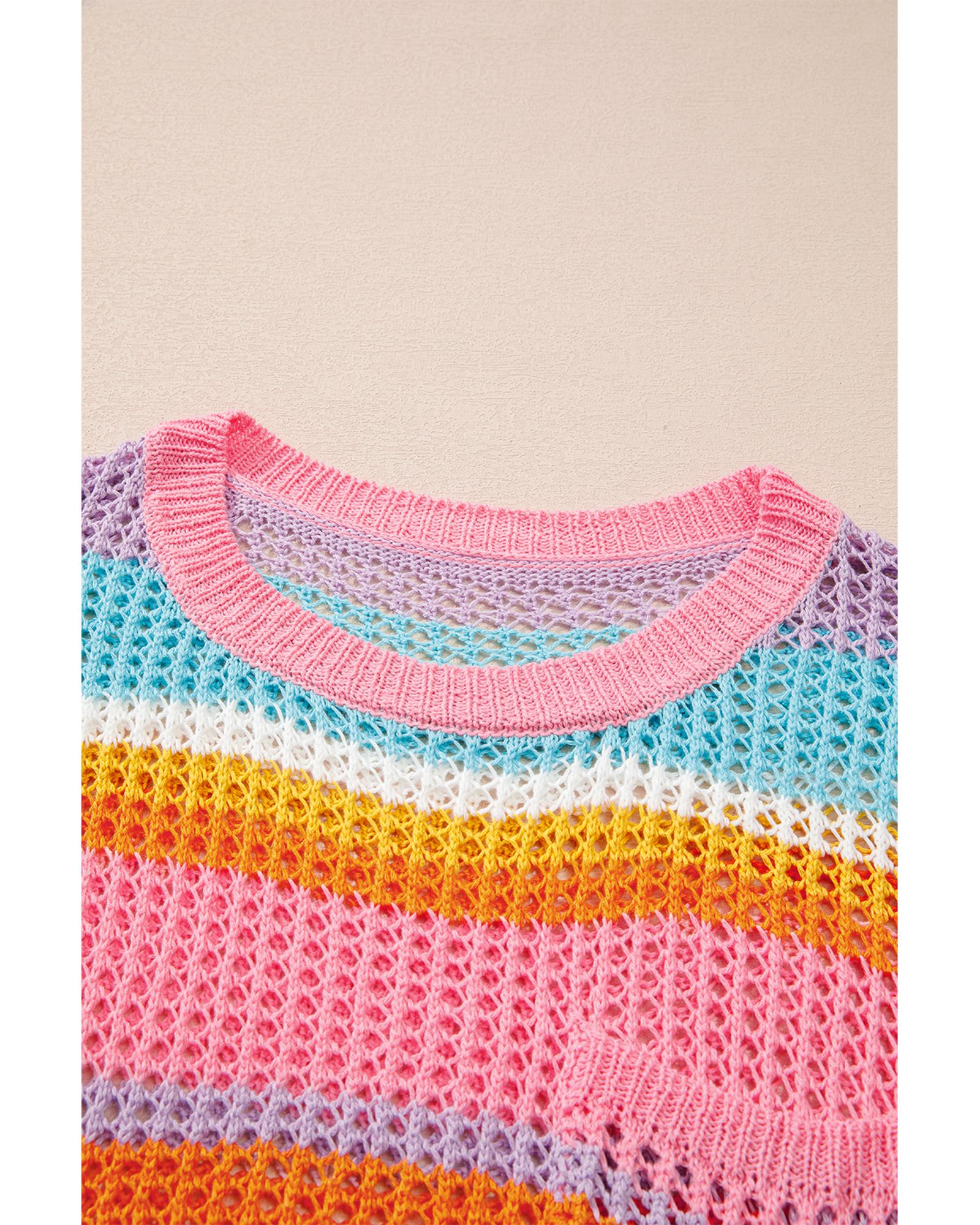 Pink Stripe Plus Size Open Knit Patch Pocket Short Sleeve Sweater – 4X