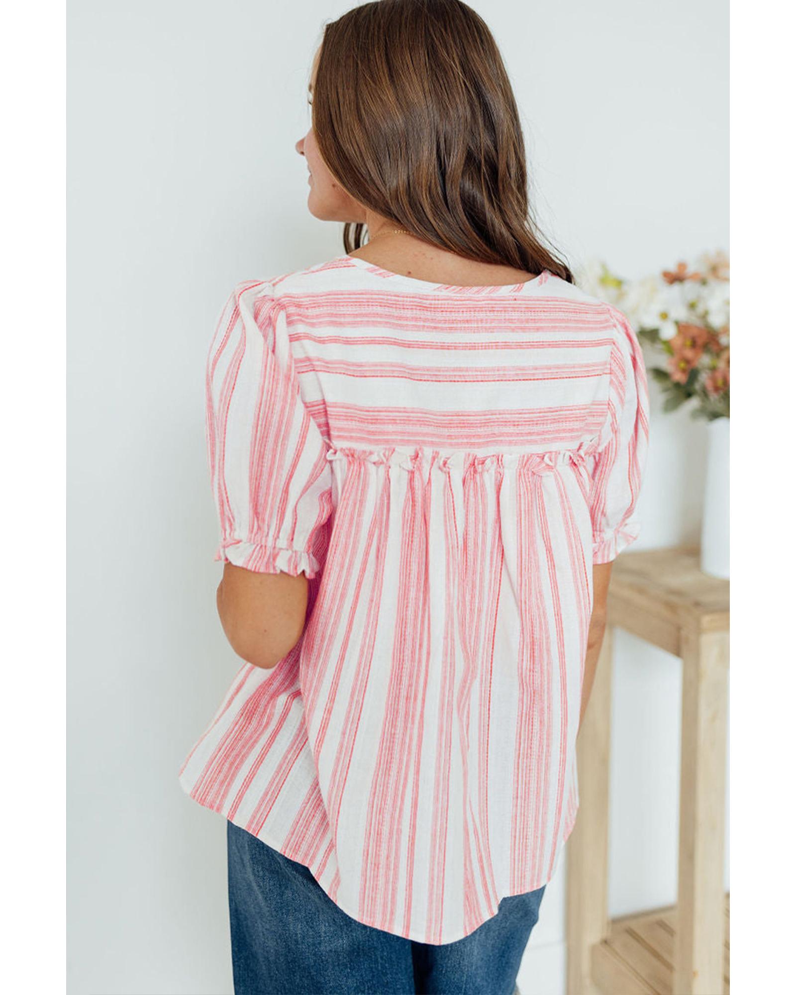 Pink Stripe Plus Size Tassel Tie Frilled Detail Short Sleeve Blouse – 4X