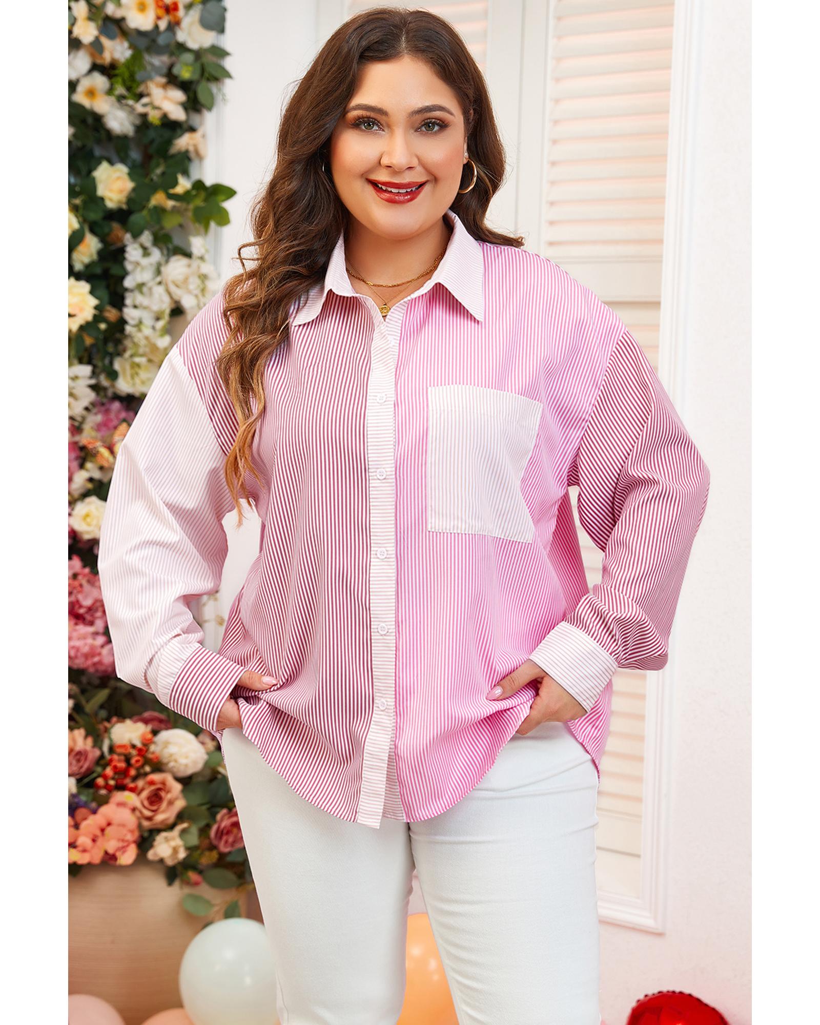 Pink Stripe Print Colorblock Plus Size Shirt – 3X