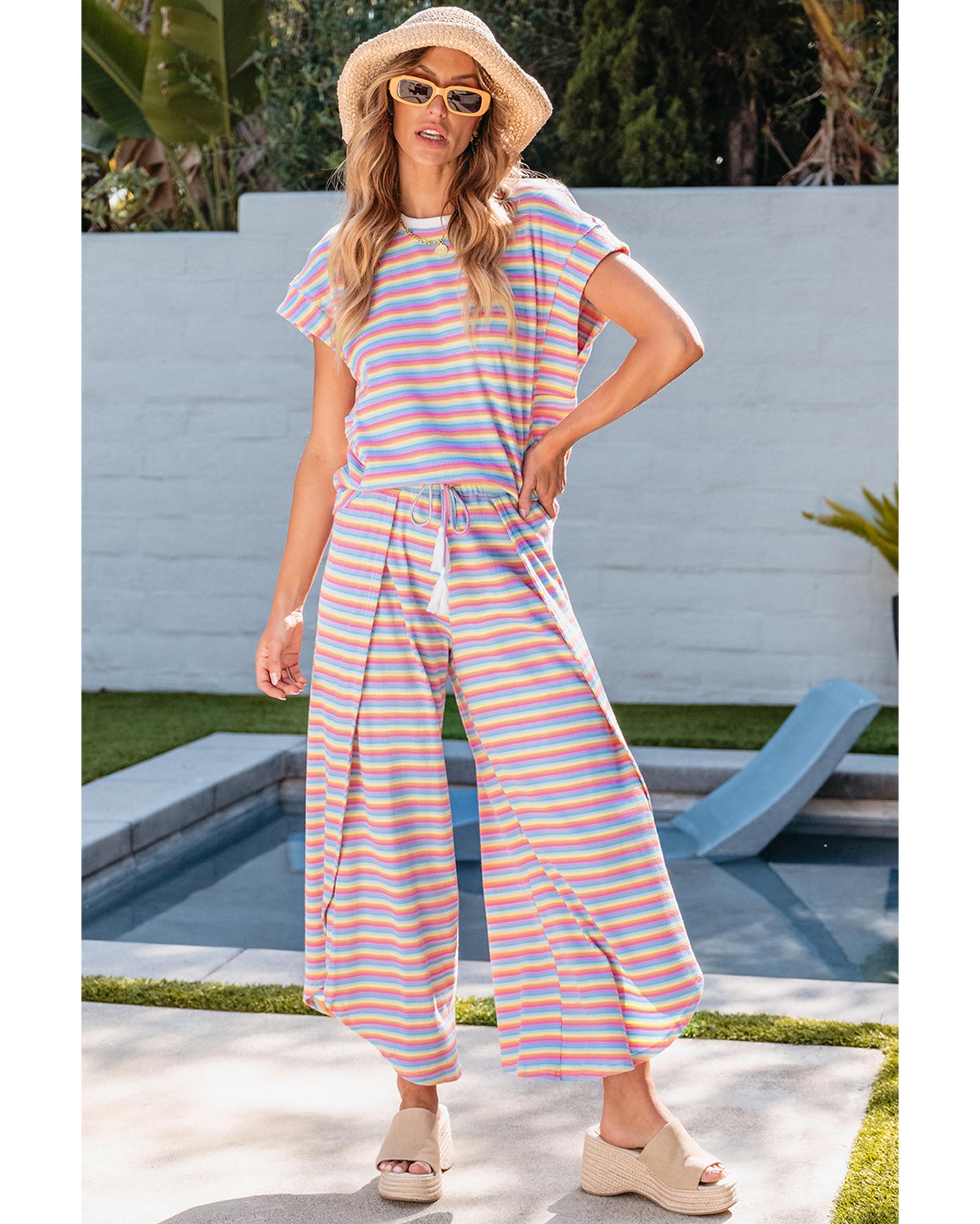 Pink Stripe Rainbow Tee Tasseled String Wide Leg Pants Set – L