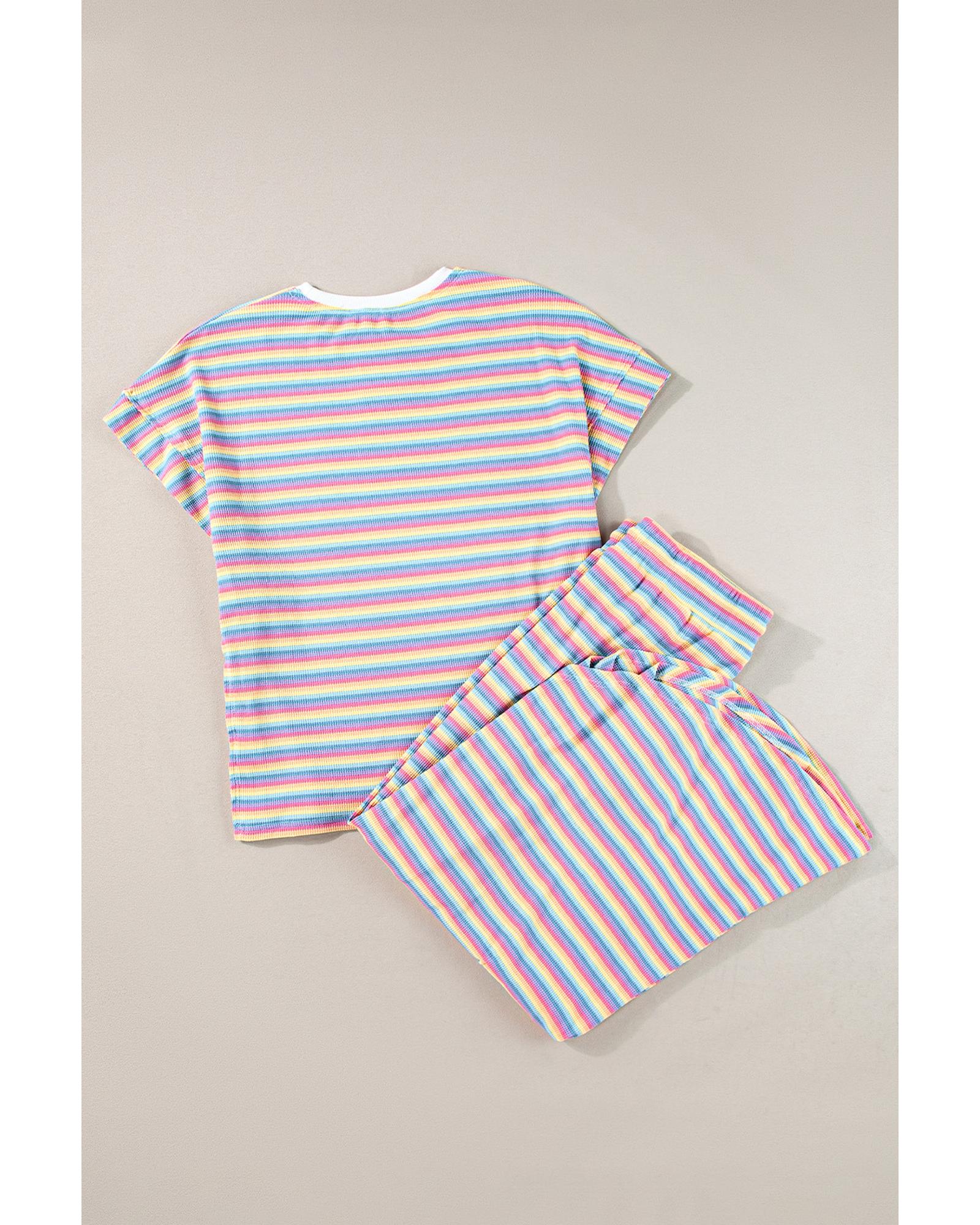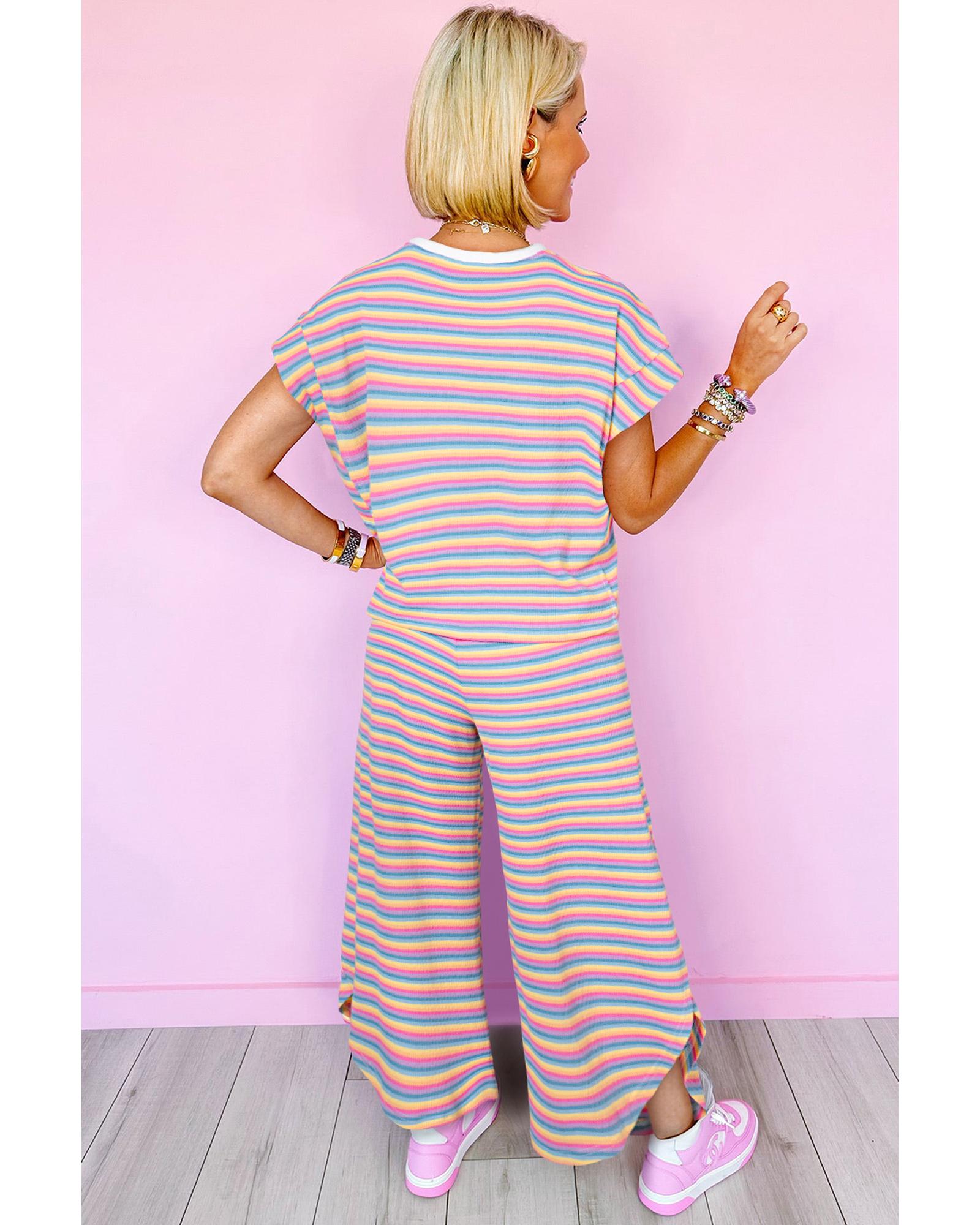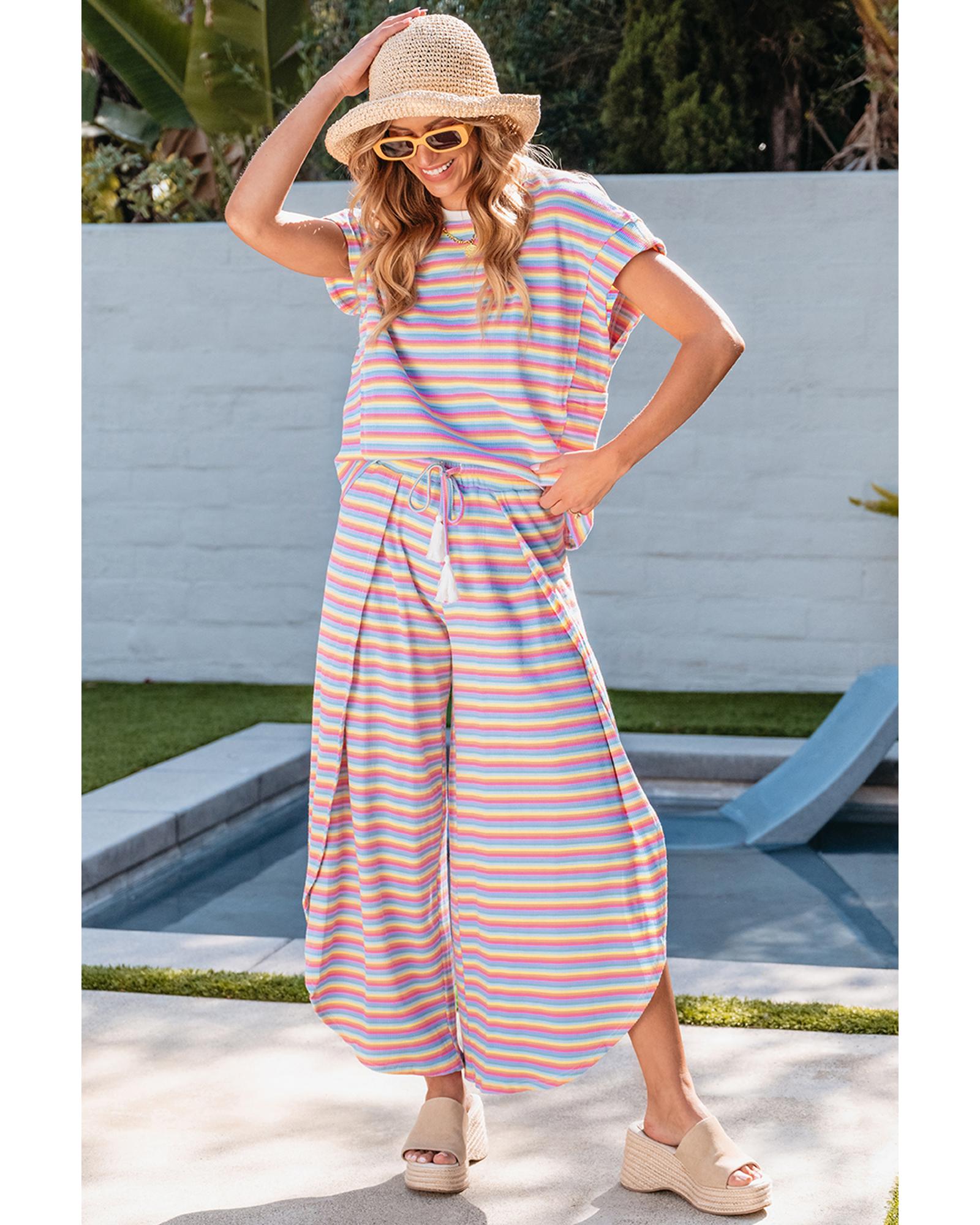 Pink Stripe Rainbow Tee Tasseled String Wide Leg Pants Set - S