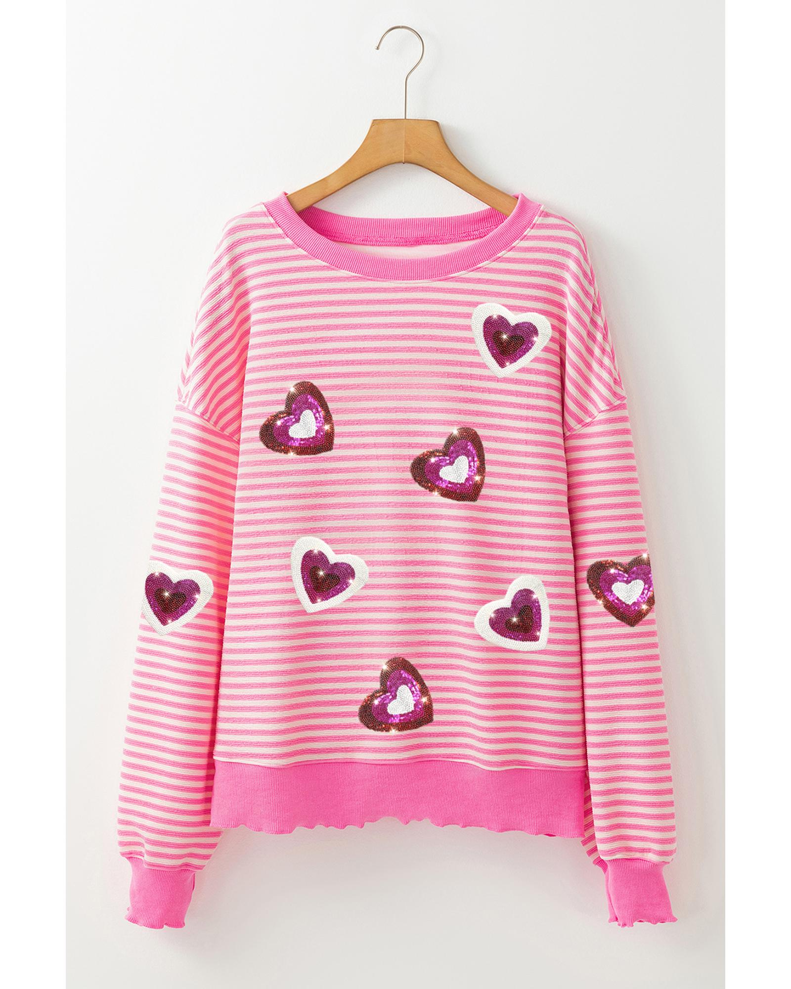 - Pink Stripe Sequin Heart Patched Pattern Long Sleeve Valentines Top