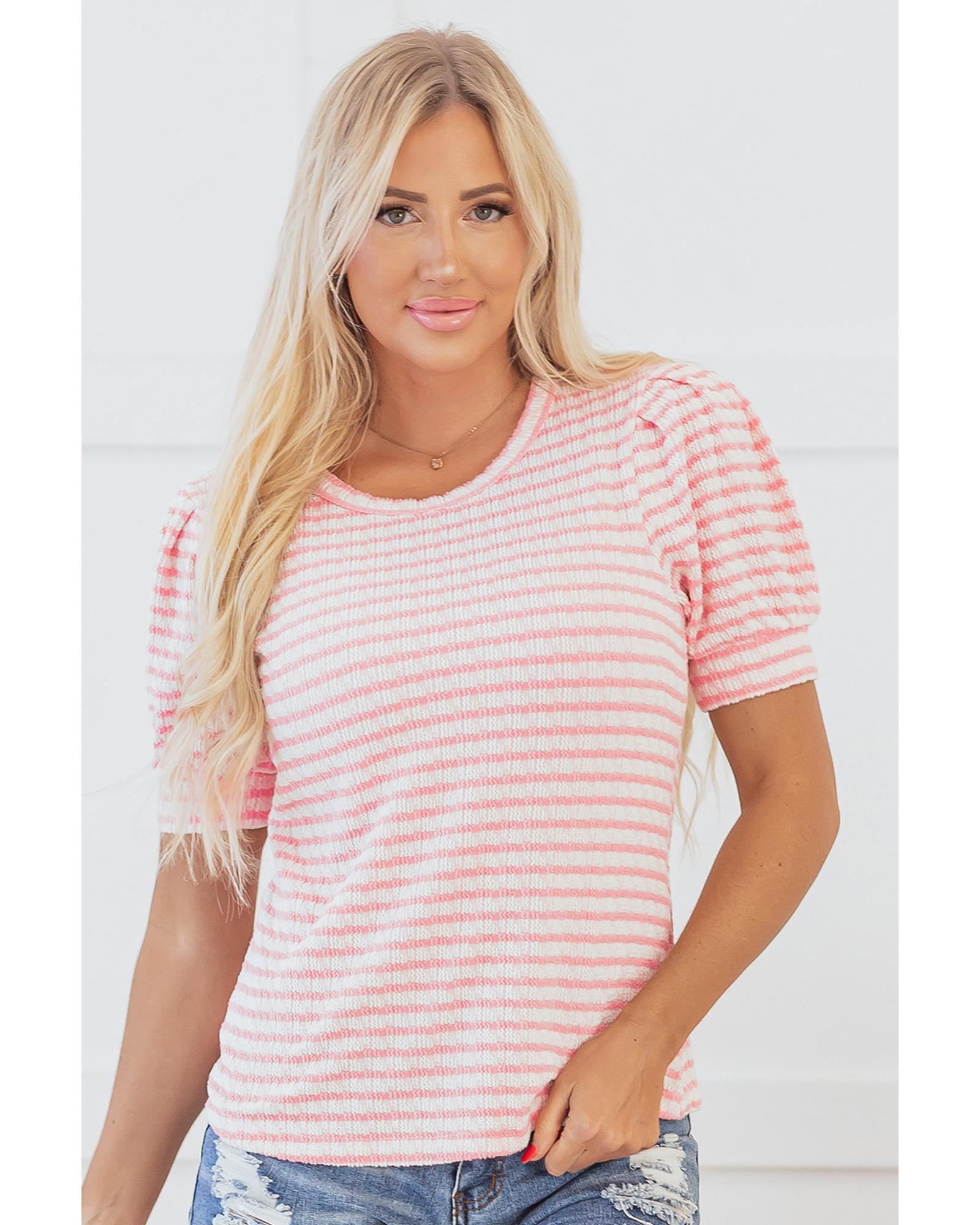 - Pink Stripe Textured Puff Sleeve Crewneck Top