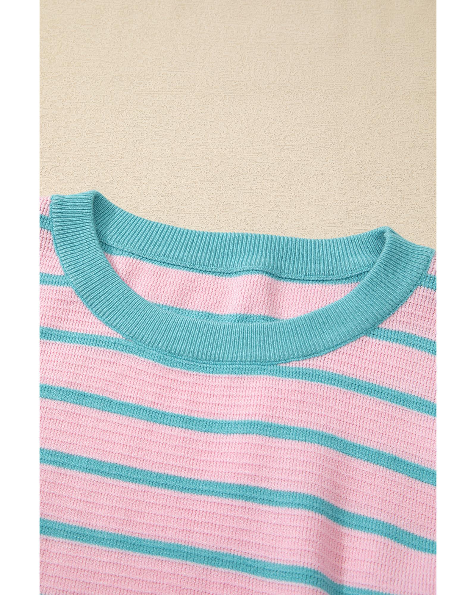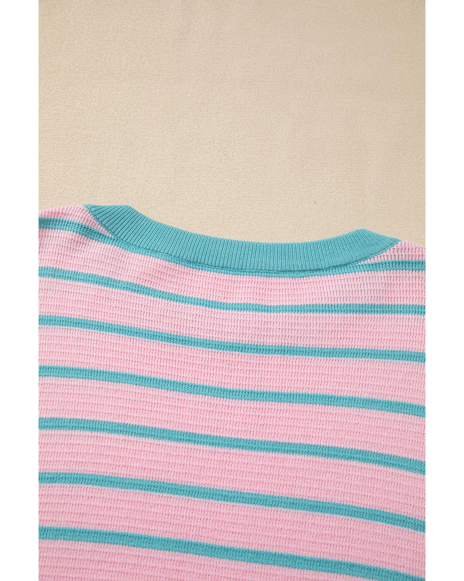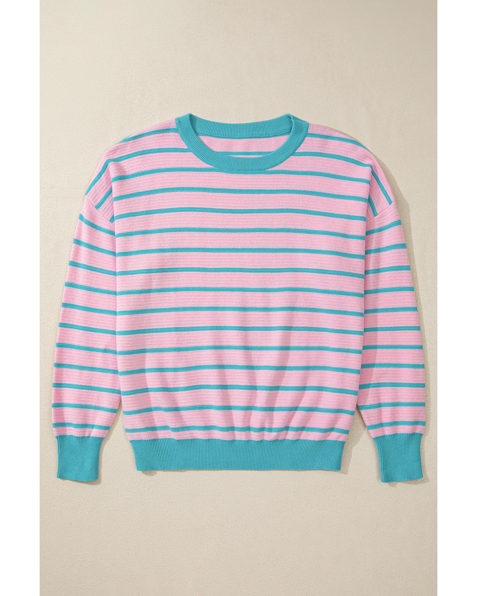 Pink Stripe Trimmed Round Neck Drop Shoulder Loose Sweater – L