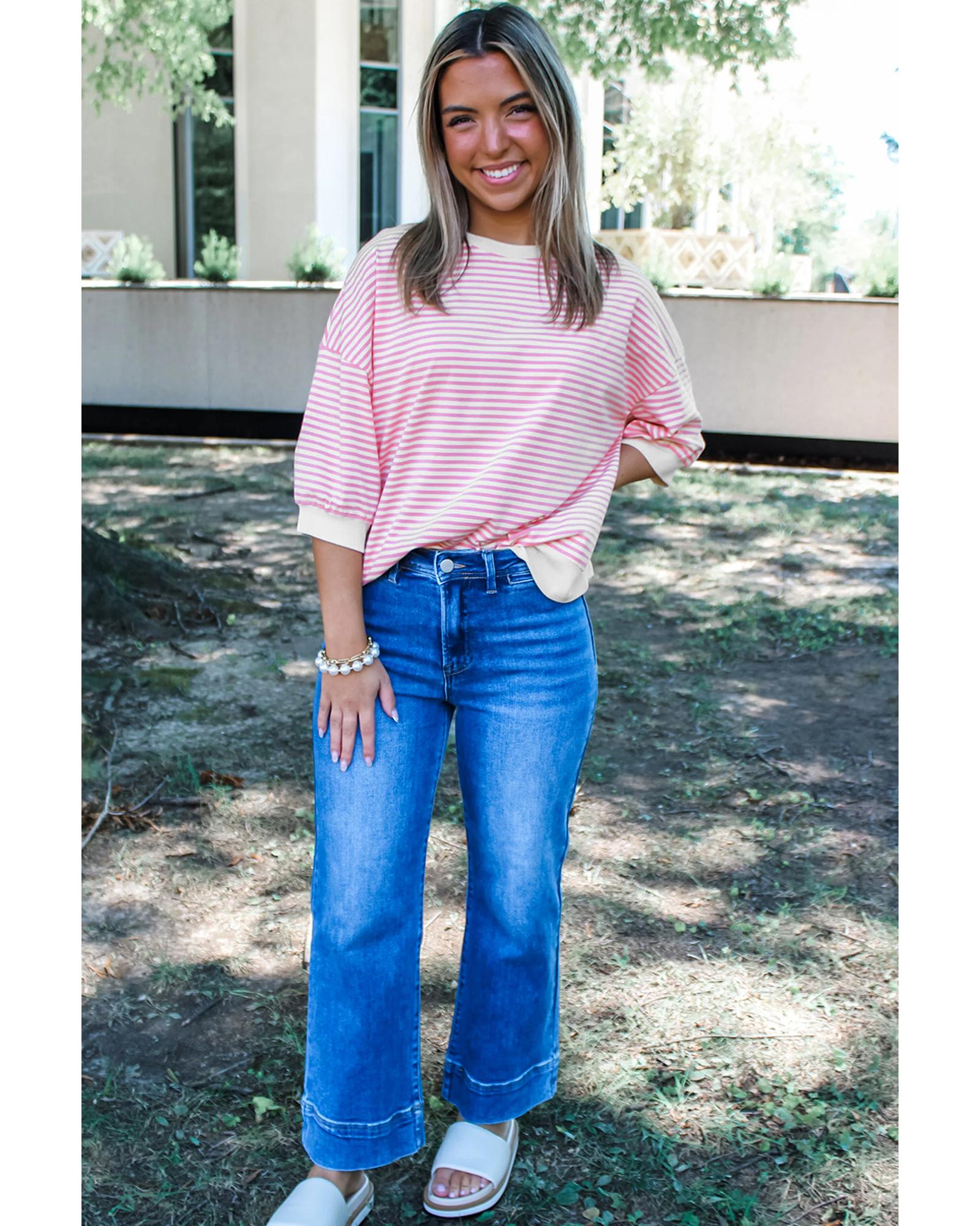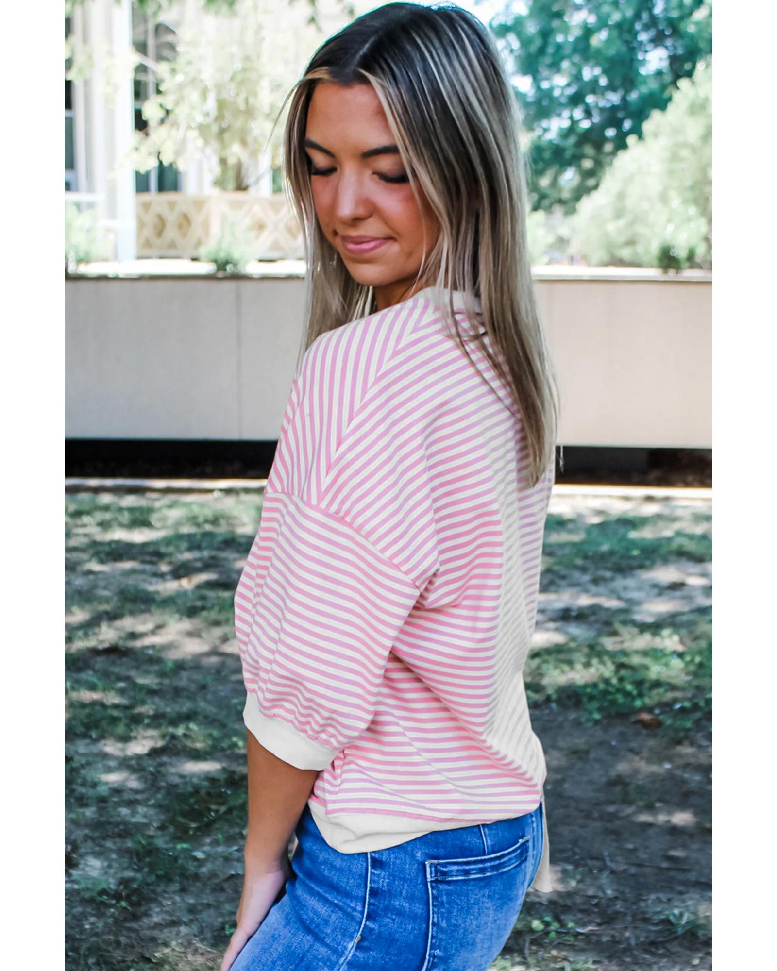 Pink Striped 3/4 Sleeve Drop Shoulder Top – L