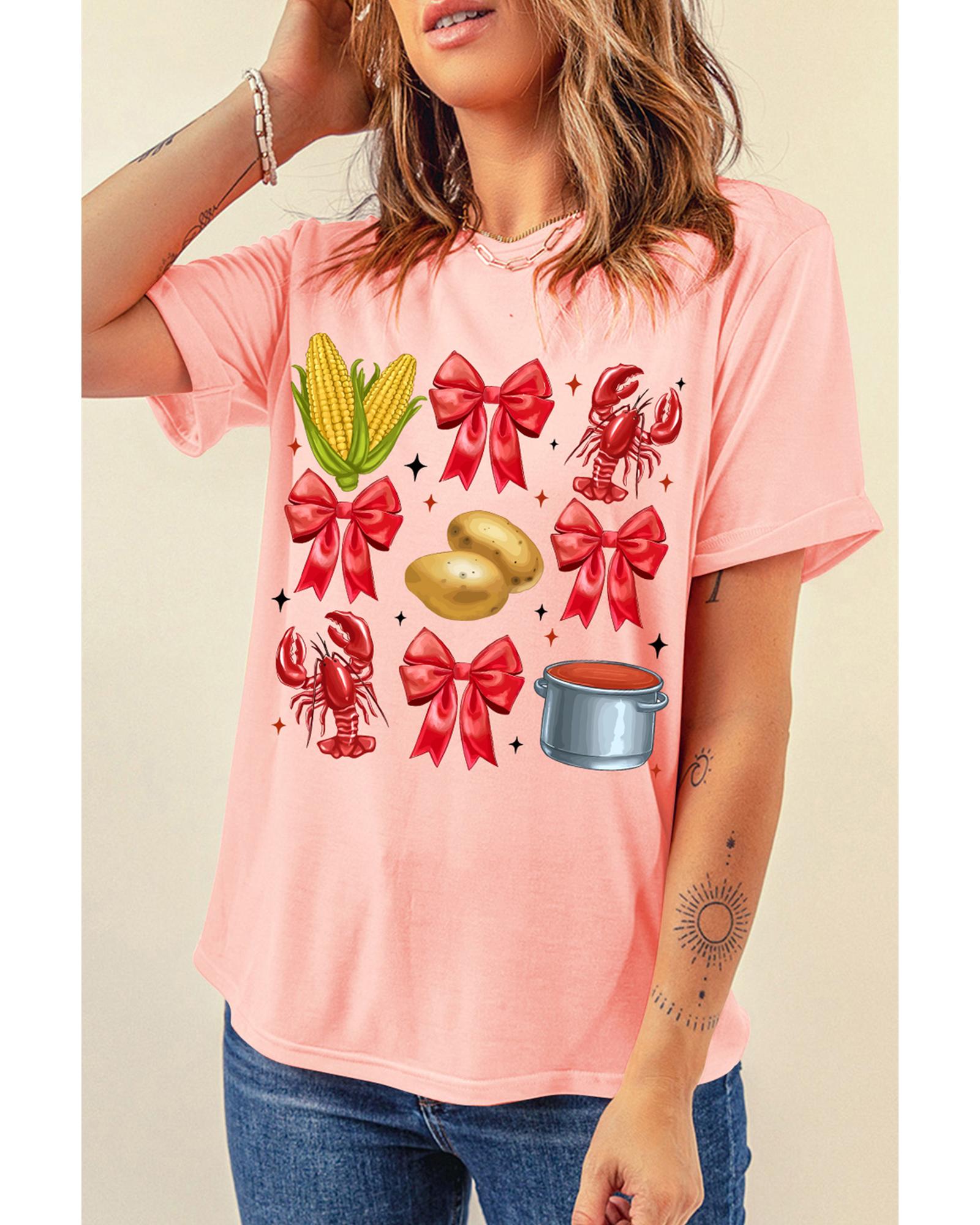 - Pink Summer Food Bow Crawfish Printed T Shirt