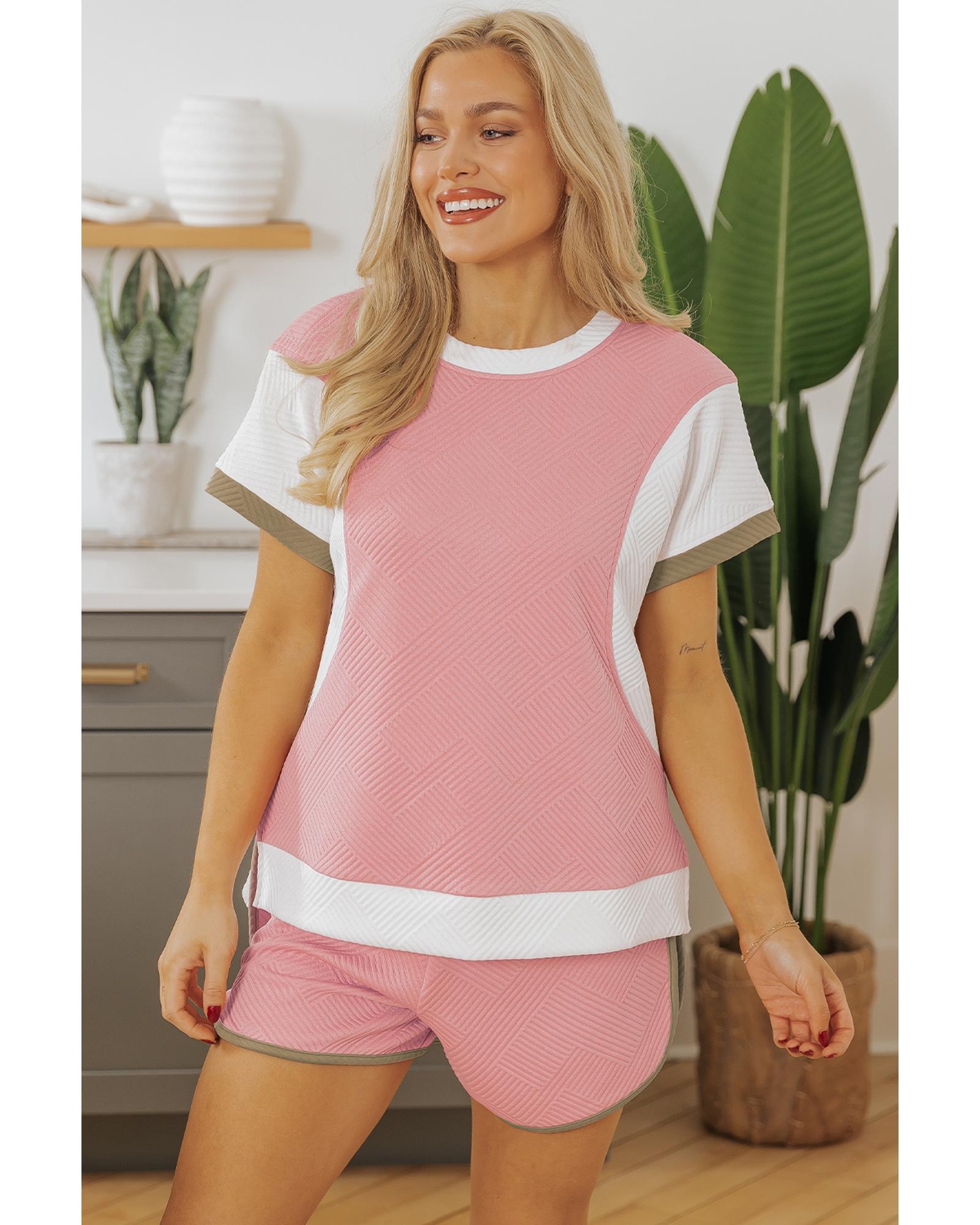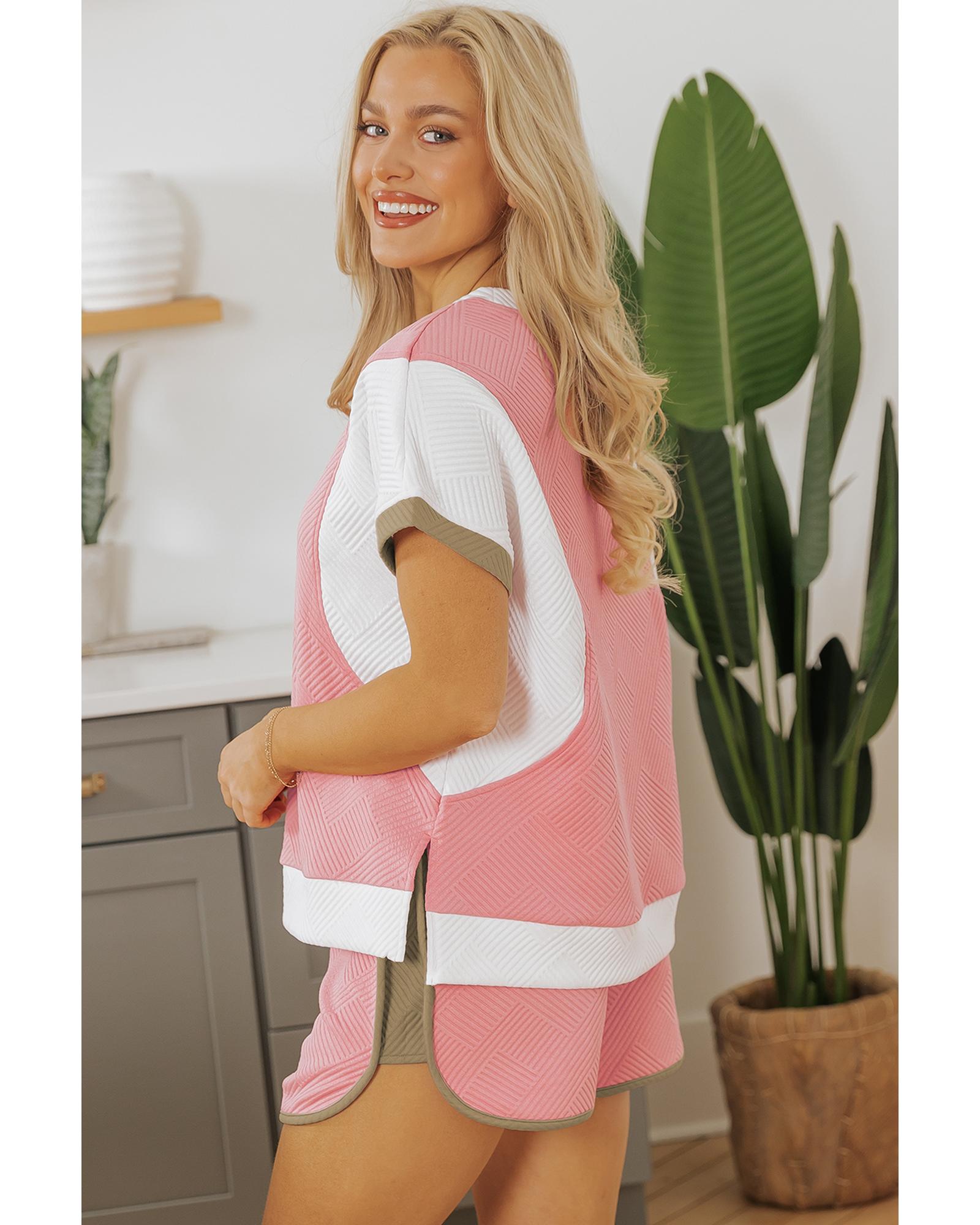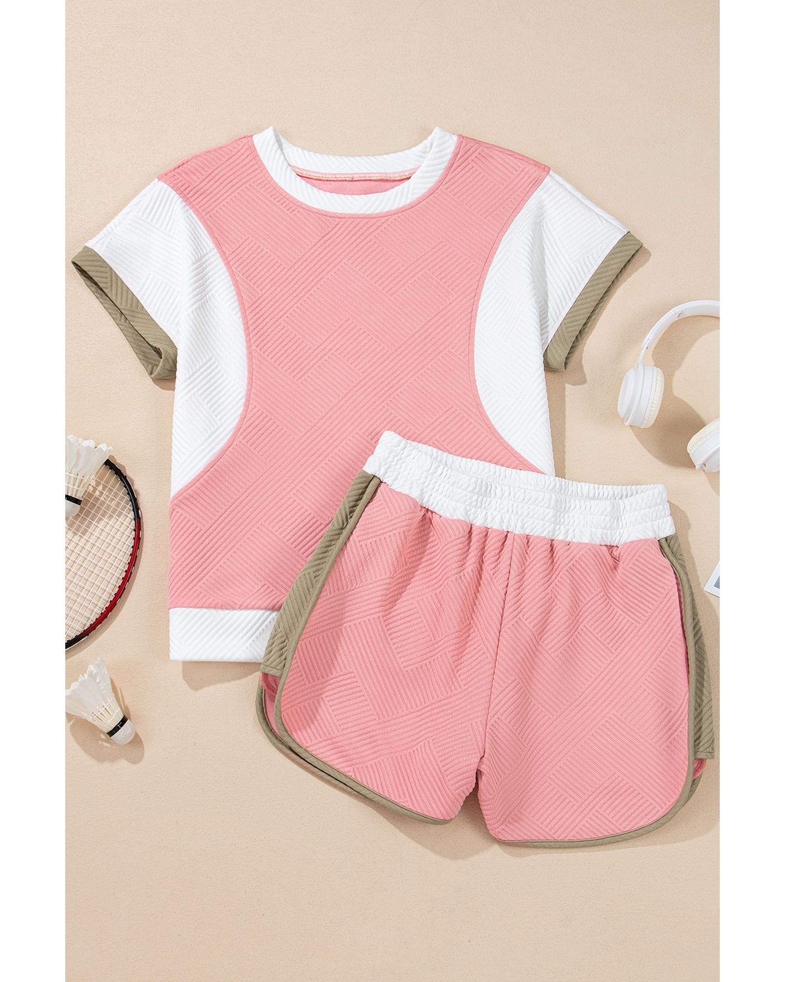 Pink Textured Colorblock Patchwork Tee Two Piece Shorts Set - M