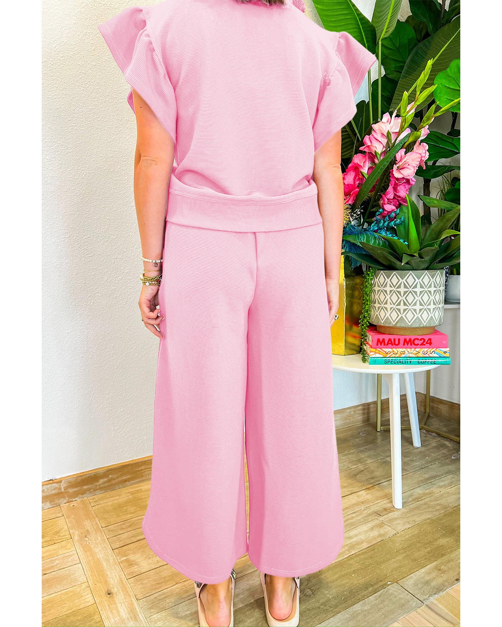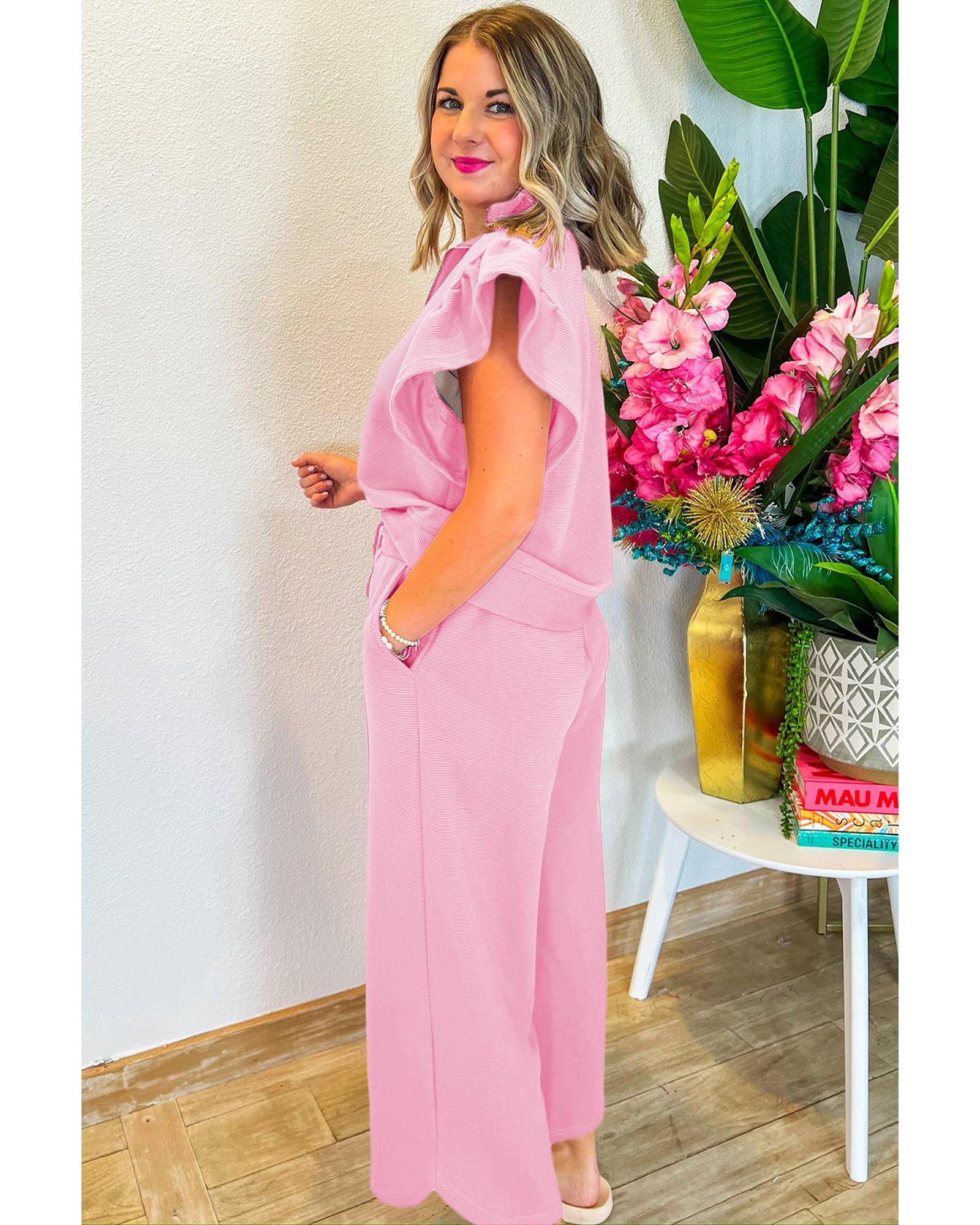 Pink Textured Ruffled Sleeve Zipped Top and Wide Leg Pants Set – L