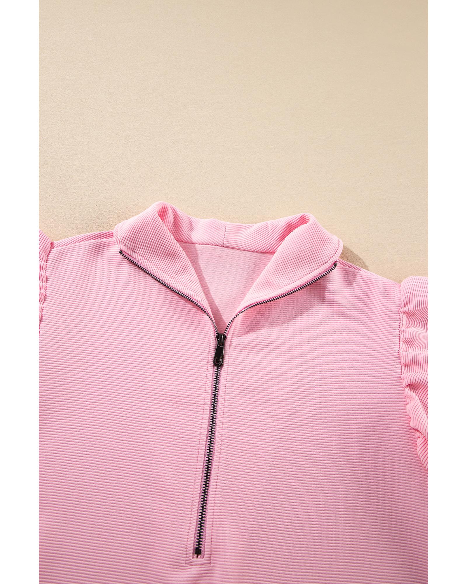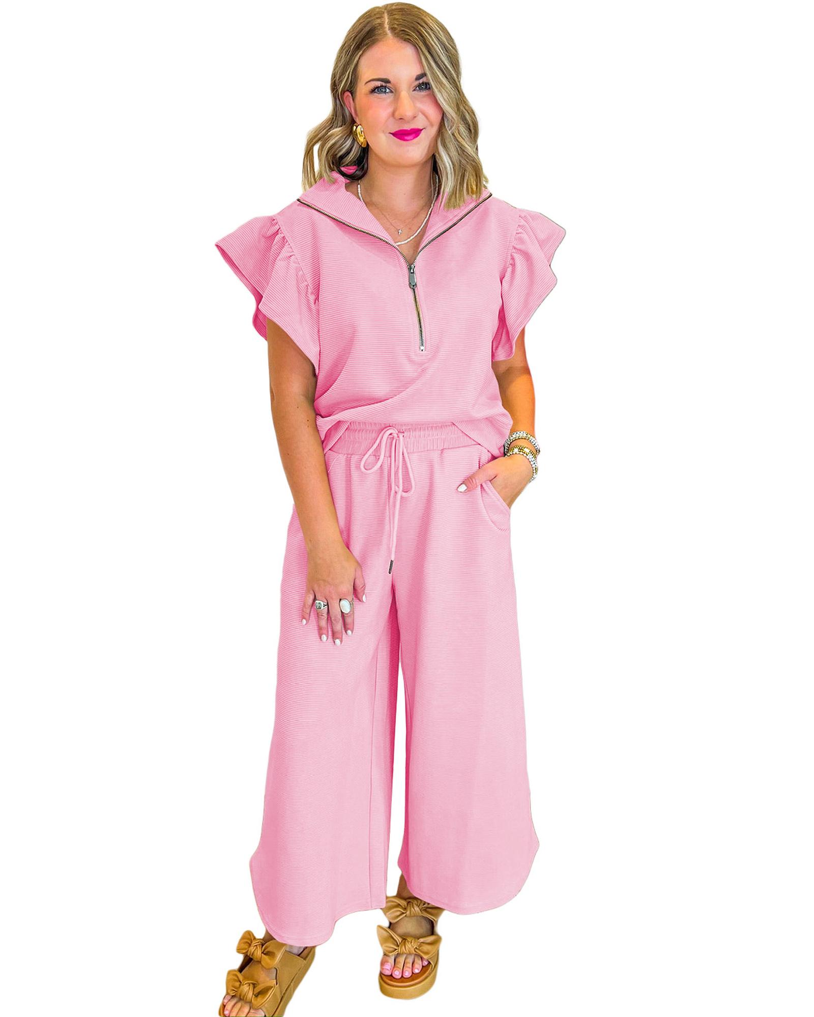 Pink Textured Ruffled Sleeve Zipped Top and Wide Leg Pants Set - M