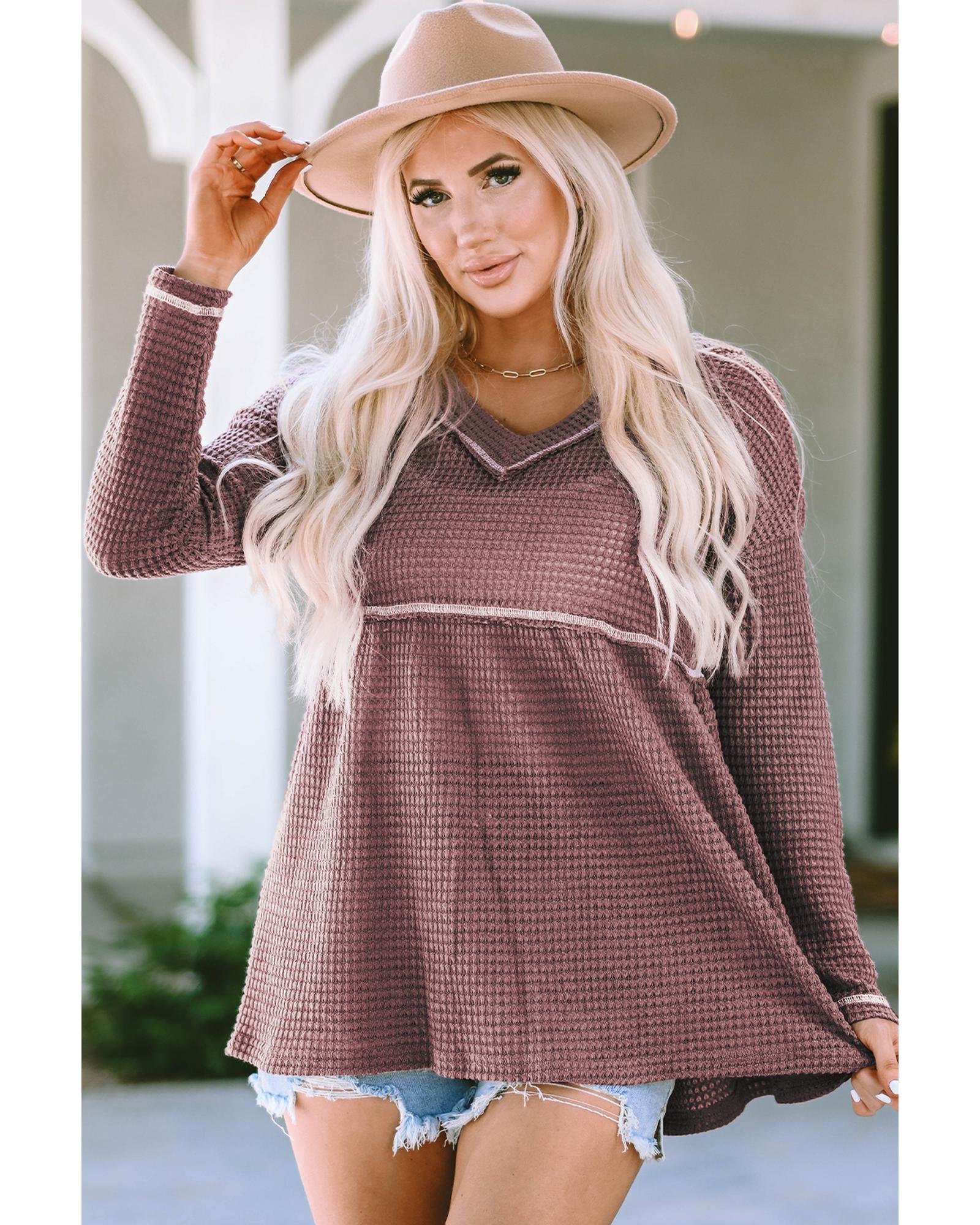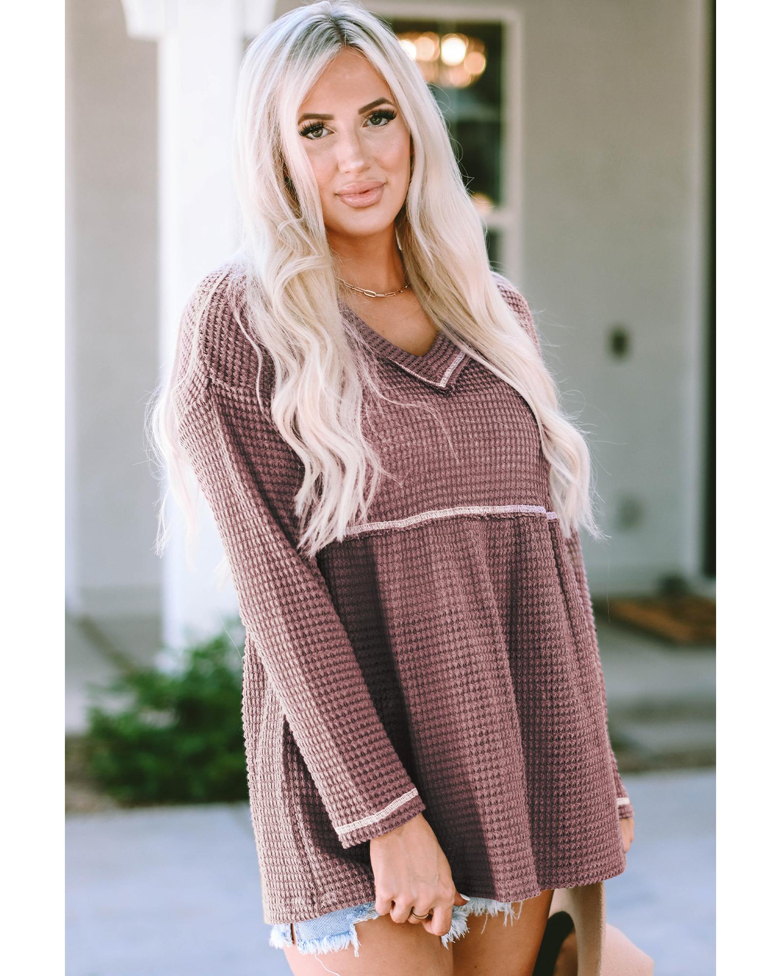 Pink Waffle Knit V Neck Long Sleeve Babydoll Top – M
