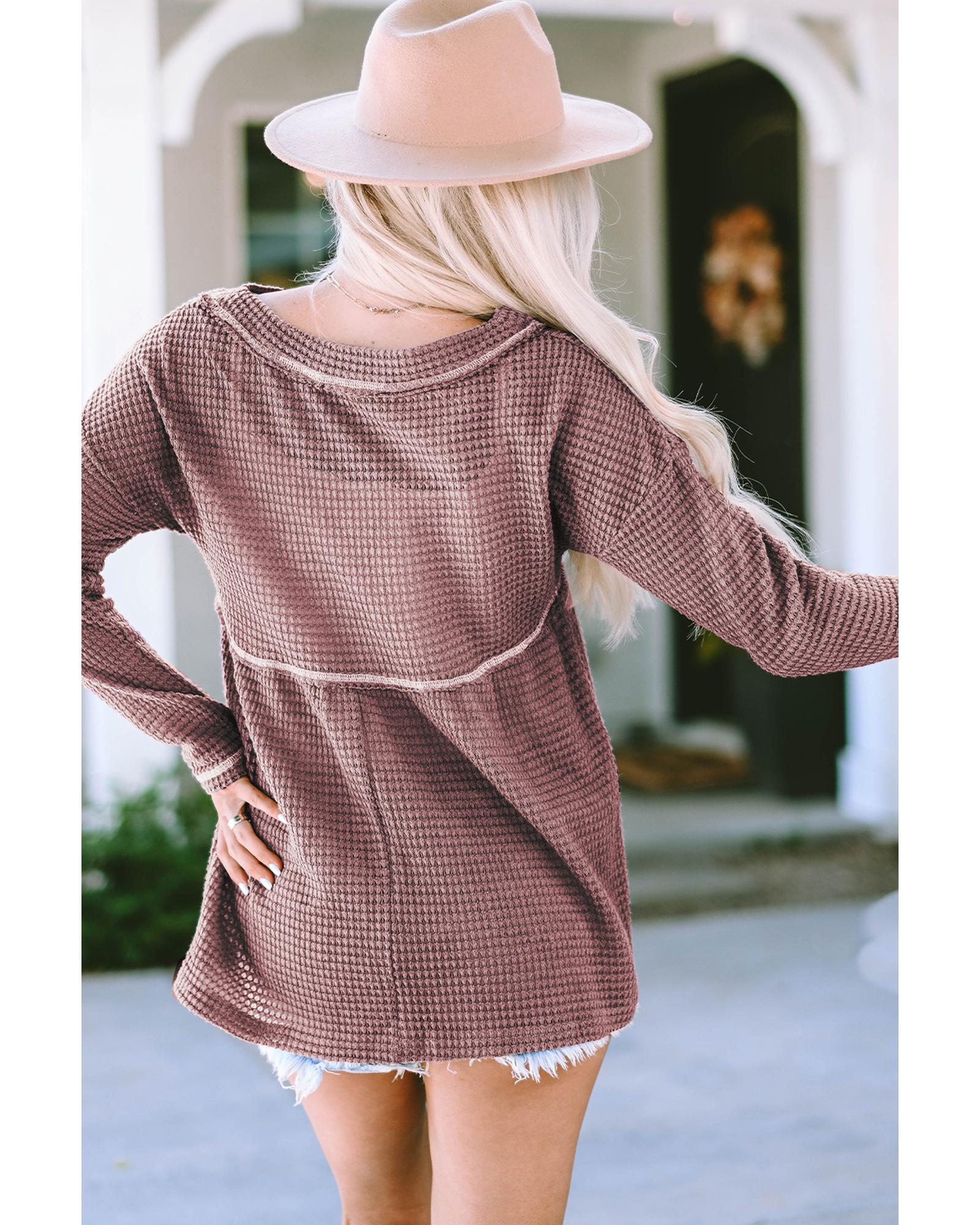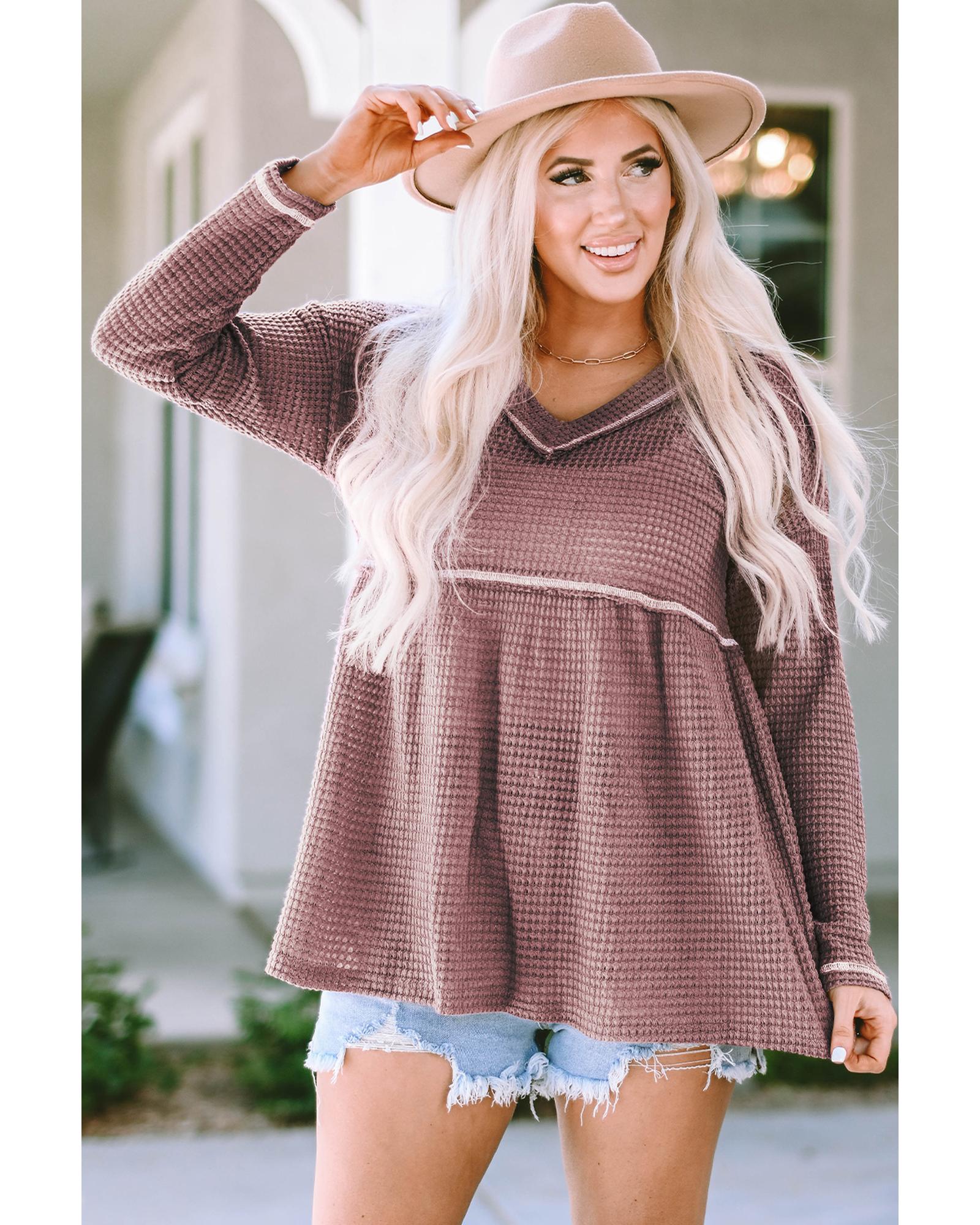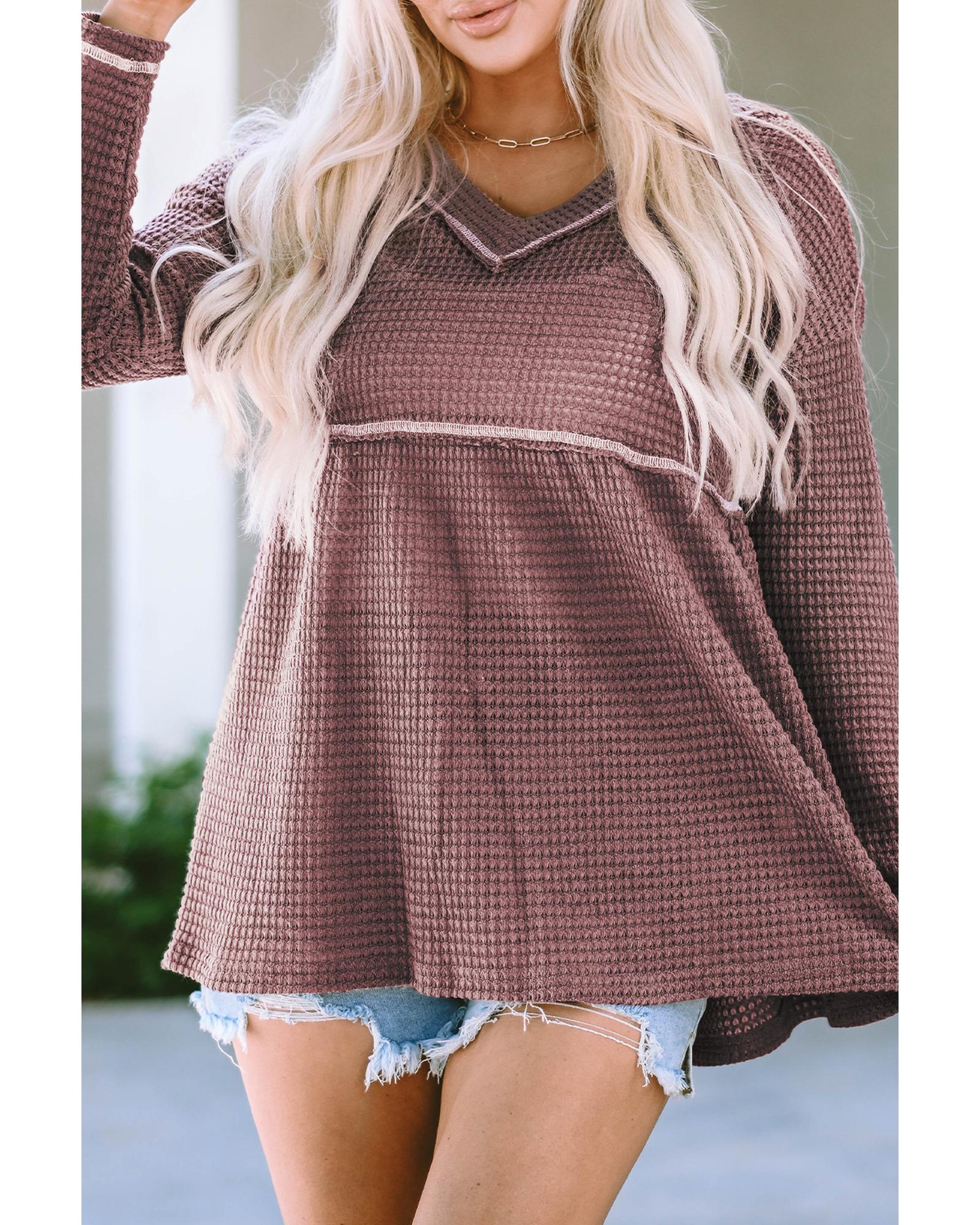 Pink Waffle Knit V Neck Long Sleeve Babydoll Top – S