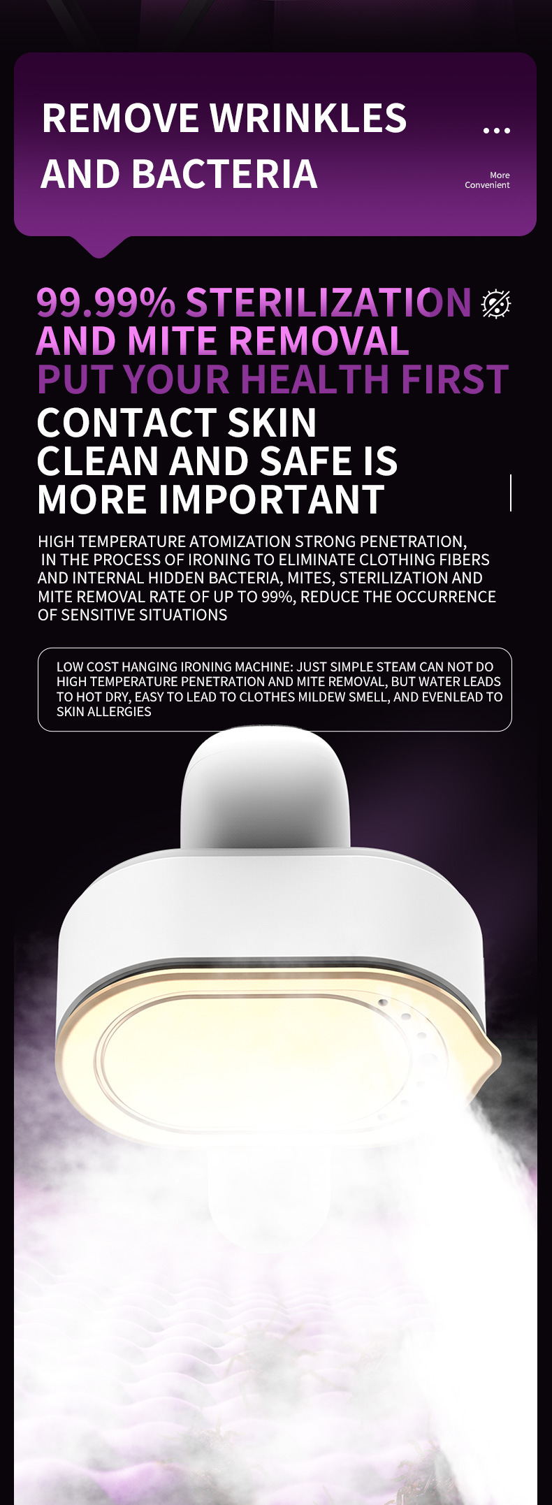 • Bacteria & Mite Reduction: Steam effectively reduces bacterial growth and mites, promoting garment hygiene.