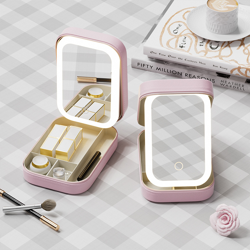 Portable Jewelry & Makeup Organizer Box with LED Touch Mirror – Rechargeable, Adjustable Lighting(pink)