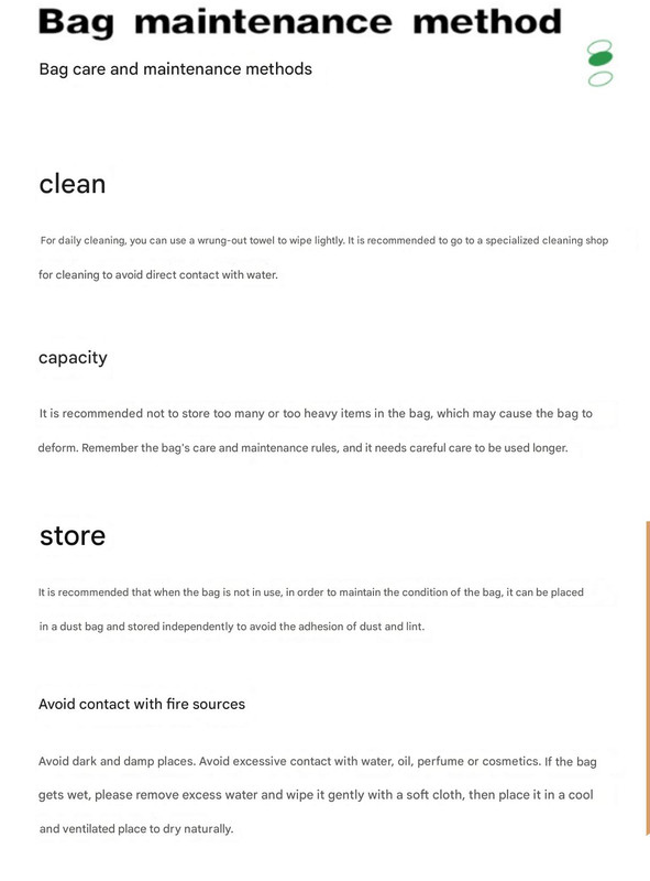 - Cleaning: For daily cleaning, gently wipe with a dry soft cloth. It is recommended to use specialized bag cleaning services. Avoid direct contact with water.