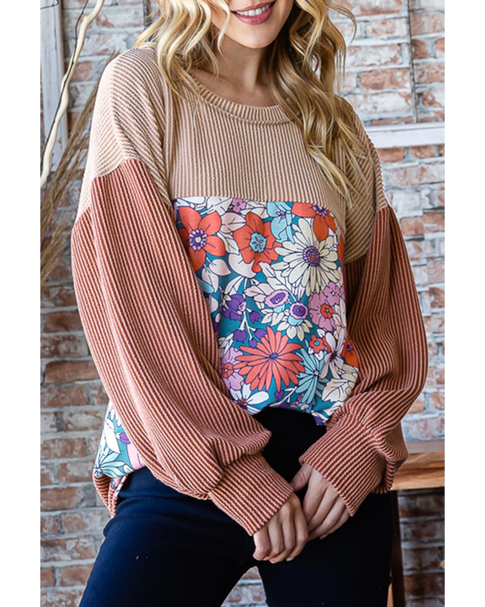 Printed Floral Contrast Colorblock Ribbed Top – M