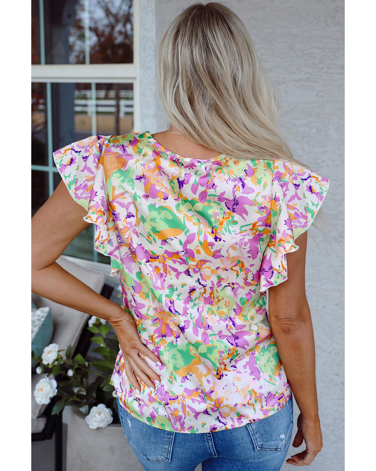 Purple Abstract Printed Ruffled Short Sleeve Notched Neck Blouse – M