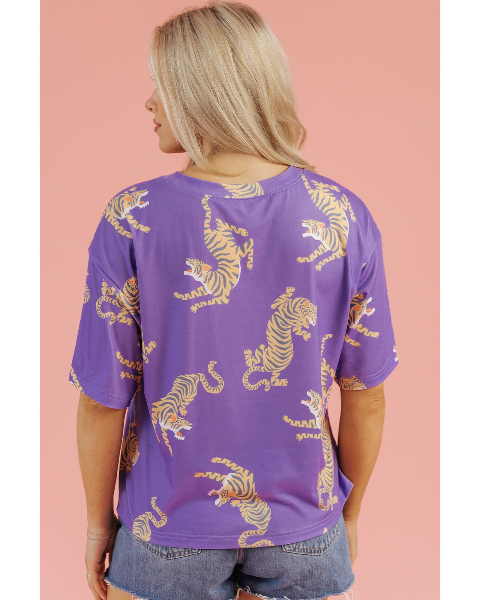 Purple Allover Tiger Printed Patch Pocket Loose T Shirt – XL