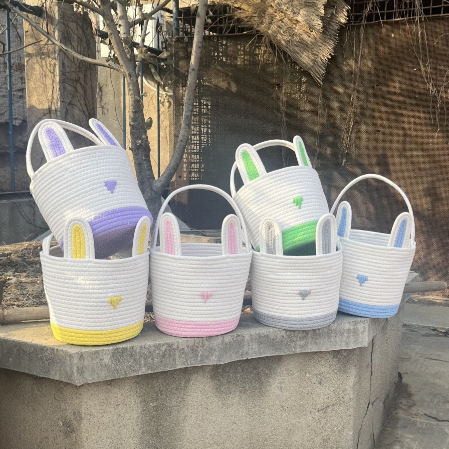 Purple And White Stitching Charming Easter Egg Tote Basket – Cute Rabbit-Themed Handwoven Cotton Rope Candy Holder