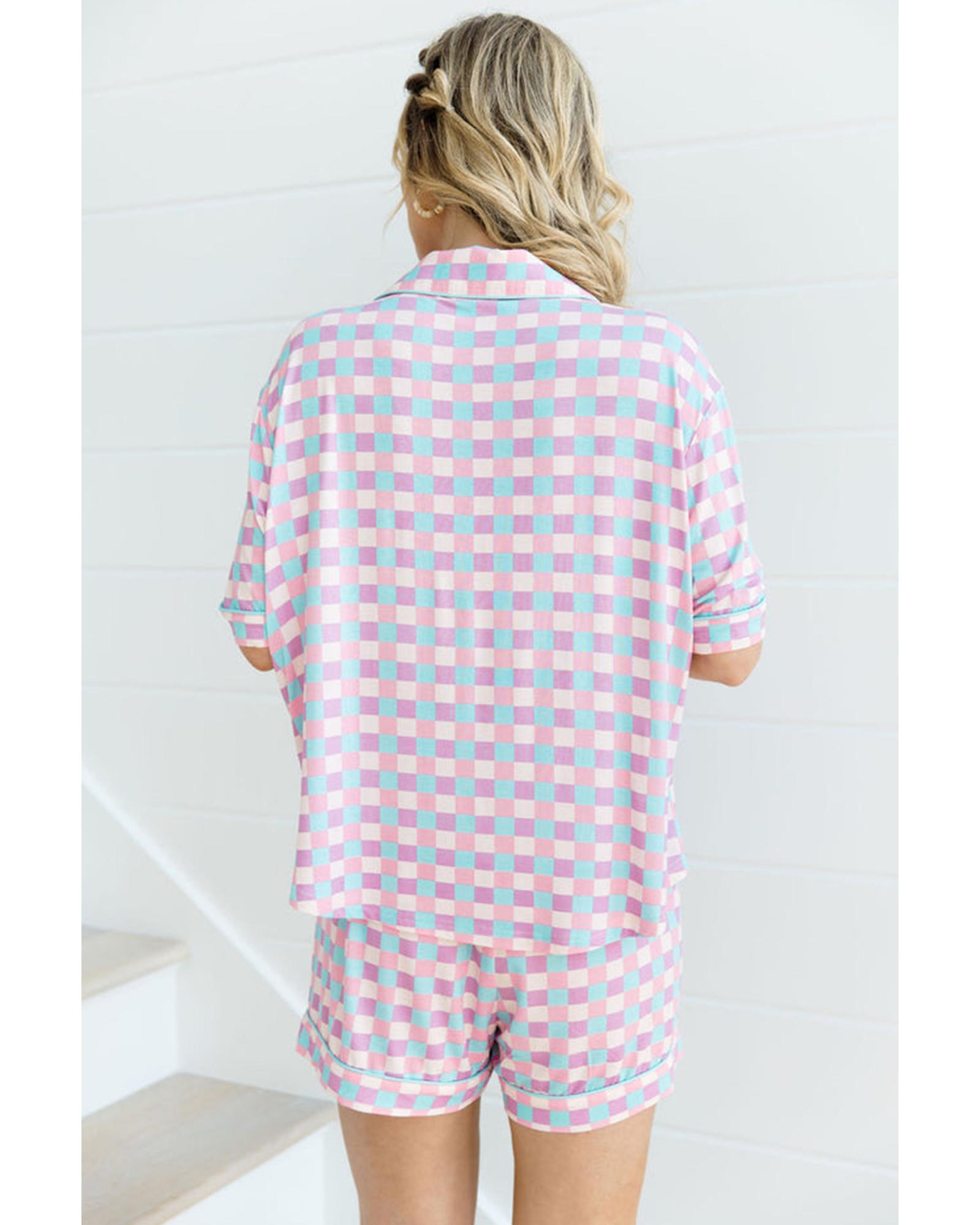 - Purple Checkered Pattern Short Sleeve Pajamas Set for ladies