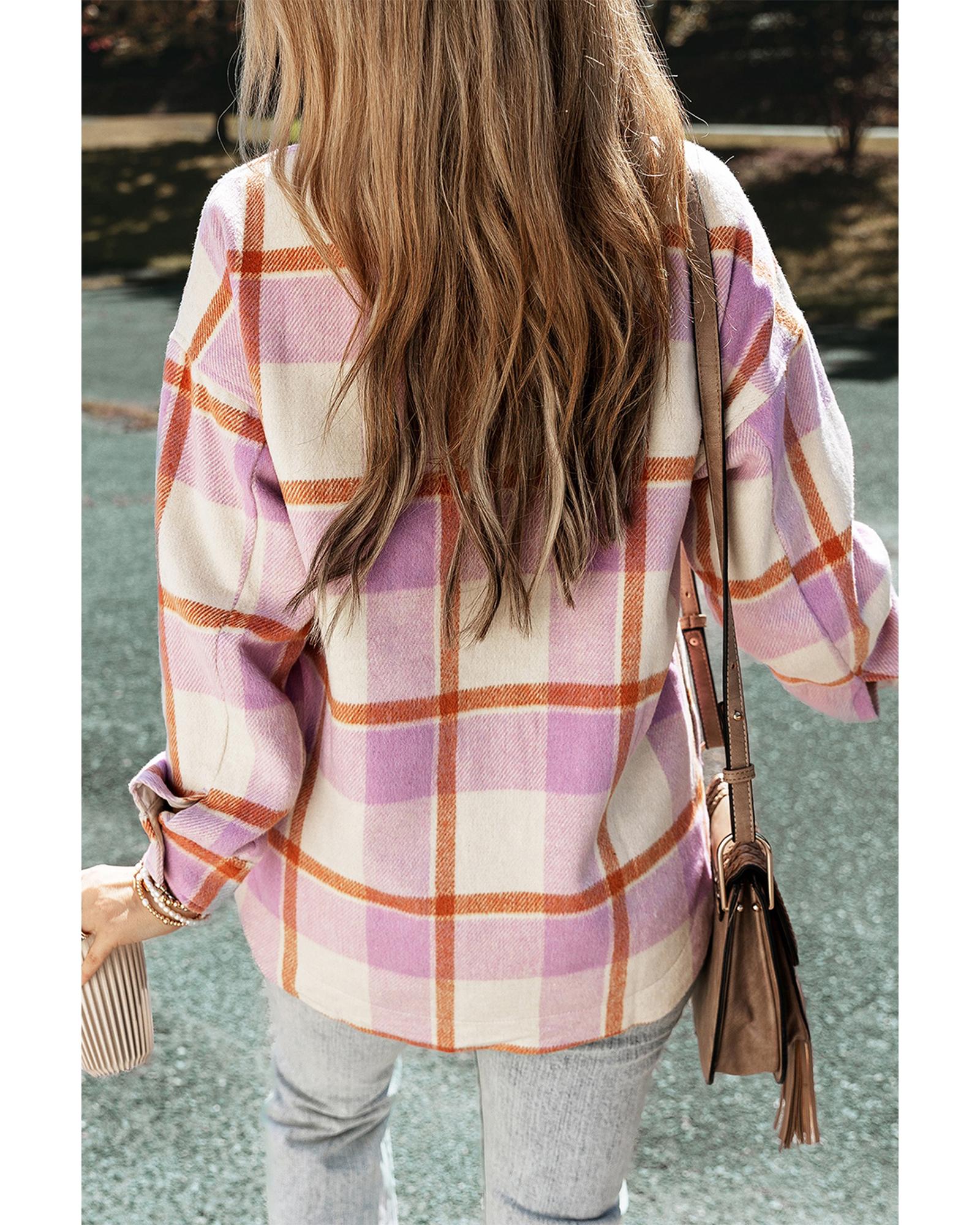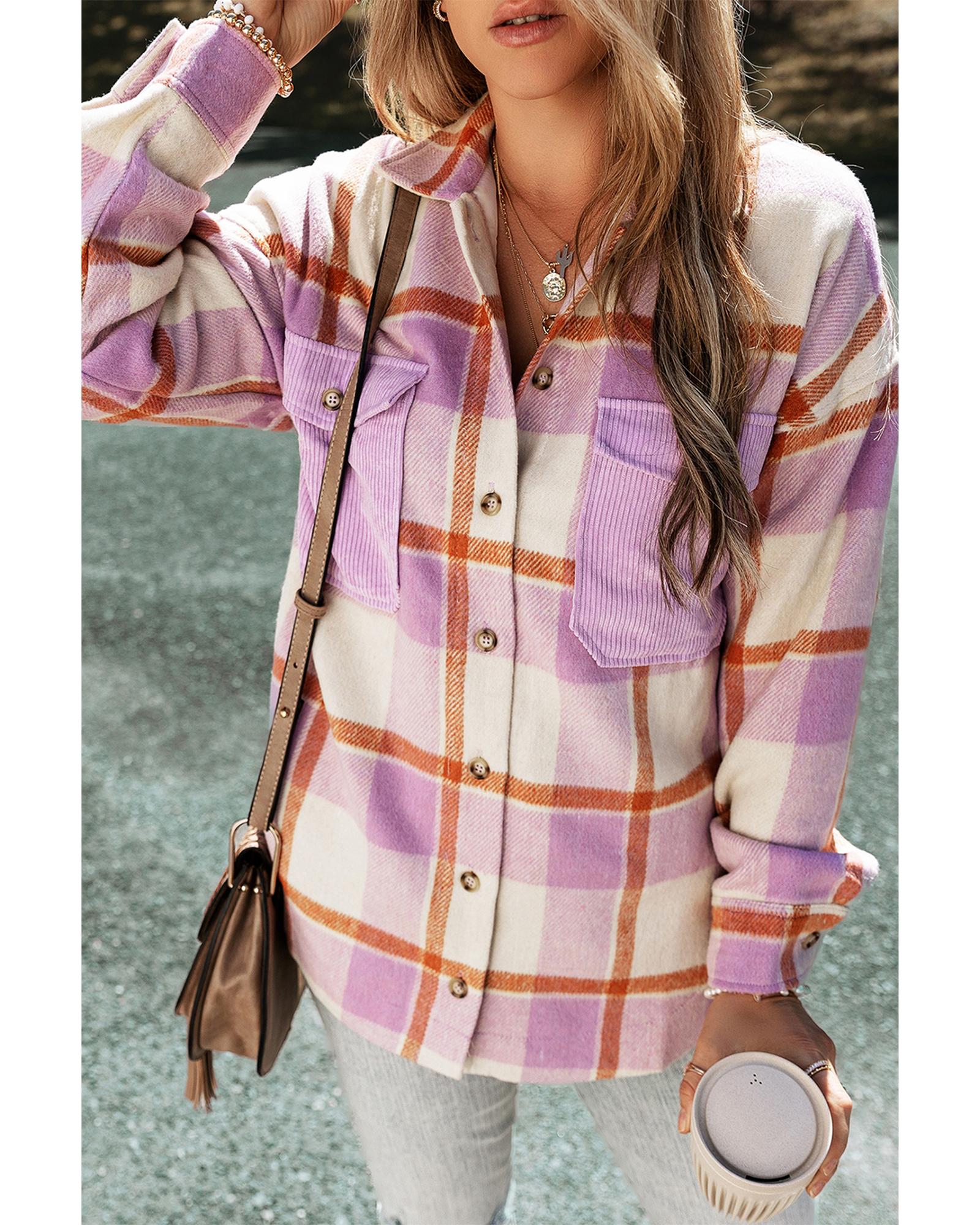 - Purple Corduroy Pockets Brushed Checkered Shacket