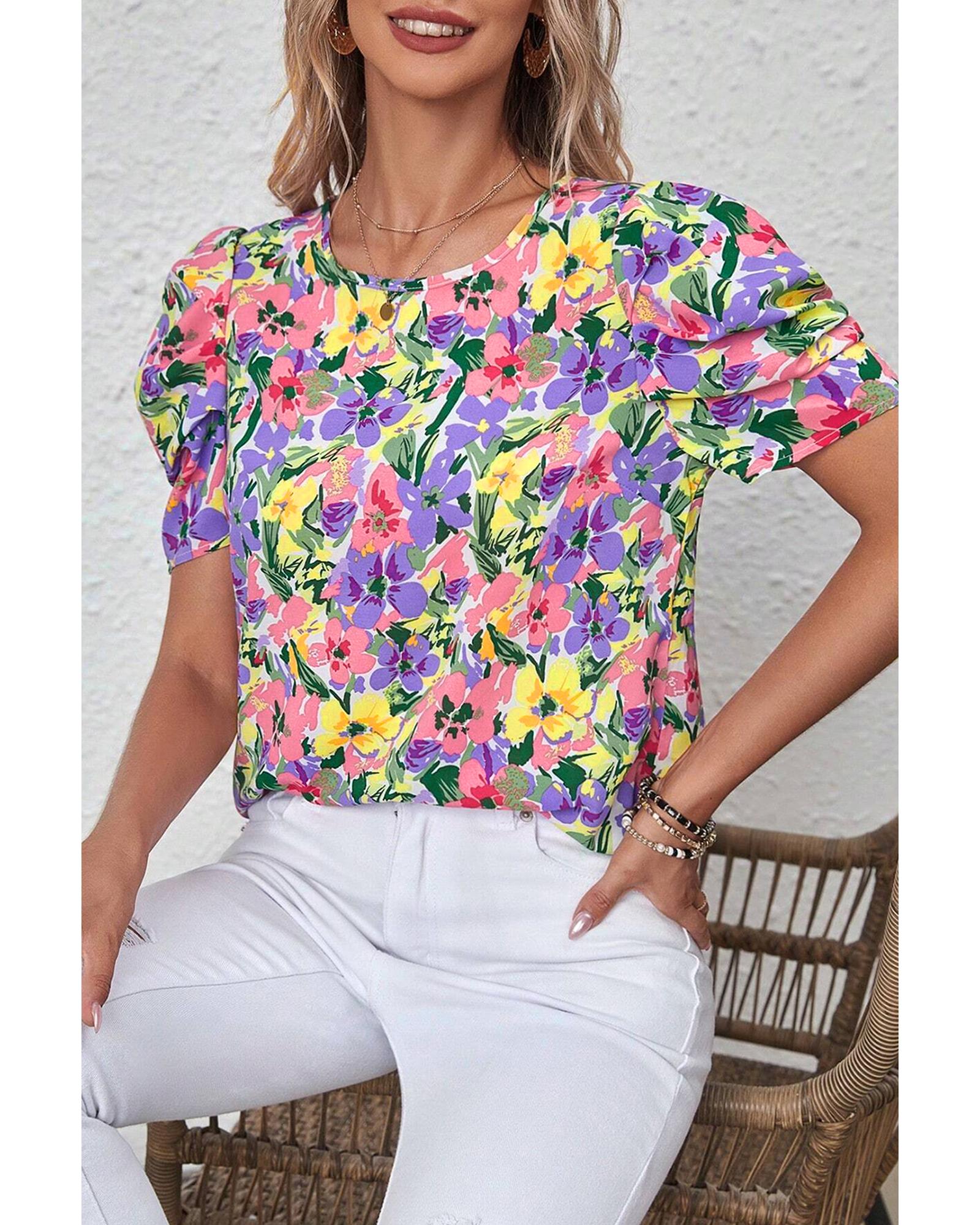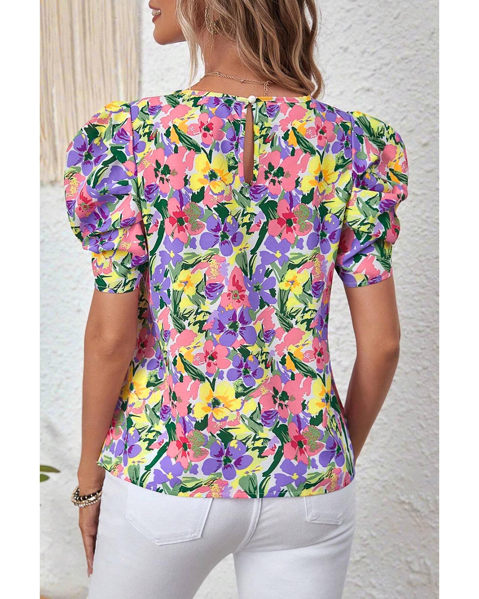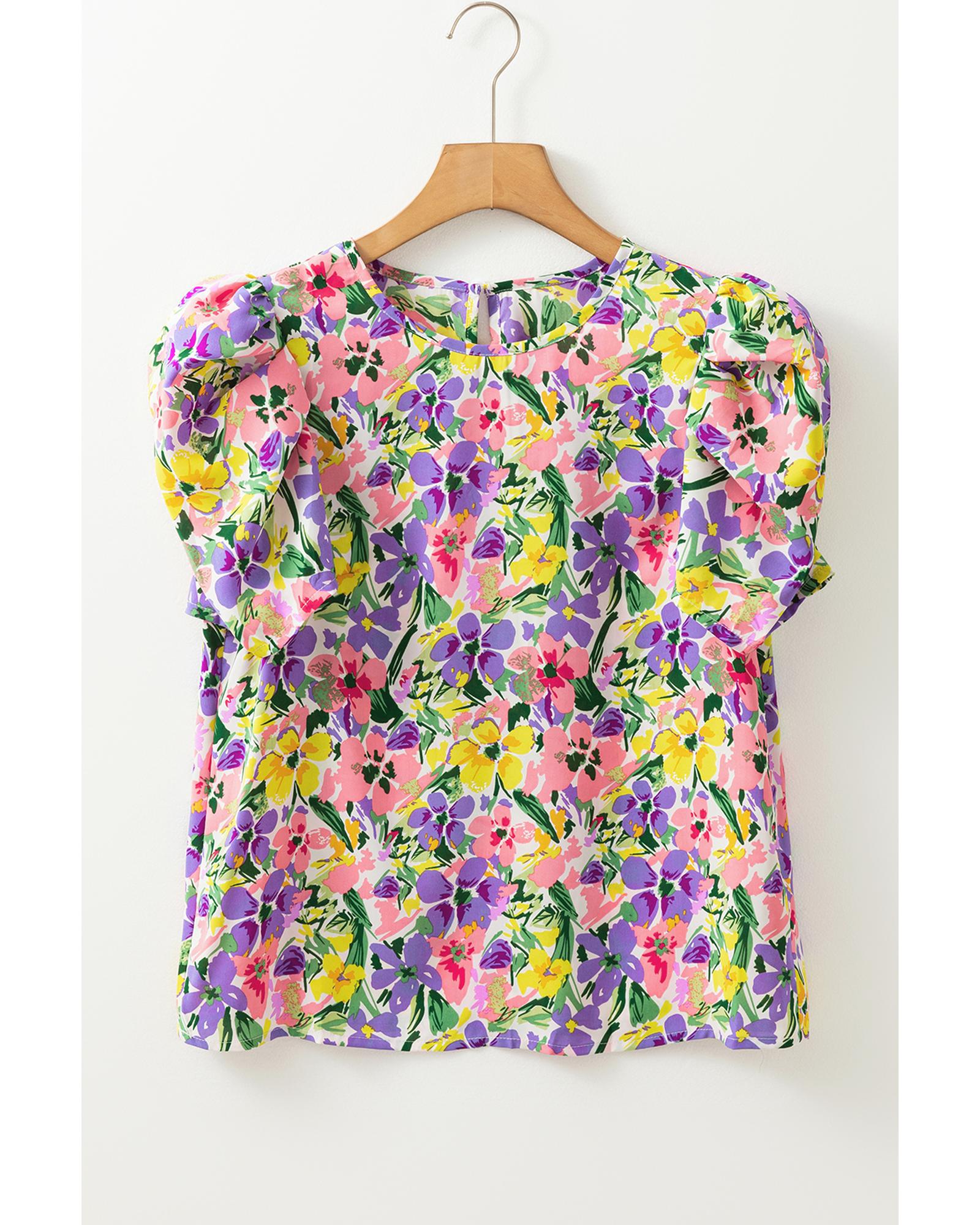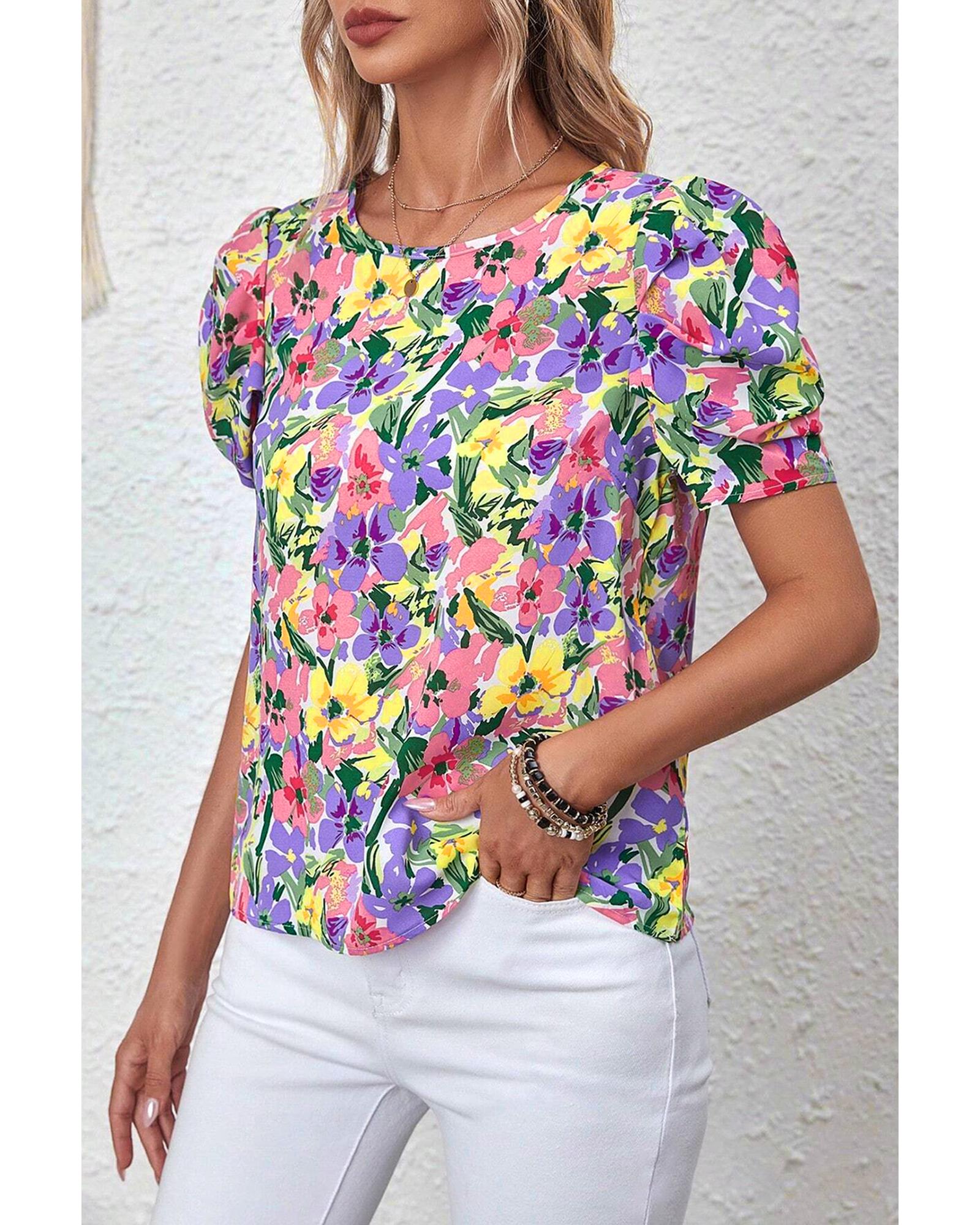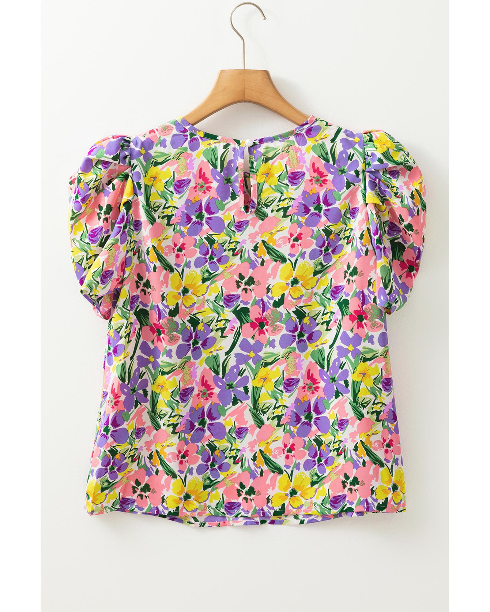 Purple Floral Print Puff Short Sleeve Crew Neck Blouse – S