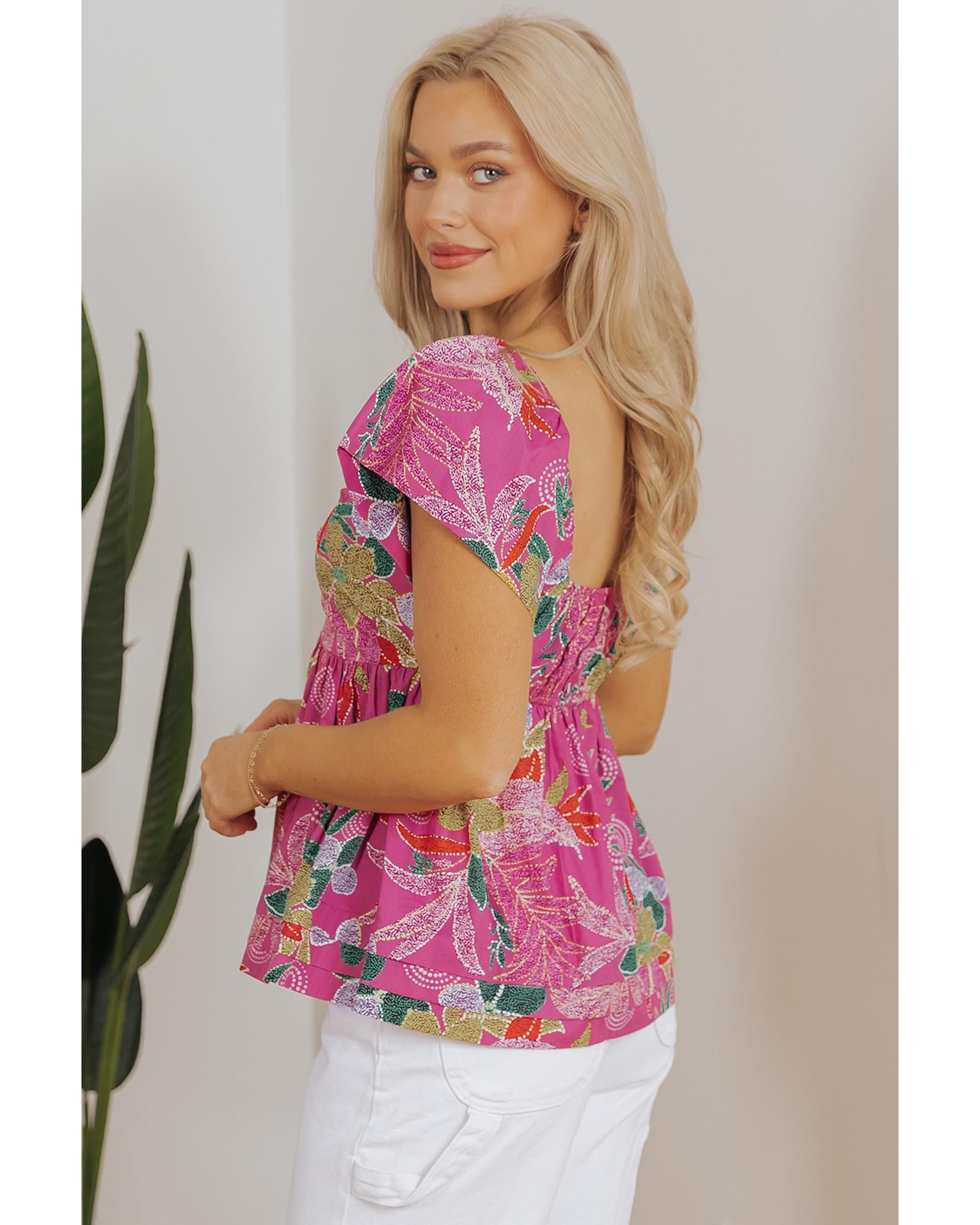 Purple Floral Print Sweetheart Neck Flutter Sleeve Blouse – M