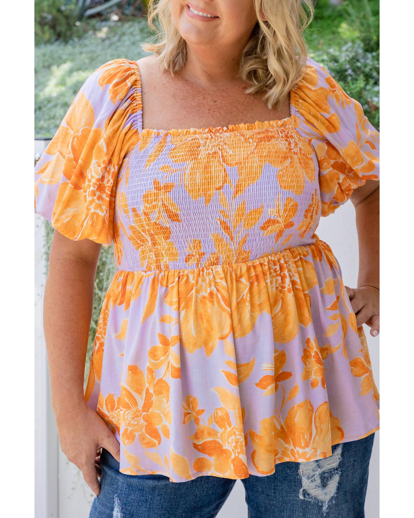 - Purple Floral Puff Sleeve Square Neck Smocked Plus Size Babydoll Blouse
