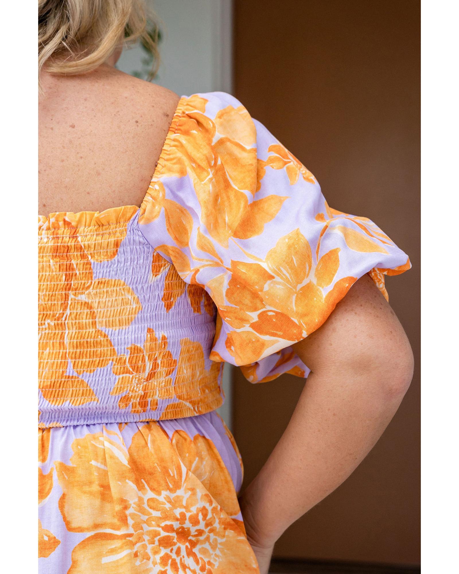 - Purple Floral Puff Sleeve Square Neck Smocked Plus Size Babydoll Blouse