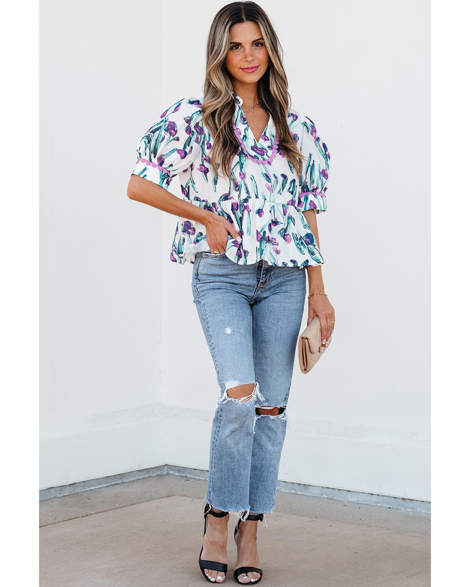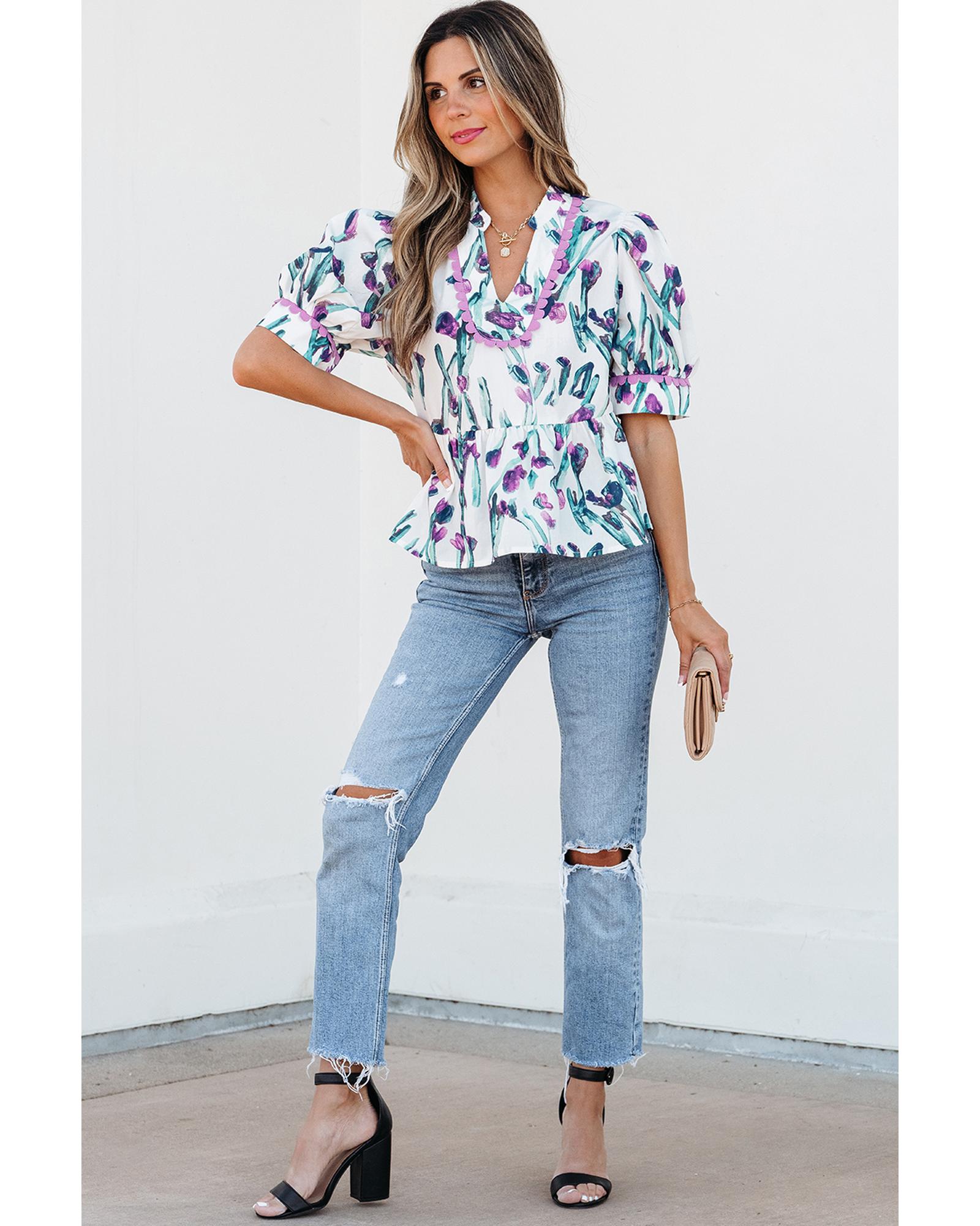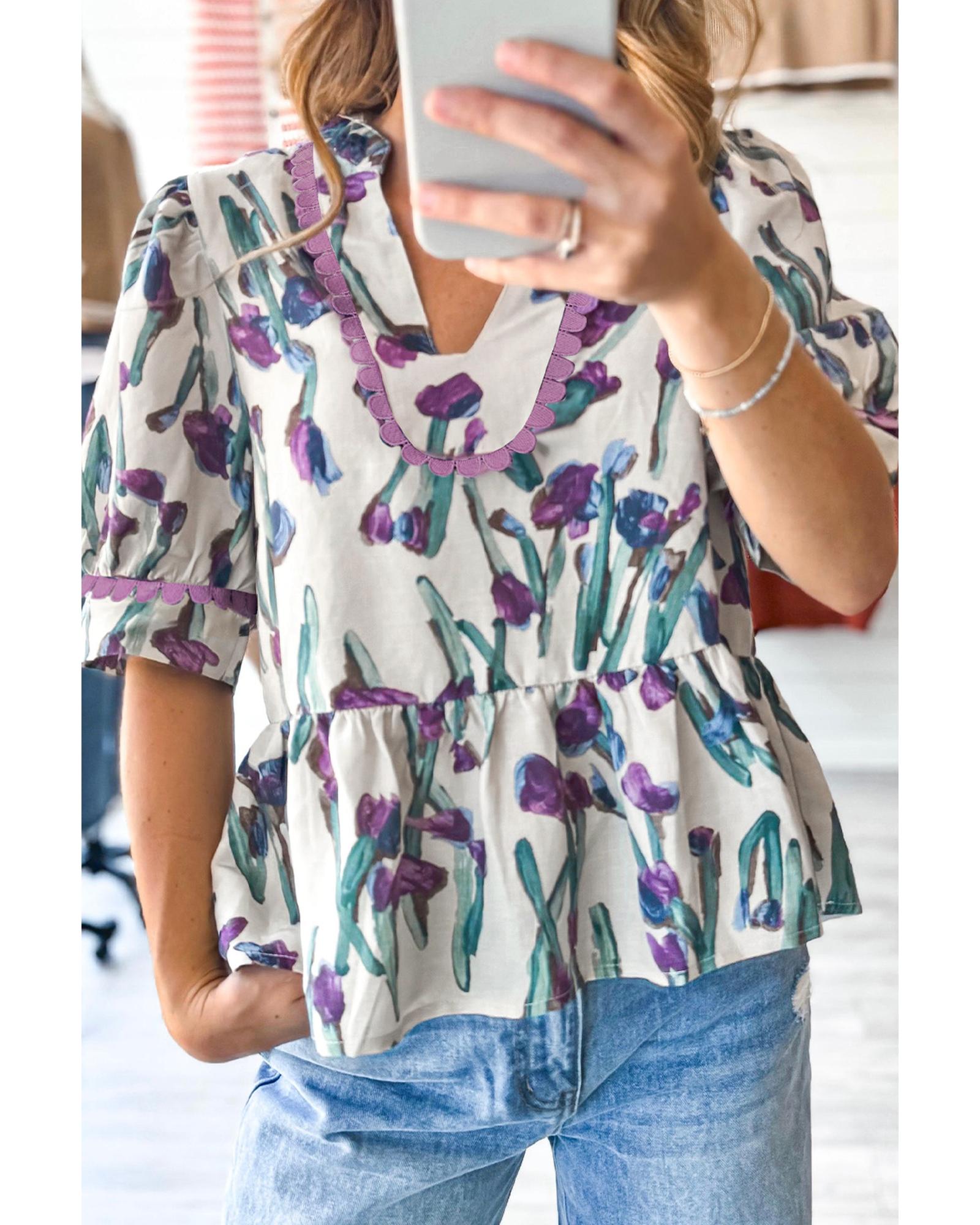 Purple Floral Ricrac Trim Half Sleeve Peplum Top – L