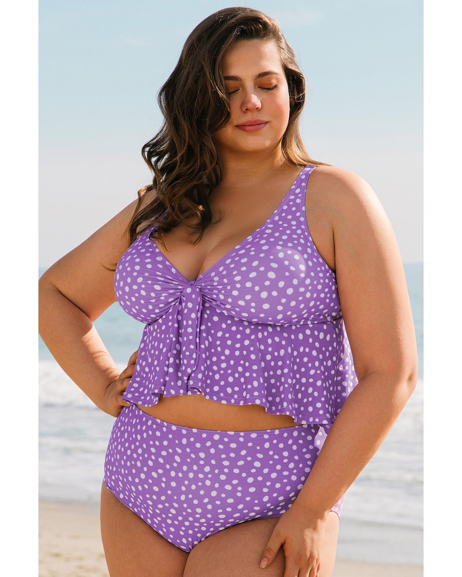 - Purple Plus Size Polka Dot Print Ruffled Knotted V Neck Tankini Set