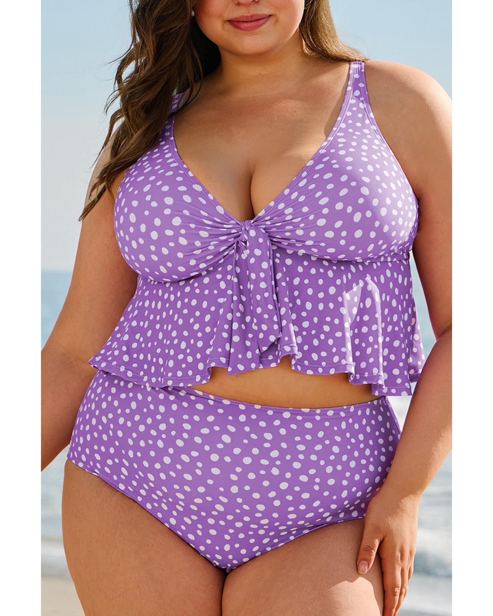 - Purple Plus Size Polka Dot Print Ruffled Knotted V Neck Tankini Set