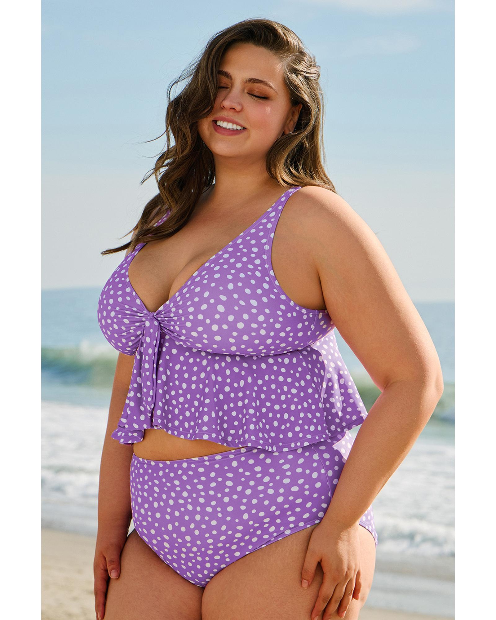 - Purple Plus Size Polka Dot Print Ruffled Knotted V Neck Tankini Set