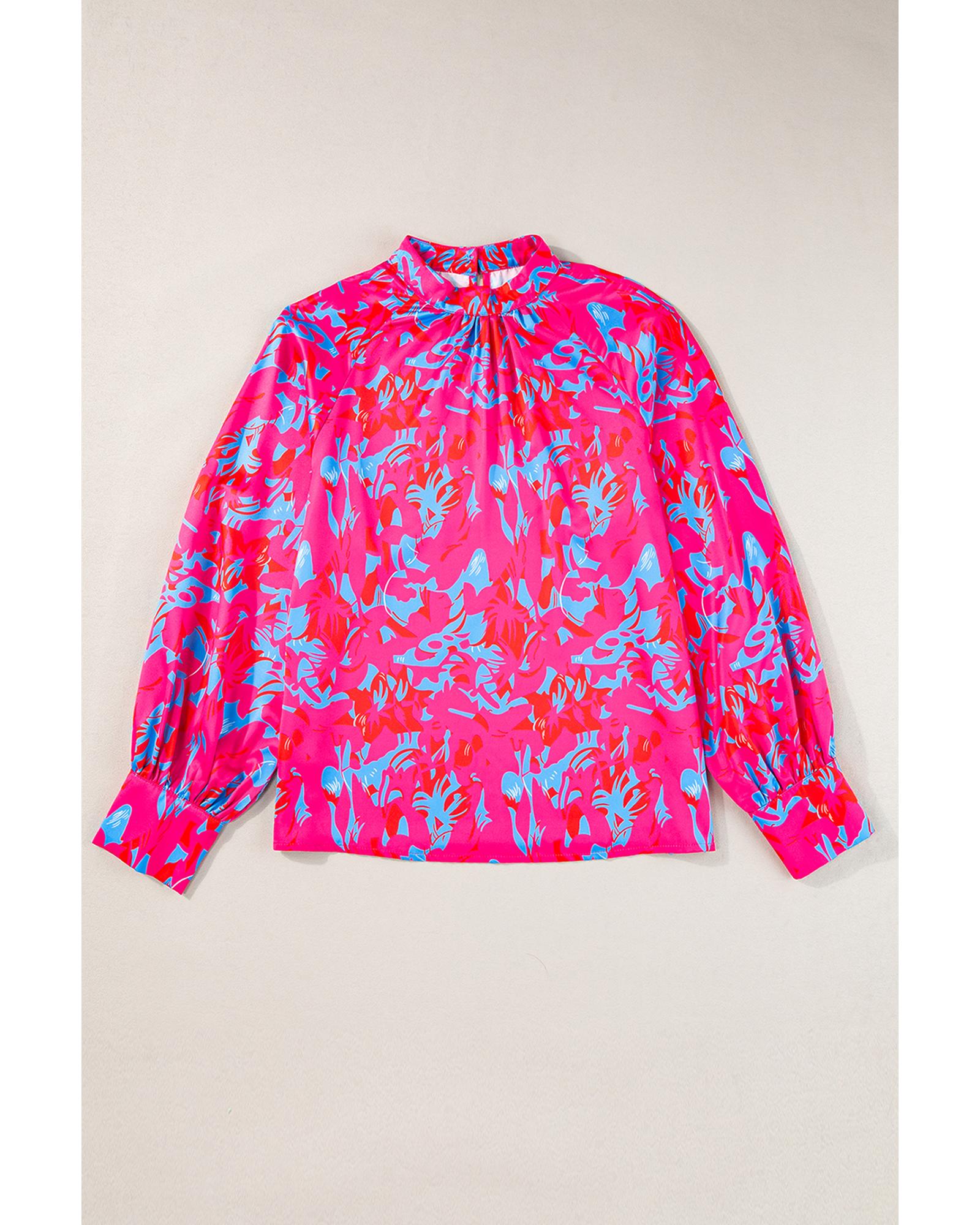 Purple Printed Bubble Sleeve Mock Neck Blouse – L