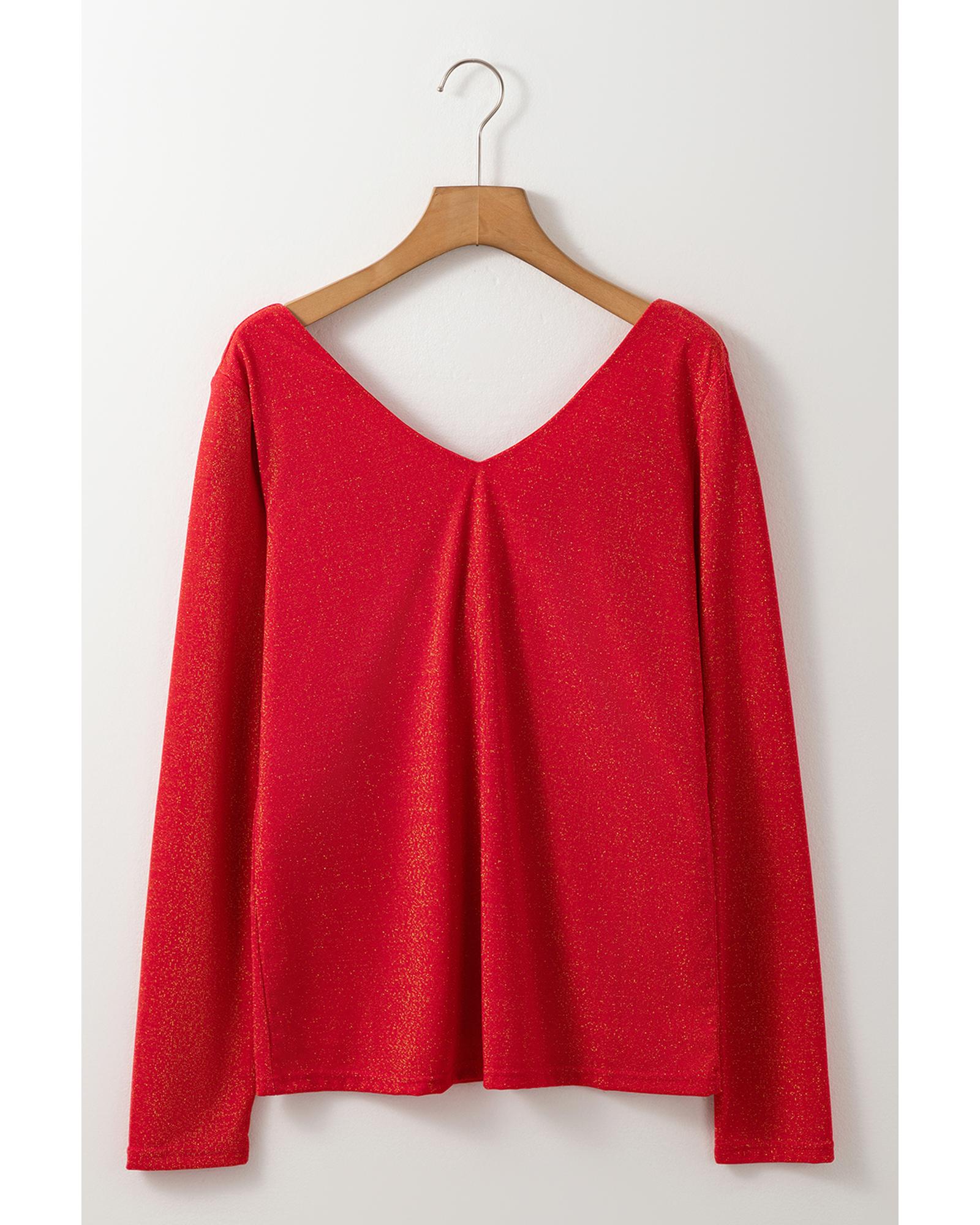 Racing Red Metallic Bowknot Open Back V Neck Top – L