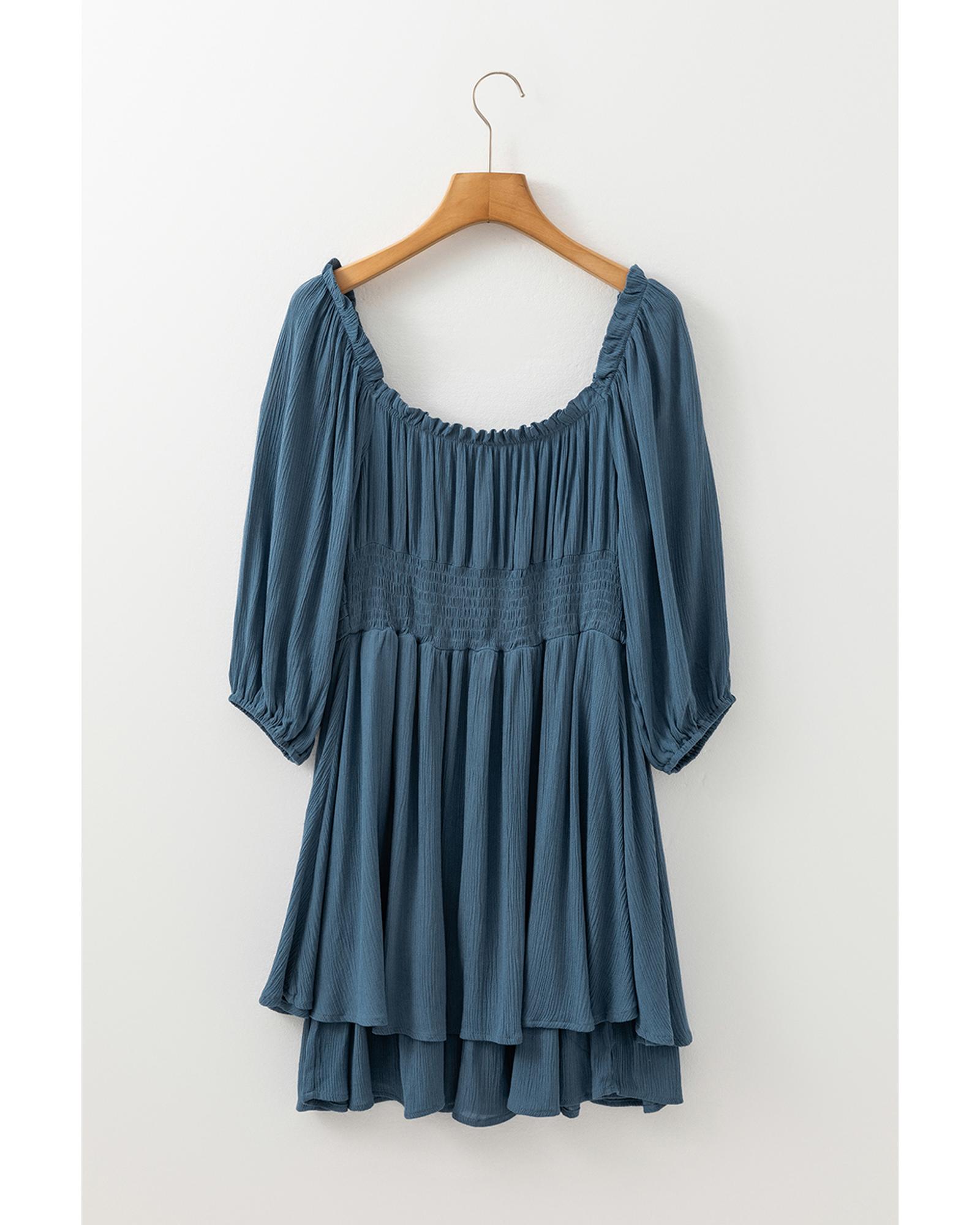 Real Teal Frilled Neckline 3/4 Sleeve Layered Ruched Mini Dress - M