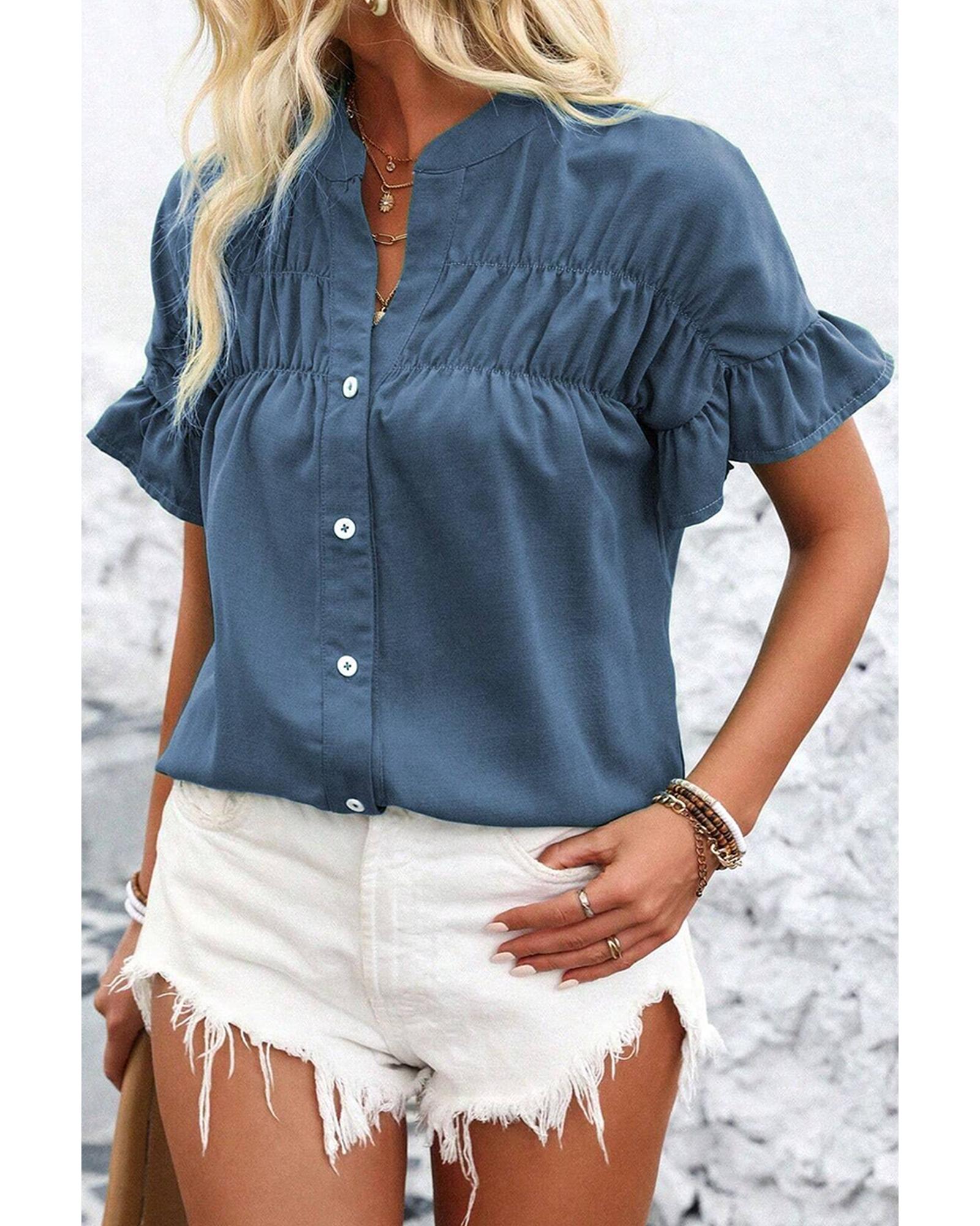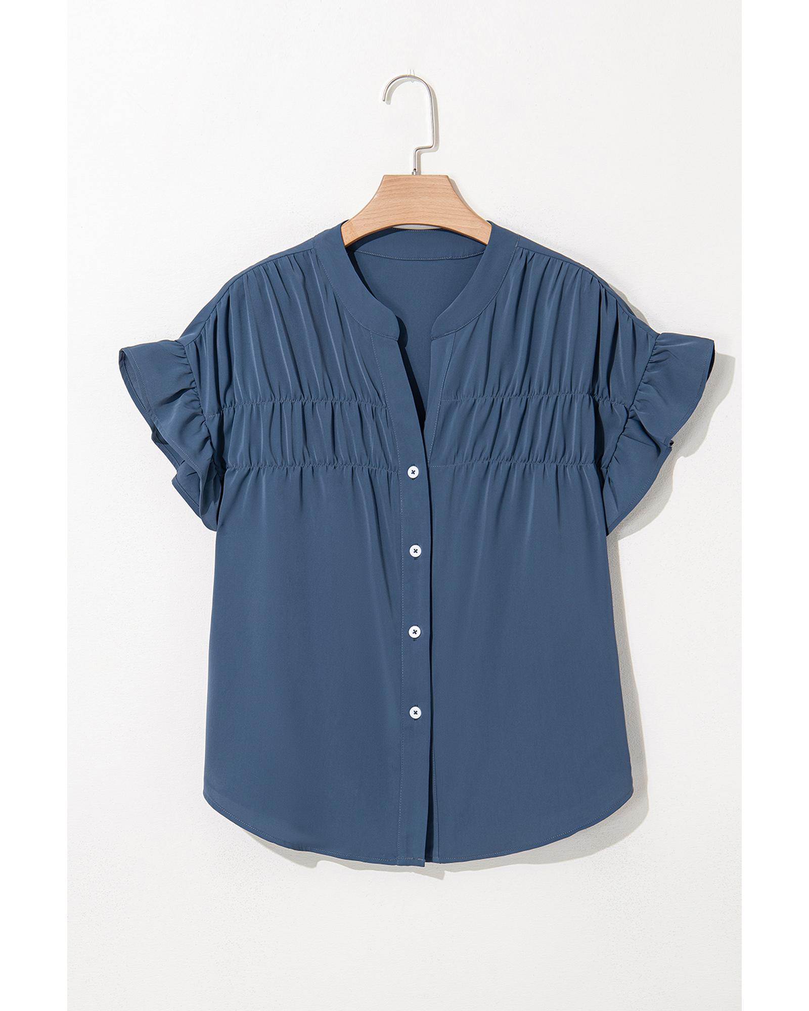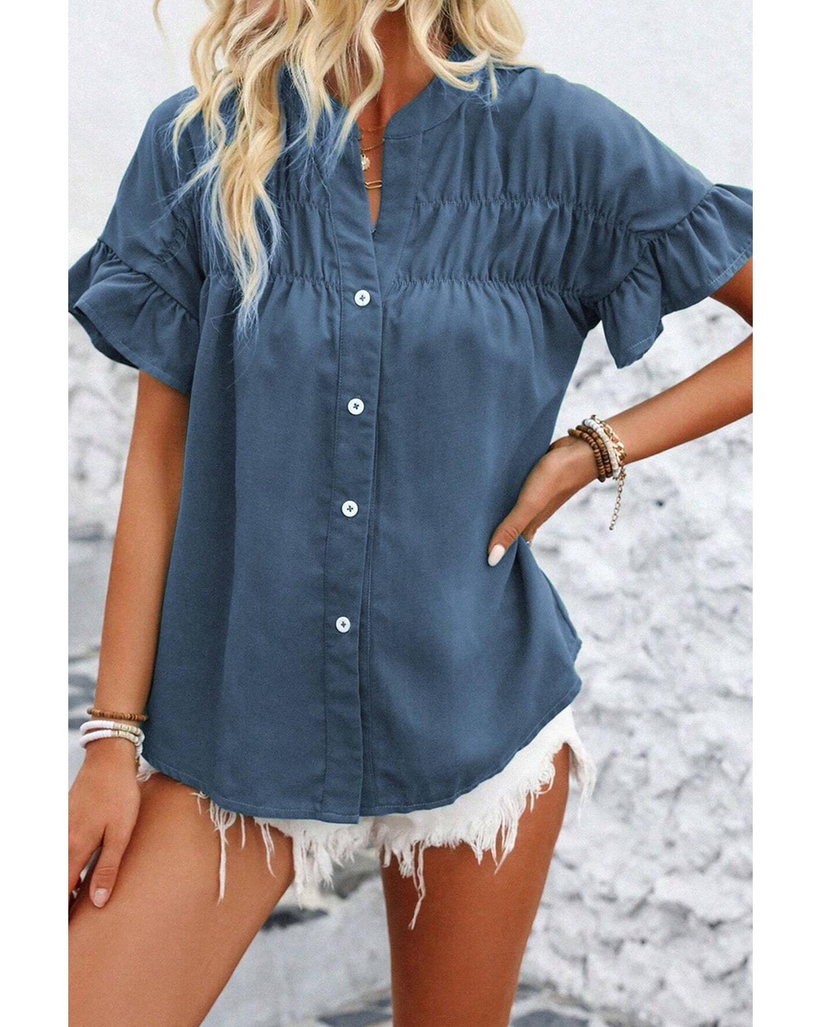 Real Teal Solid Color Ruffle Ruched Short Sleeve Buttoned Shirt – S