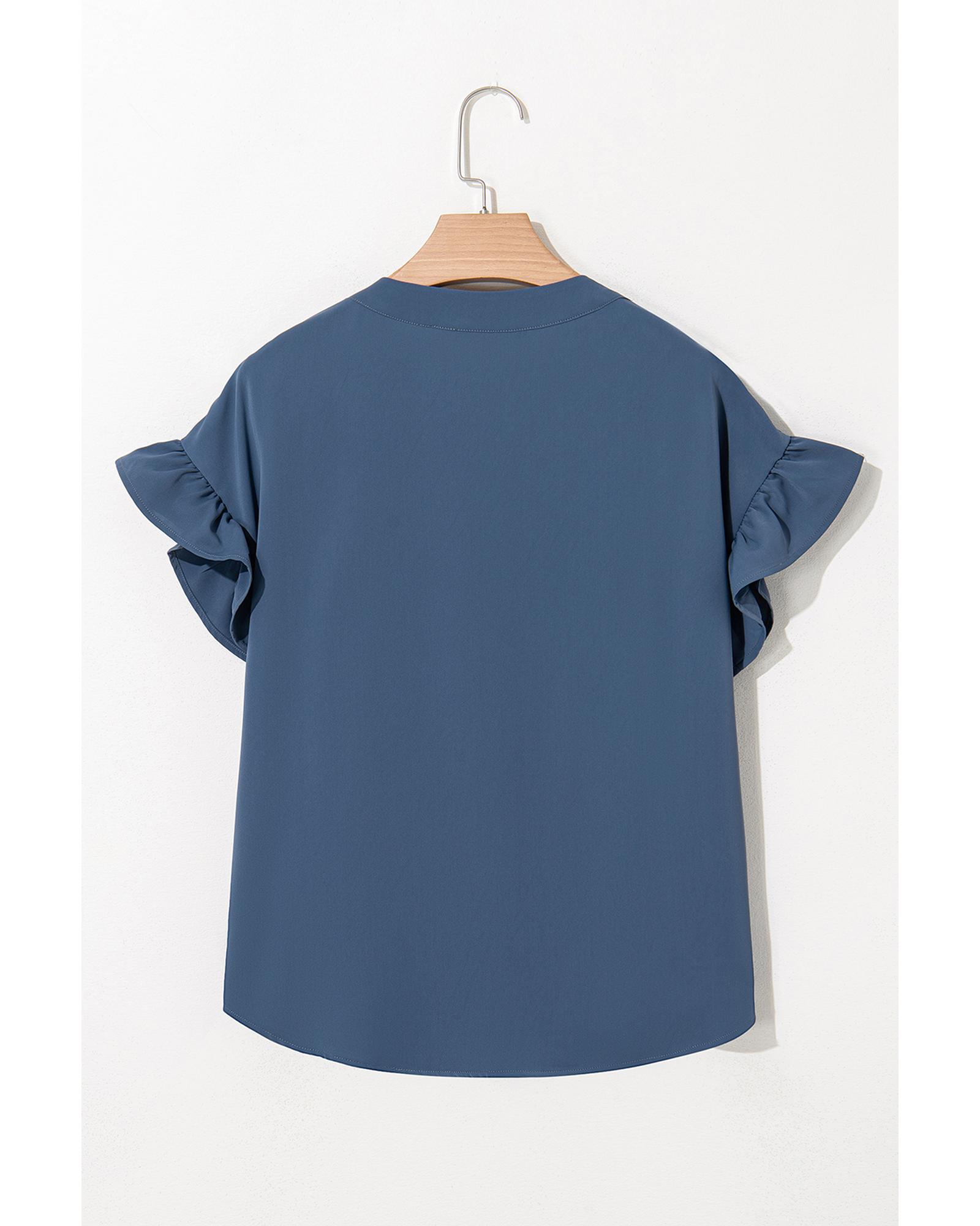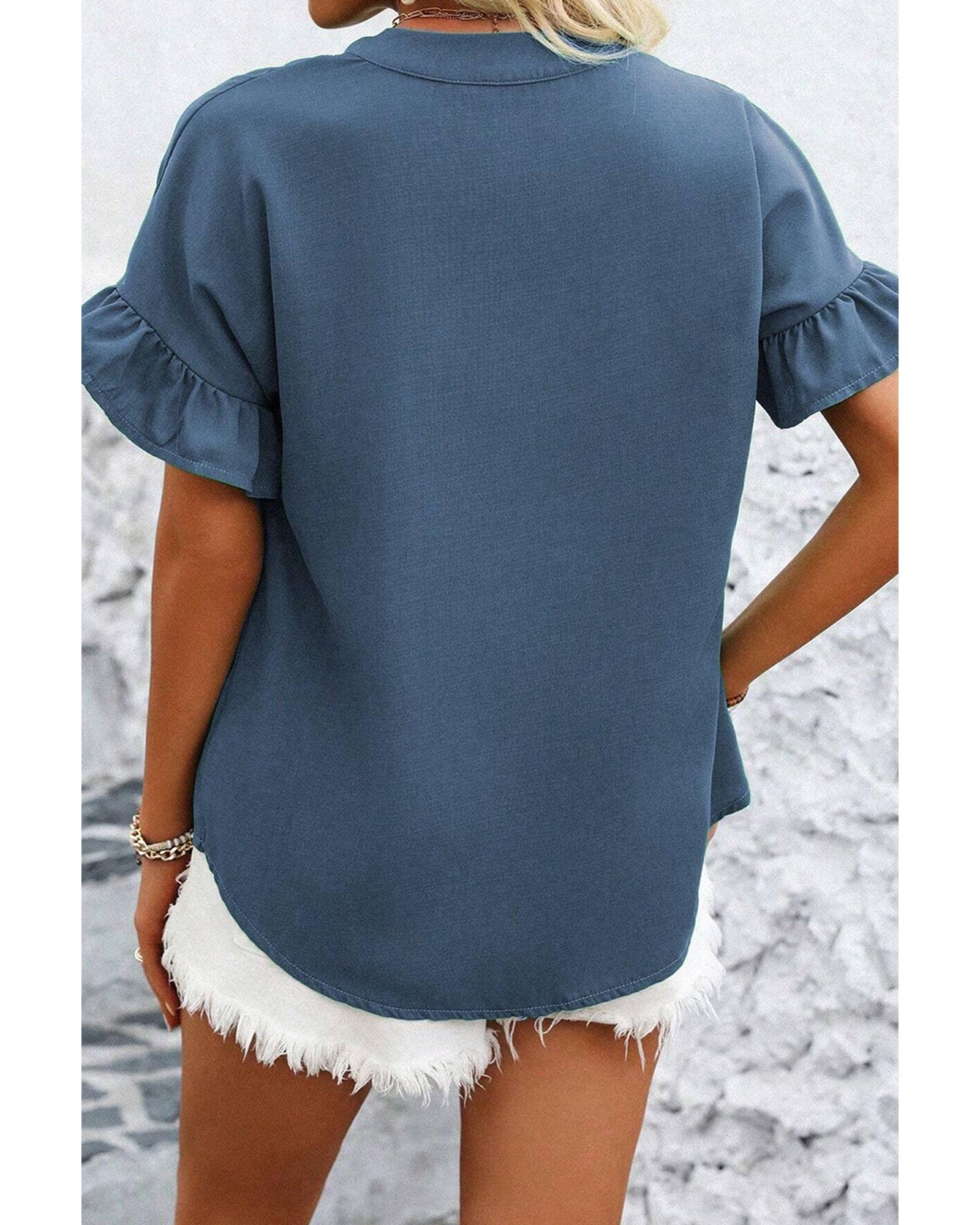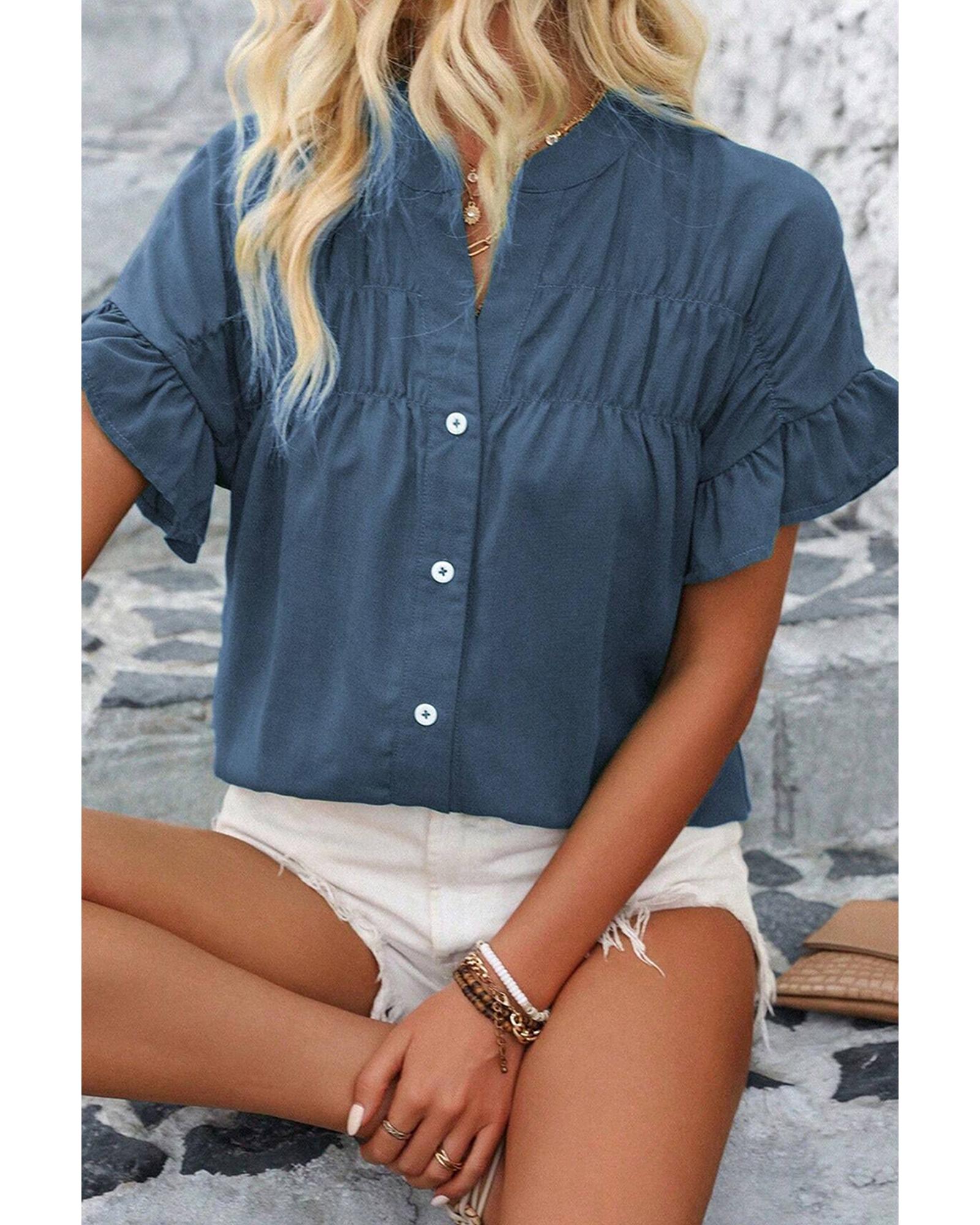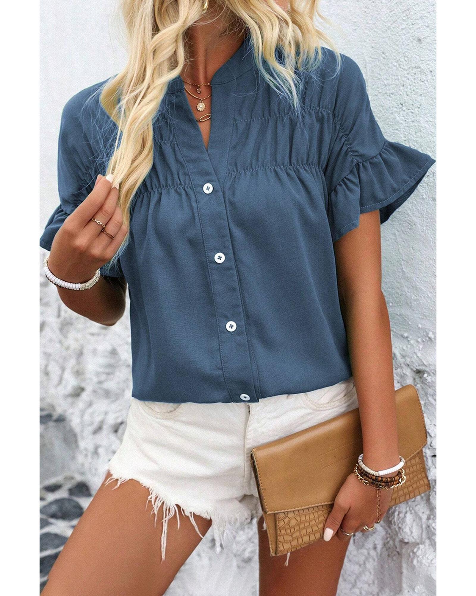 Real Teal Solid Color Ruffle Ruched Short Sleeve Buttoned Shirt – S