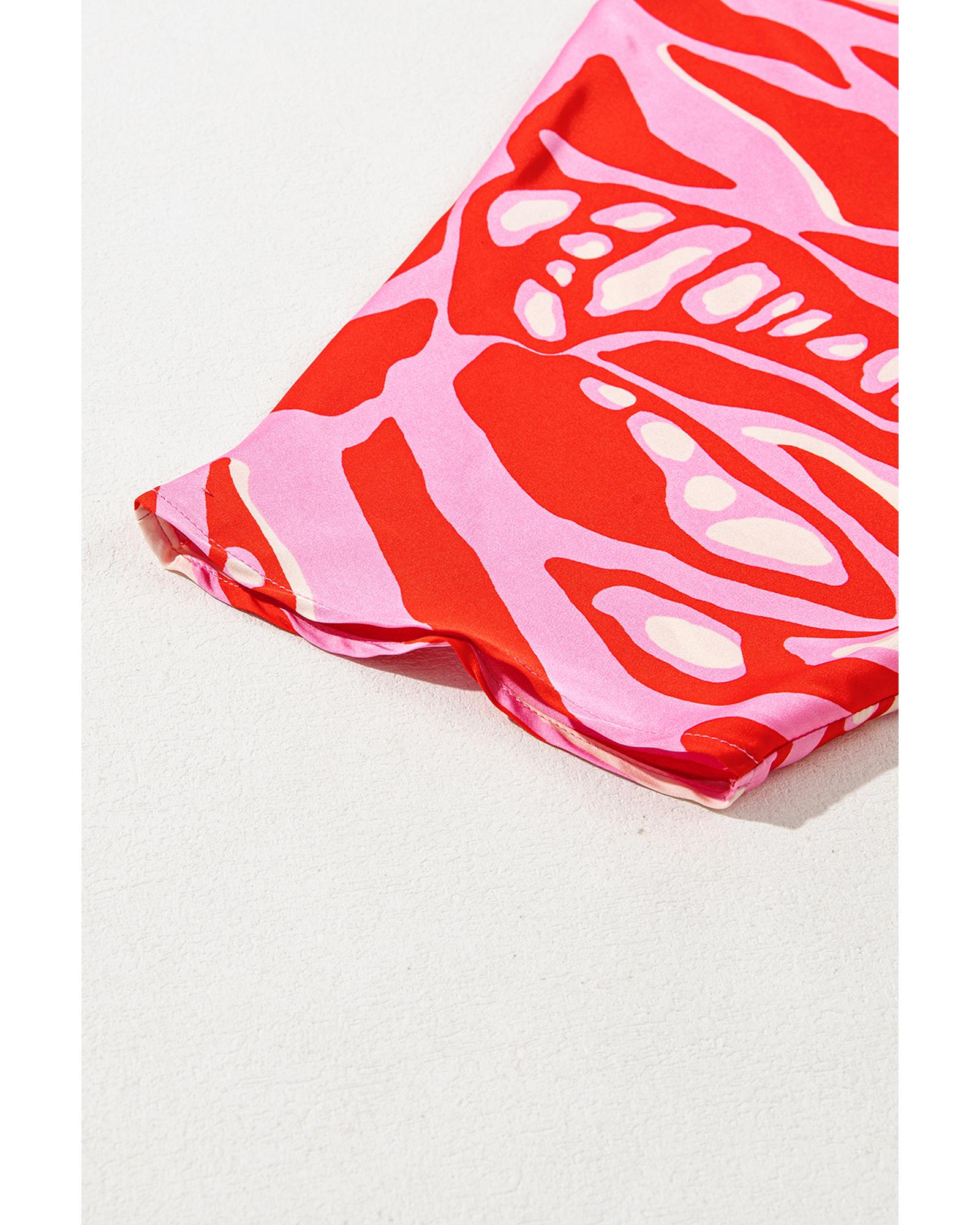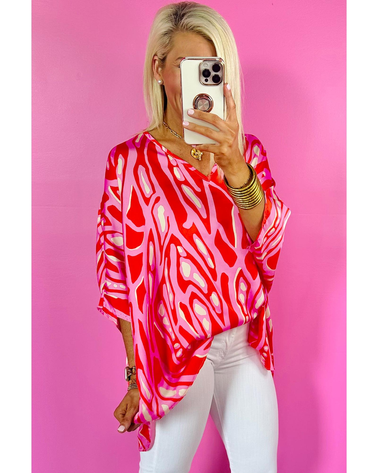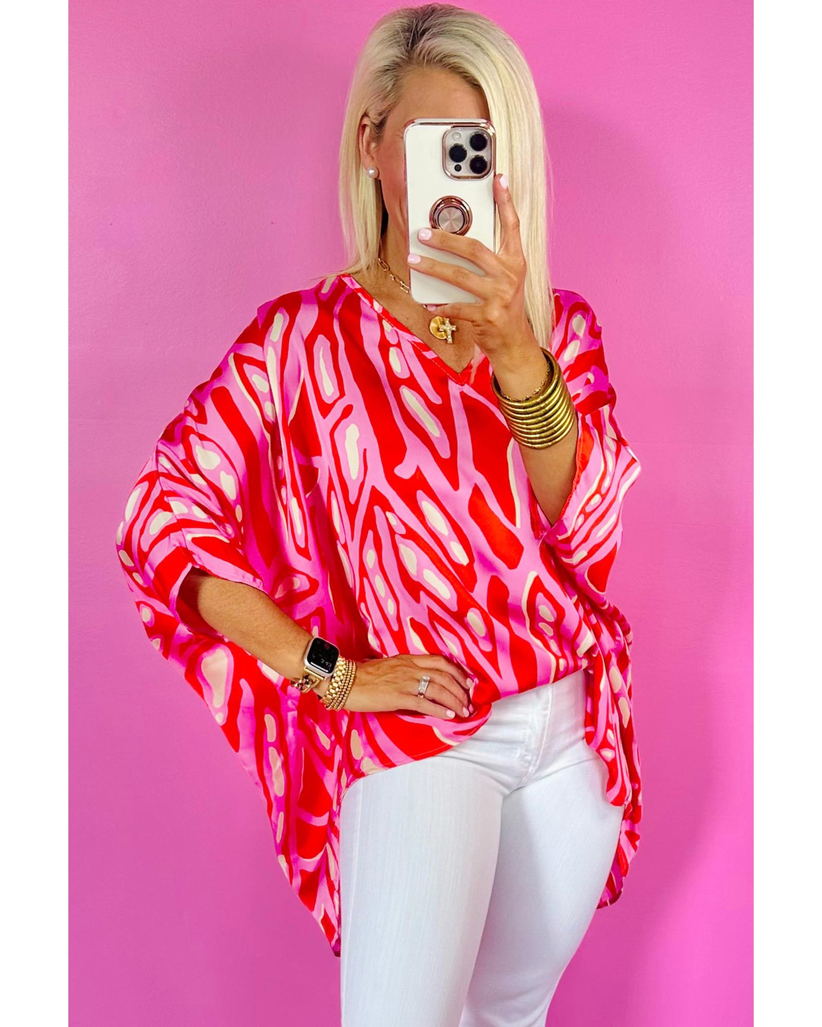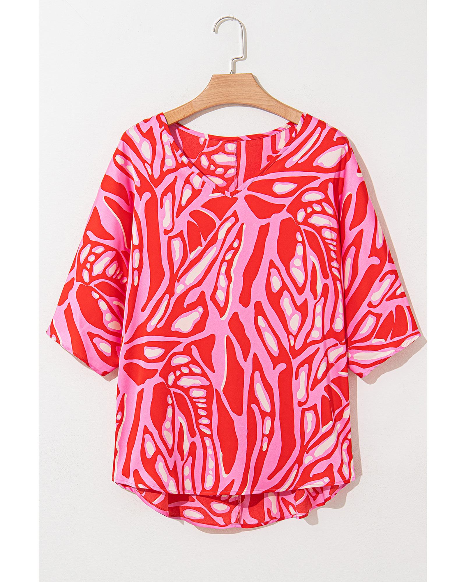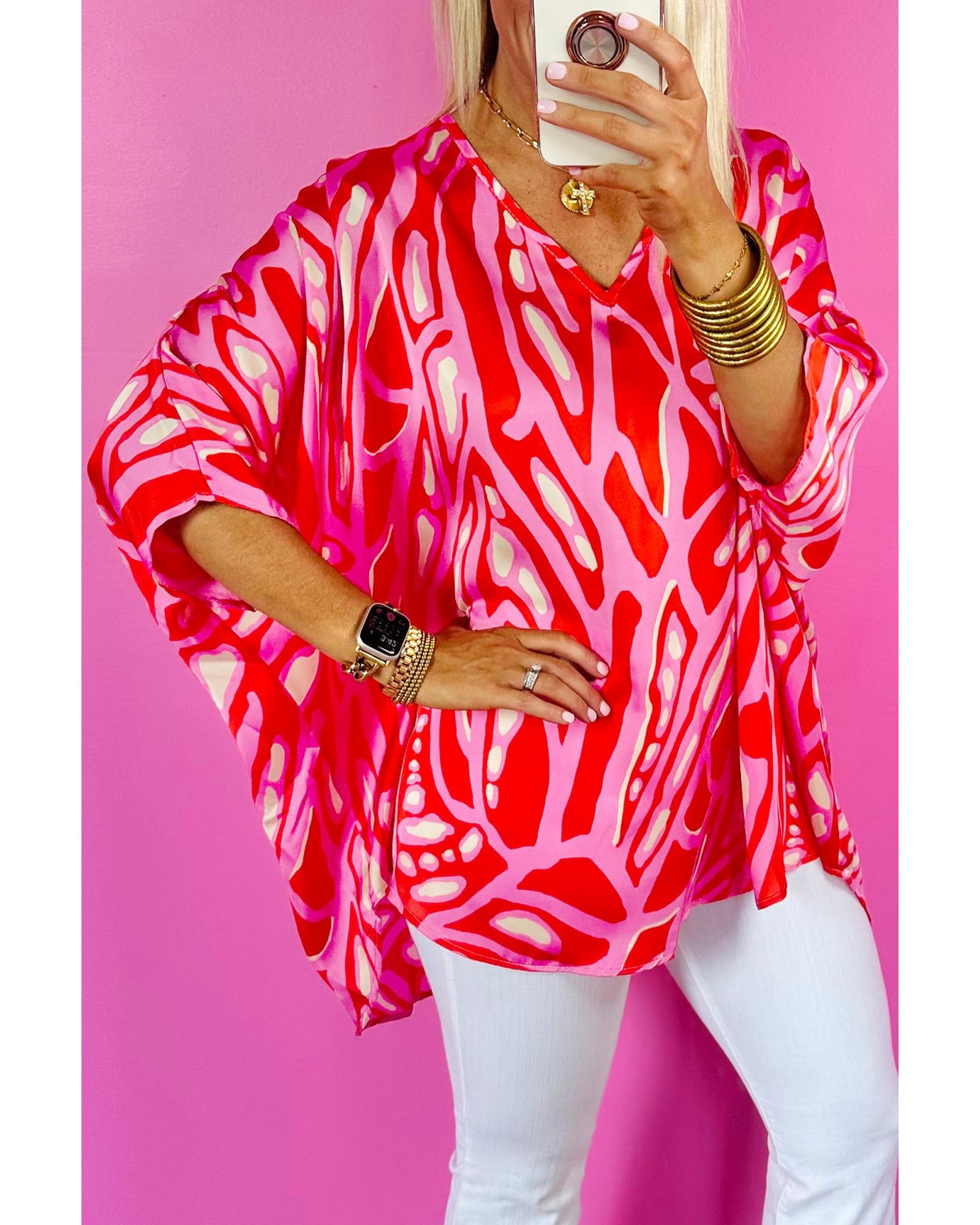 Red Abstract Print V Neck Batwing Sleeve Oversized Blouse – M