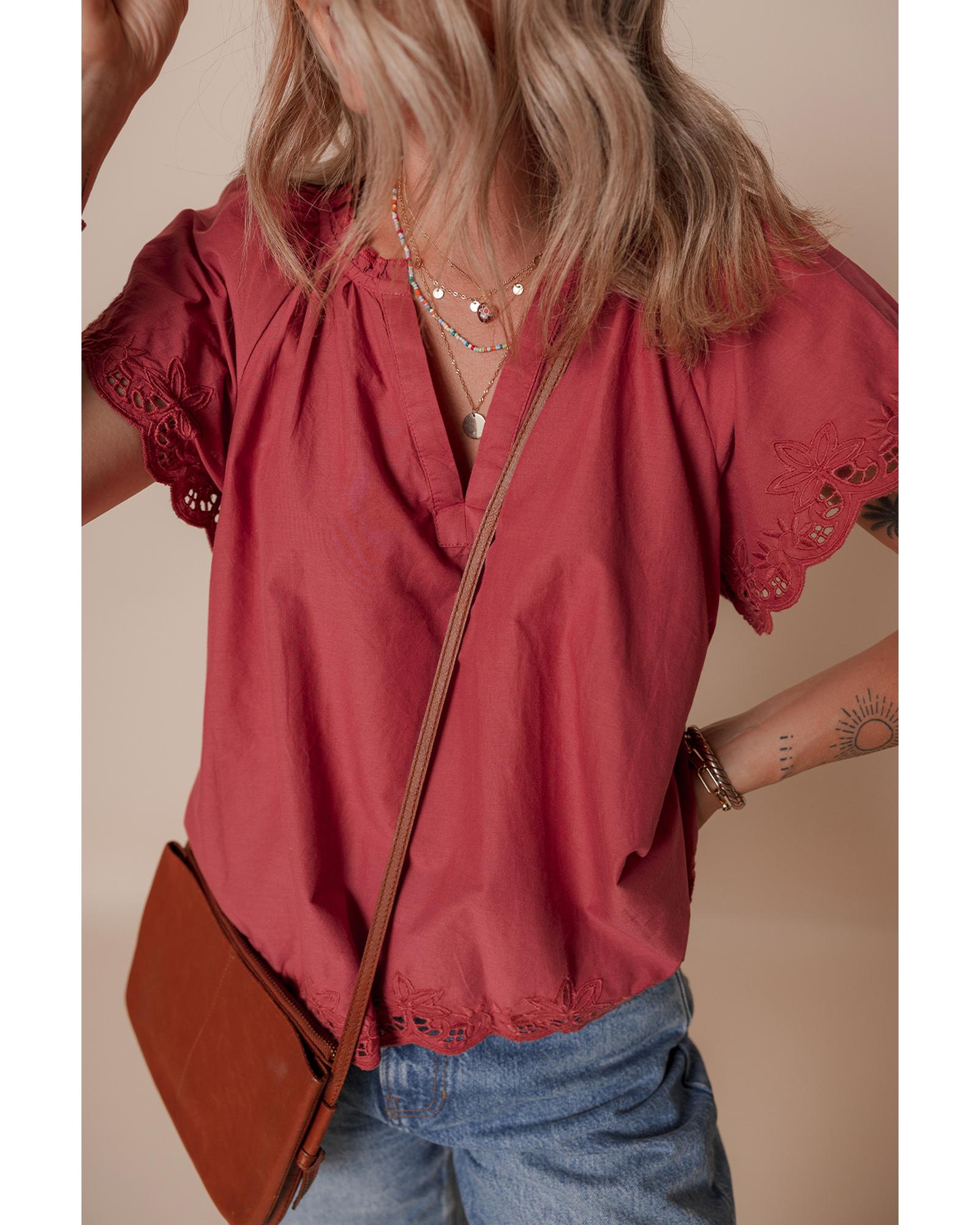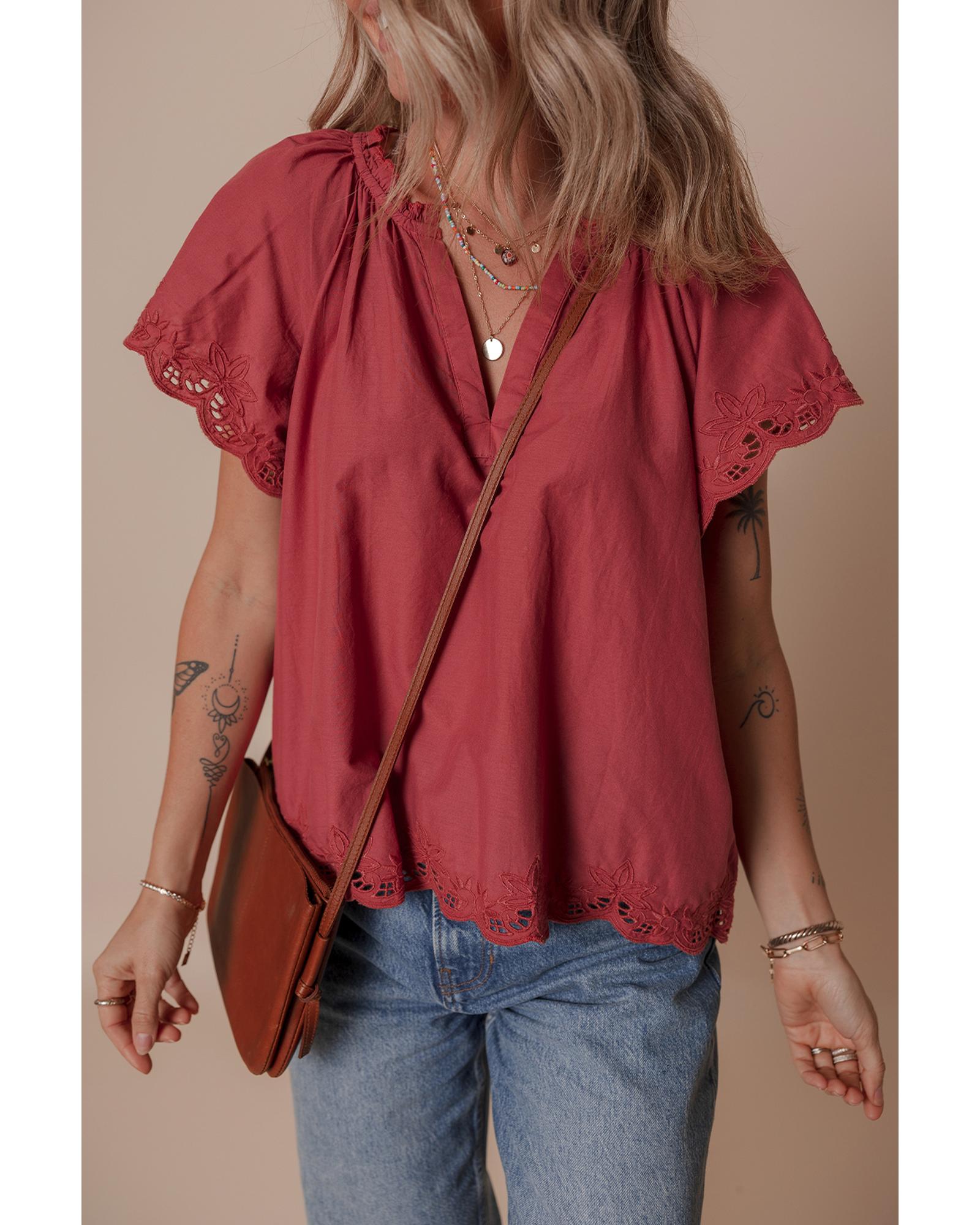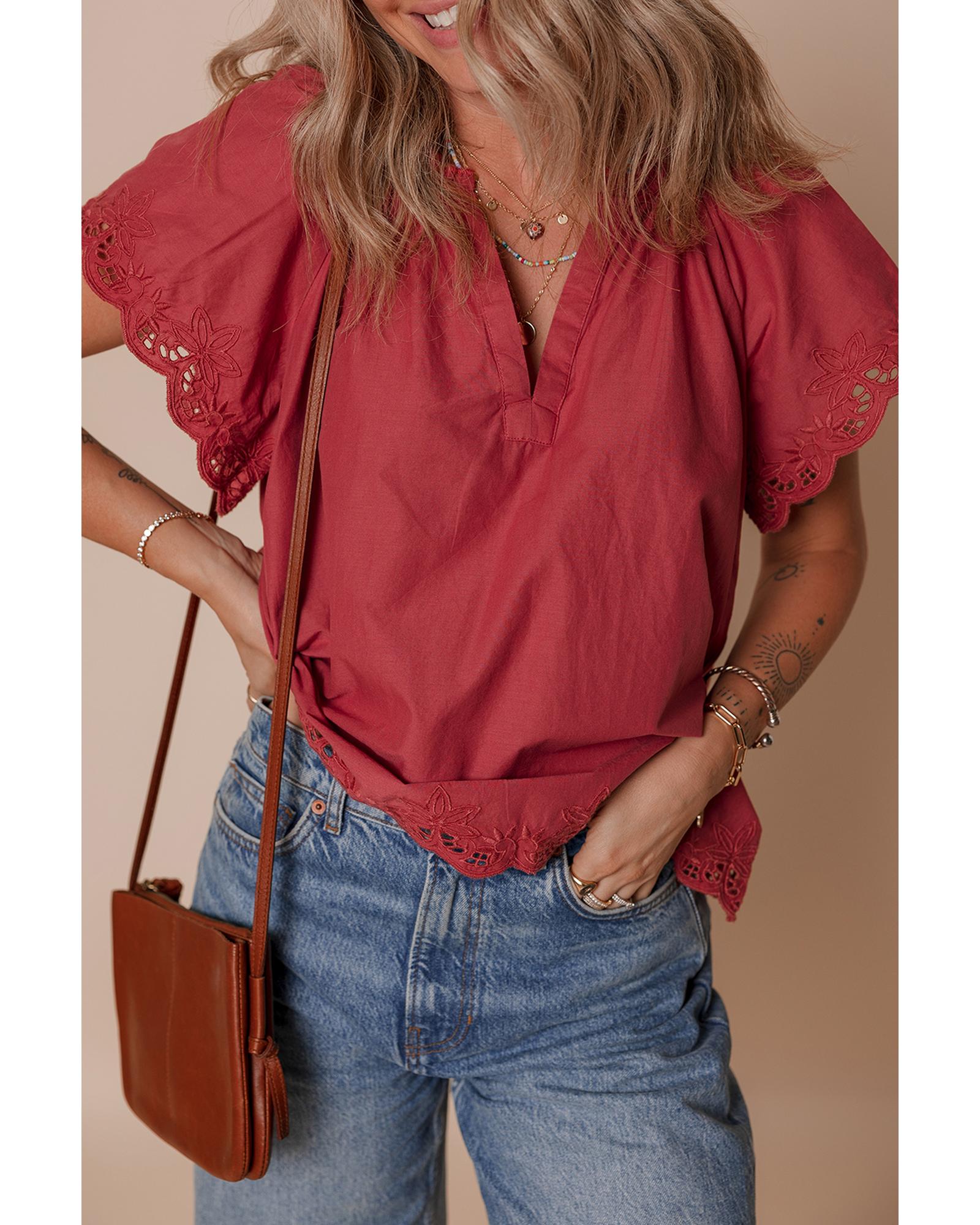 Red Dahlia Floral Embroidered Scallop Trim Short Sleeve V Neck Blouse – L