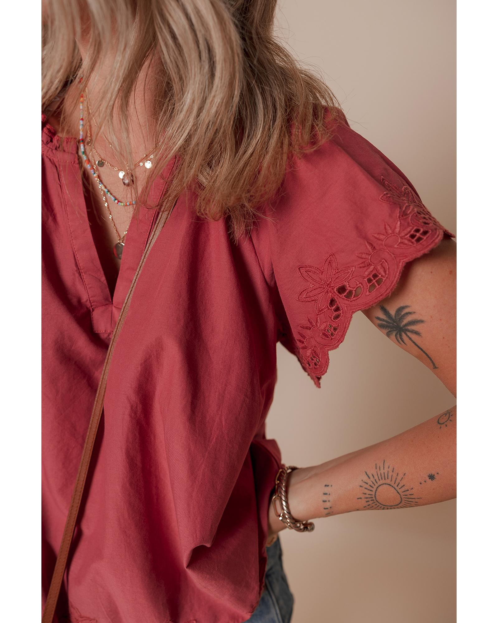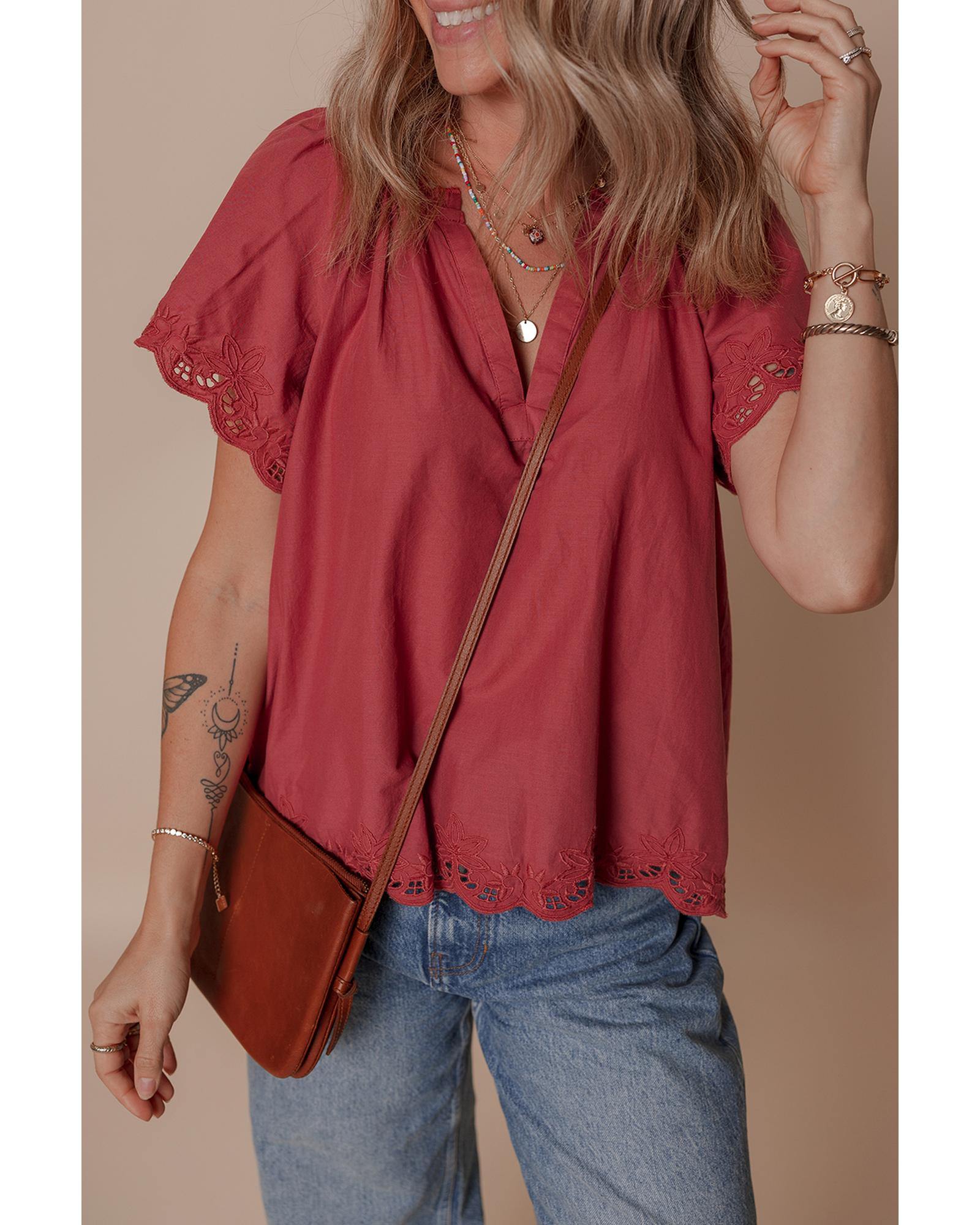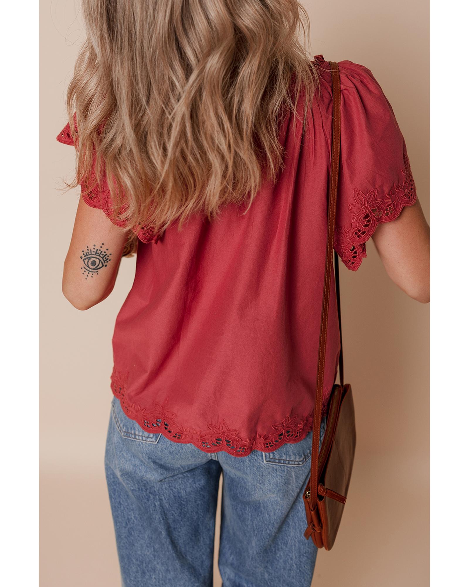 Red Dahlia Floral Embroidered Scallop Trim Short Sleeve V Neck Blouse – L