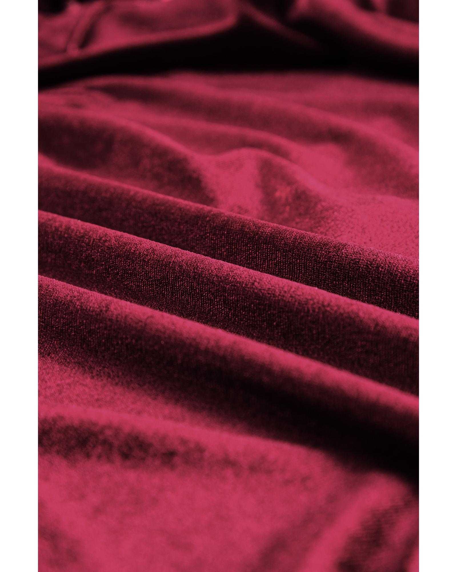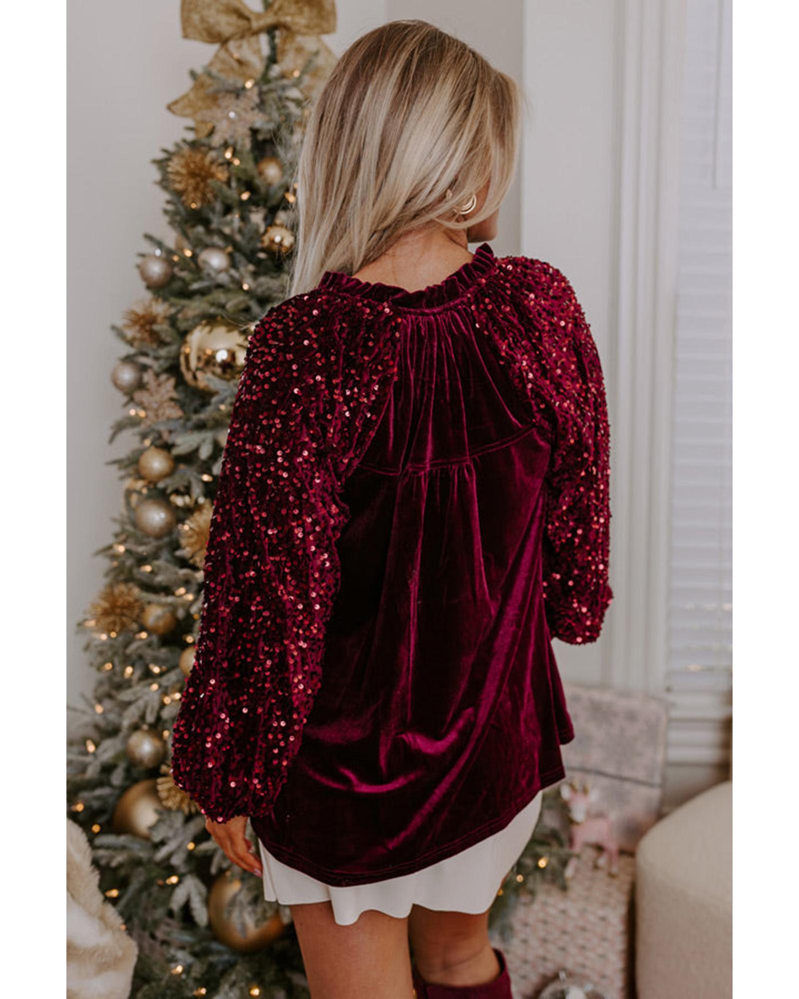 Red Dahlia Sequin Patchwork Sleeve Button Up Velvet Top – M