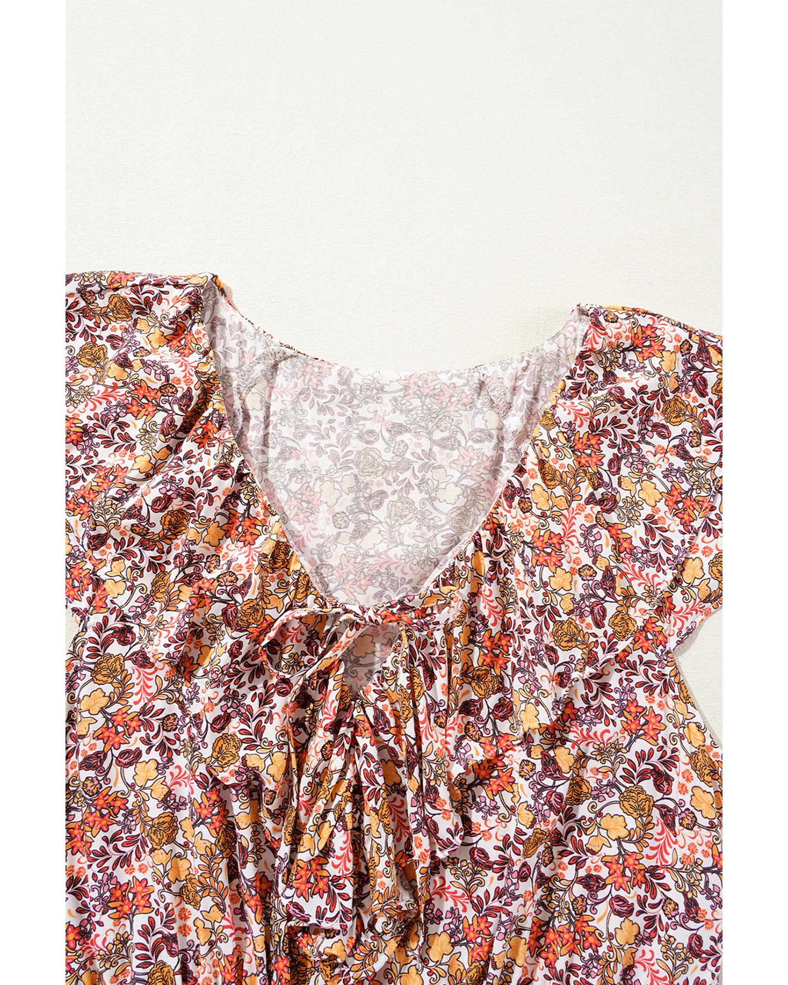 Red Floral Print Knot V Neck Ruffled Sleeve Blouse – XL
