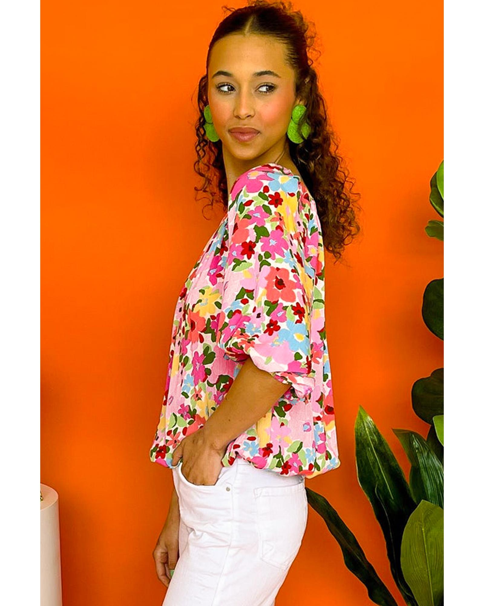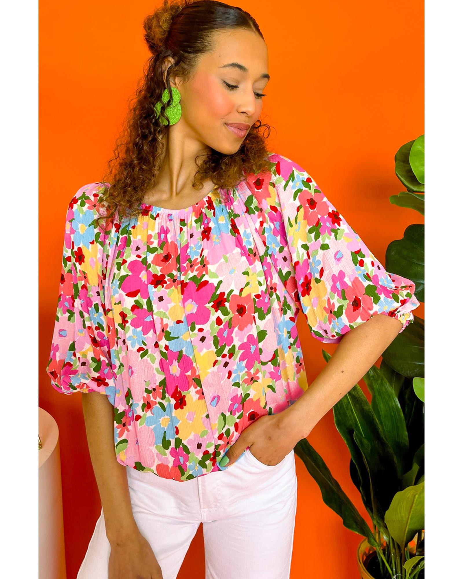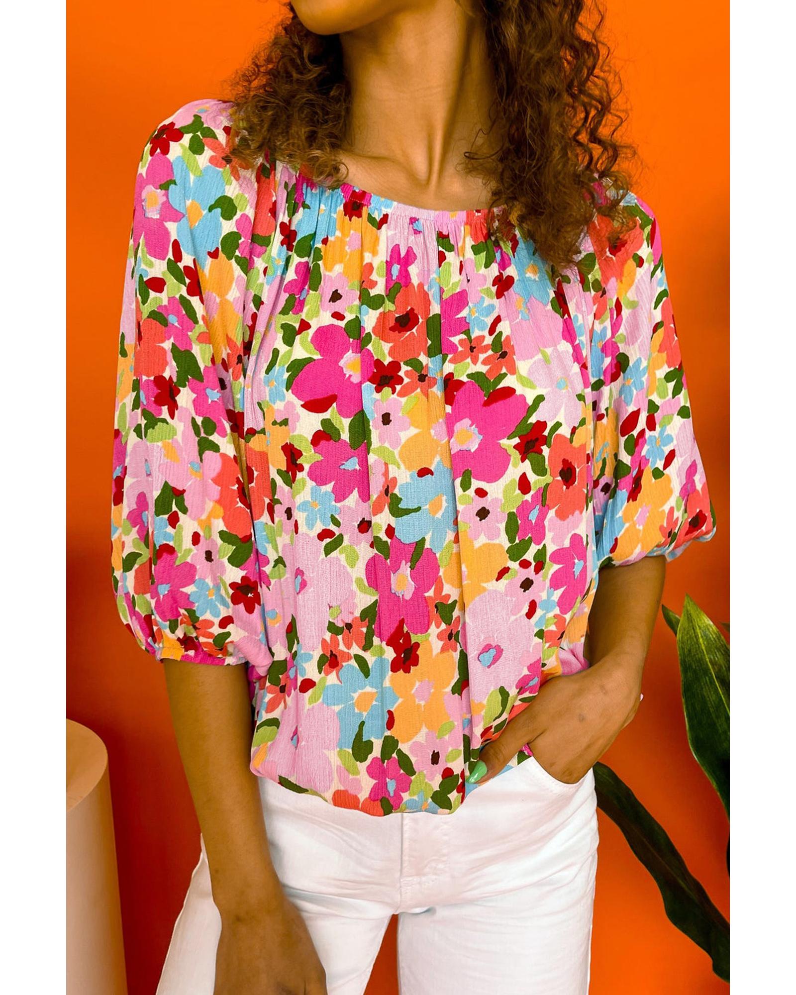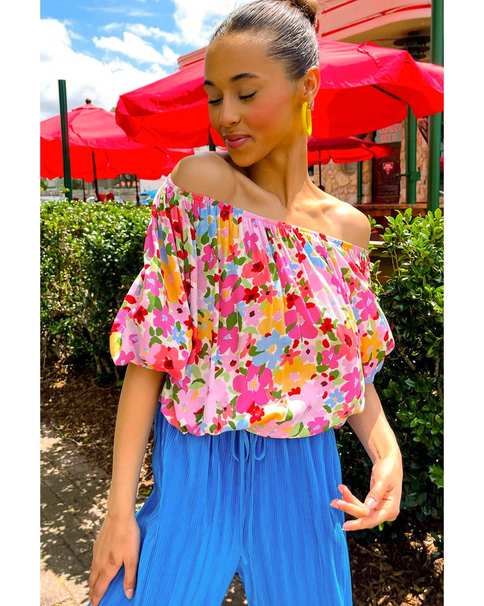 - Red Floral Print Puff Sleeve Pleated Elastic Neckline Blouse
